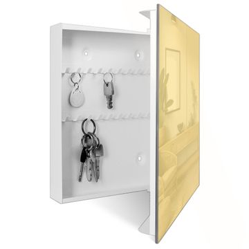Bringe Ordnung und Eleganz in deinen Eingangsbereich mit dem banjado Schlüsselkasten Motiv Farbe Honig. Die moderne Schlüsselbox kombiniert funktionales Design mit hochwertiger Verarbeitung und wird so zu einem echten Hingucker in Flur, Büro oder Ferienwohnung. ✅ Stilvolle Schlüsselaufbewahrung mit Glasfront im Motiv Farbe Honig Der Design-Schlüsselkasten Motiv Farbe Honig bietet Platz für bis zu 50 Schlüssel, die auf 5 stabilen Reihen mit je 10 Haken übersichtlich verstaut werden. Mit seinen kompakten Maßen von 30 x 30 x 5 cm passt die Schlüsselbox perfekt auch in kleinere Räume. Der weiß lackierte Stahlkorpus mit rechts angeschlagenem Türscharnier harmoniert mit der Glasfront und fügt sich nahtlos in jedes Wohnambiente ein. Ob als Schlüsselorganizer für Zuhause oder als praktische Lösung für Büros, Praxen und Gewerbe, der banjado Schlüsselkasten sorgt für Ordnung und Übersicht. Dank der magnetischen, mit Kreidestiften beschreibbaren Glasfront kannst du Notizen anheften oder Termine direkt auf der Oberfläche festhalten. Die Schlüsselbox Motiv Farbe Honig zur Wandmontage wird inklusive Befestigungsmaterial geliefert und ist schnell angebracht. So hast du deine Schlüssel jederzeit griffbereit und zugleich stilvoll verstaut. Mit diesem banjado Schlüsselkasten Motiv Farbe Honig kombinierst du praktische Aufbewahrung mit stilvollem Wohndesign. Ob privat oder geschäftlich, die Schlüsselbox sorgt für mehr Ordnung, Übersicht und ein wohnliches Ambiente.Vorteile im Überblick