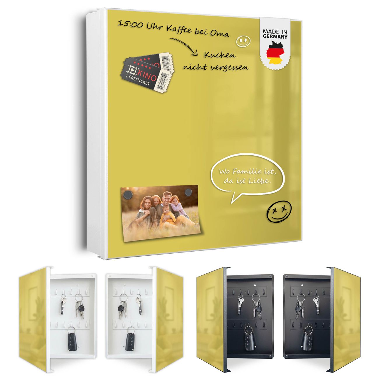 Bringe Ordnung und Eleganz in deinen Eingangsbereich mit dem banjado Schlüsselkasten Motiv Farbe Lemon. Die moderne Schlüsselbox kombiniert funktionales Design mit hochwertiger Verarbeitung und wird so zu einem echten Hingucker in Flur, Büro oder Ferienwohnung. ✅ Stilvolle Schlüsselaufbewahrung mit Motiv Farbe Lemon Der Design-Schlüsselkasten Motiv Farbe Lemon bietet Platz für bis zu 32 Schlüssel, die auf 4 stabilen Reihen mit je 8 Haken übersichtlich verstaut werden. Mit seinen kompakten Maßen von 30 x 30 x 5 cm passt die Schlüsselbox perfekt auch in kleinere Räume. Der weiß lackierte Stahlkorpus mit links angeschlagenem Türscharnier harmoniert mit gedruckten Folie auf der Front und fügt sich nahtlos in jedes Wohnambiente ein. Ob als Schlüsselorganizer für Zuhause oder als praktische Lösung für Büros, Praxen und Gewerbe, der banjado Schlüsselkasten sorgt für Ordnung und Übersicht. Dank der magnetischen, mit Kreidestiften beschreibbaren Folie auf der Front kannst du Notizen anheften oder Termine direkt auf der Oberfläche festhalten. Die Schlüsselbox Motiv Farbe Lemon zur Wandmontage wird inklusive Befestigungsmaterial geliefert und ist schnell angebracht. So hast du deine Schlüssel jederzeit griffbereit und zugleich stilvoll verstaut. Mit diesem banjado Schlüsselkasten Motiv Farbe Lemon kombinierst du praktische Aufbewahrung mit stilvollem Wohndesign. Ob privat oder geschäftlich, die Schlüsselbox sorgt für mehr Ordnung, Übersicht und ein wohnliches Ambiente.Vorteile im Überblick