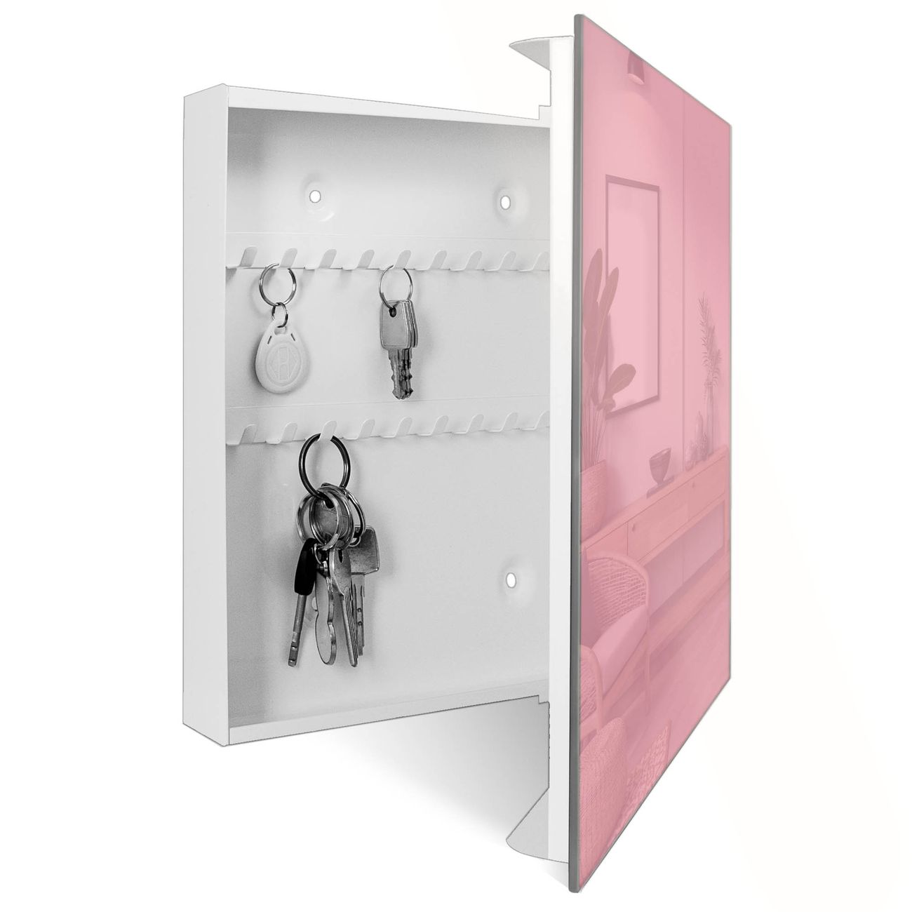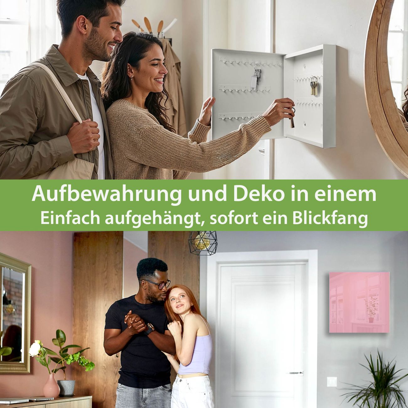 Bringe Ordnung und Eleganz in deinen Eingangsbereich mit dem banjado Schlüsselkasten Motiv Farbe Malve. Die moderne Schlüsselbox kombiniert funktionales Design mit hochwertiger Verarbeitung und wird so zu einem echten Hingucker in Flur, Büro oder Ferienwohnung. ✅ Stilvolle Schlüsselaufbewahrung mit Glasfront im Motiv Farbe Malve Der Design-Schlüsselkasten Motiv Farbe Malve bietet Platz für bis zu 50 Schlüssel, die auf 5 stabilen Reihen mit je 10 Haken übersichtlich verstaut werden. Mit seinen kompakten Maßen von 30 x 30 x 5 cm passt die Schlüsselbox perfekt auch in kleinere Räume. Der weiß lackierte Stahlkorpus mit rechts angeschlagenem Türscharnier harmoniert mit der Glasfront und fügt sich nahtlos in jedes Wohnambiente ein. Ob als Schlüsselorganizer für Zuhause oder als praktische Lösung für Büros, Praxen und Gewerbe, der banjado Schlüsselkasten sorgt für Ordnung und Übersicht. Dank der magnetischen, mit Kreidestiften beschreibbaren Glasfront kannst du Notizen anheften oder Termine direkt auf der Oberfläche festhalten. Die Schlüsselbox Motiv Farbe Malve zur Wandmontage wird inklusive Befestigungsmaterial geliefert und ist schnell angebracht. So hast du deine Schlüssel jederzeit griffbereit und zugleich stilvoll verstaut. Mit diesem banjado Schlüsselkasten Motiv Farbe Malve kombinierst du praktische Aufbewahrung mit stilvollem Wohndesign. Ob privat oder geschäftlich, die Schlüsselbox sorgt für mehr Ordnung, Übersicht und ein wohnliches Ambiente.Vorteile im Überblick