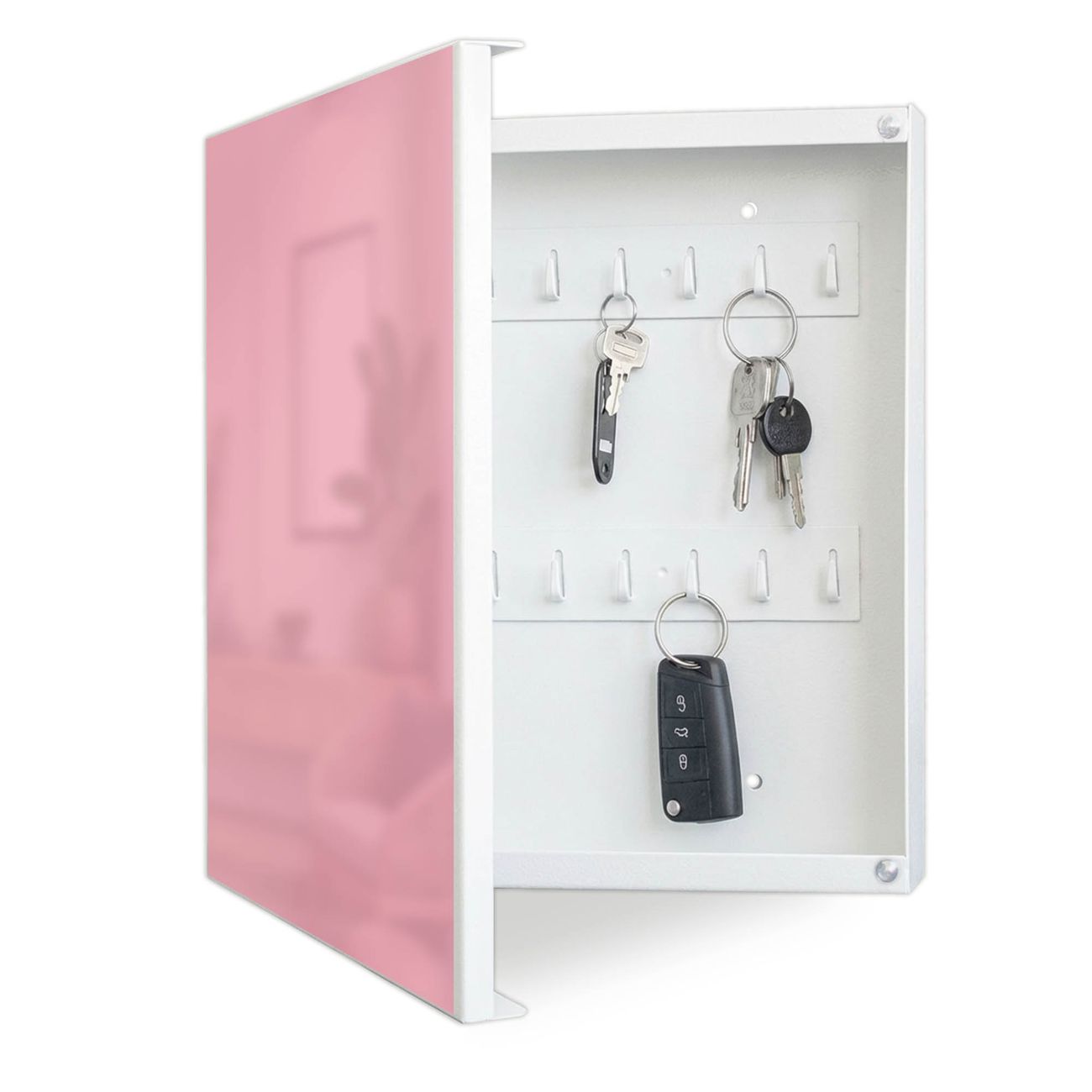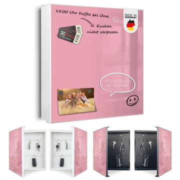 Bringe Ordnung und Eleganz in deinen Eingangsbereich mit dem banjado Schlüsselkasten Motiv Farbe Malve. Die moderne Schlüsselbox kombiniert funktionales Design mit hochwertiger Verarbeitung und wird so zu einem echten Hingucker in Flur, Büro oder Ferienwohnung. ✅ Stilvolle Schlüsselaufbewahrung mit Motiv Farbe Malve Der Design-Schlüsselkasten Motiv Farbe Malve bietet Platz für bis zu 32 Schlüssel, die auf 4 stabilen Reihen mit je 8 Haken übersichtlich verstaut werden. Mit seinen kompakten Maßen von 30 x 30 x 5 cm passt die Schlüsselbox perfekt auch in kleinere Räume. Der weiß lackierte Stahlkorpus mit links angeschlagenem Türscharnier harmoniert mit gedruckten Folie auf der Front und fügt sich nahtlos in jedes Wohnambiente ein. Ob als Schlüsselorganizer für Zuhause oder als praktische Lösung für Büros, Praxen und Gewerbe, der banjado Schlüsselkasten sorgt für Ordnung und Übersicht. Dank der magnetischen, mit Kreidestiften beschreibbaren Folie auf der Front kannst du Notizen anheften oder Termine direkt auf der Oberfläche festhalten. Die Schlüsselbox Motiv Farbe Malve zur Wandmontage wird inklusive Befestigungsmaterial geliefert und ist schnell angebracht. So hast du deine Schlüssel jederzeit griffbereit und zugleich stilvoll verstaut. Mit diesem banjado Schlüsselkasten Motiv Farbe Malve kombinierst du praktische Aufbewahrung mit stilvollem Wohndesign. Ob privat oder geschäftlich, die Schlüsselbox sorgt für mehr Ordnung, Übersicht und ein wohnliches Ambiente.Vorteile im Überblick