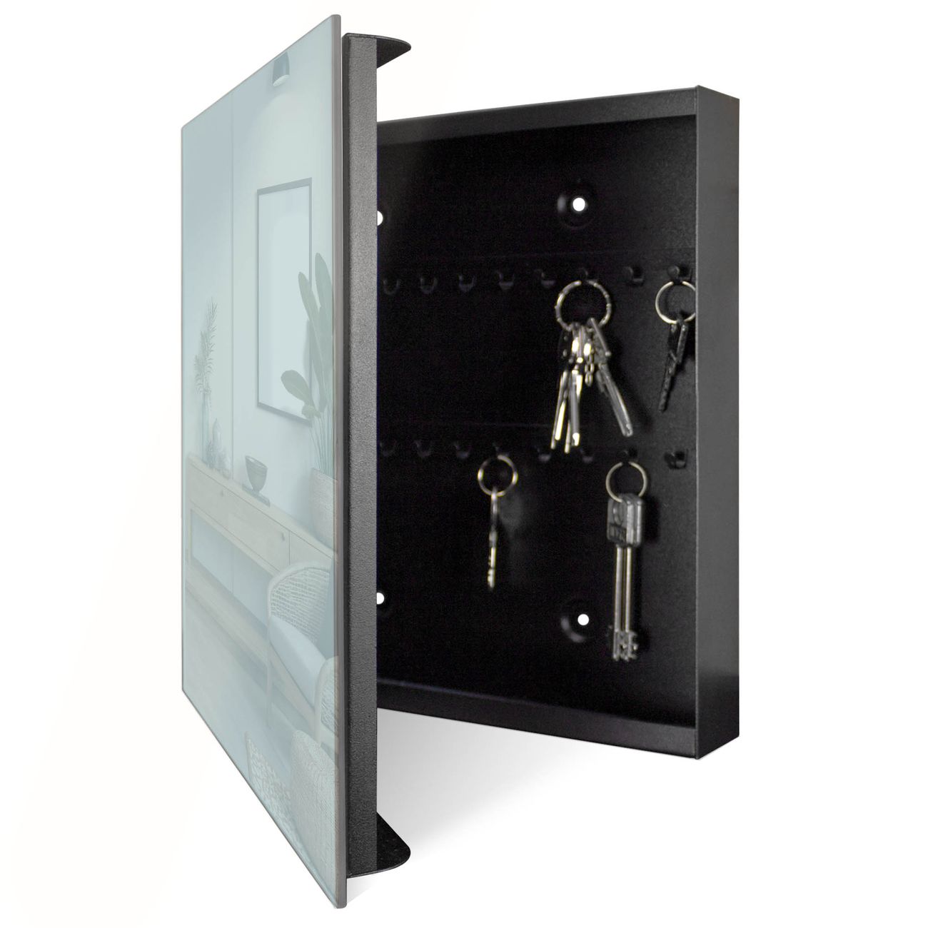 Bringe Ordnung und Eleganz in deinen Eingangsbereich mit dem banjado Schlüsselkasten Motiv Farbe Meeresgrün. Die moderne Schlüsselbox kombiniert funktionales Design mit hochwertiger Verarbeitung und wird so zu einem echten Hingucker in Flur, Büro oder Ferienwohnung. ✅ Stilvolle Schlüsselaufbewahrung mit Glasfront im Motiv Farbe Meeresgrün Der Design-Schlüsselkasten Motiv Farbe Meeresgrün bietet Platz für bis zu 50 Schlüssel, die auf 5 stabilen Reihen mit je 10 Haken übersichtlich verstaut werden. Mit seinen kompakten Maßen von 30 x 30 x 5 cm passt die Schlüsselbox perfekt auch in kleinere Räume. Der schwarz lackierte Stahlkorpus mit rechts angeschlagenem Türscharnier harmoniert mit der Glasfront und fügt sich nahtlos in jedes Wohnambiente ein. Ob als Schlüsselorganizer für Zuhause oder als praktische Lösung für Büros, Praxen und Gewerbe, der banjado Schlüsselkasten sorgt für Ordnung und Übersicht. Dank der magnetischen, mit Kreidestiften beschreibbaren Glasfront kannst du Notizen anheften oder Termine direkt auf der Oberfläche festhalten. Die Schlüsselbox Motiv Farbe Meeresgrün zur Wandmontage wird inklusive Befestigungsmaterial geliefert und ist schnell angebracht. So hast du deine Schlüssel jederzeit griffbereit und zugleich stilvoll verstaut. Mit diesem banjado Schlüsselkasten Motiv Farbe Meeresgrün kombinierst du praktische Aufbewahrung mit stilvollem Wohndesign. Ob privat oder geschäftlich, die Schlüsselbox sorgt für mehr Ordnung, Übersicht und ein wohnliches Ambiente.Vorteile im Überblick
