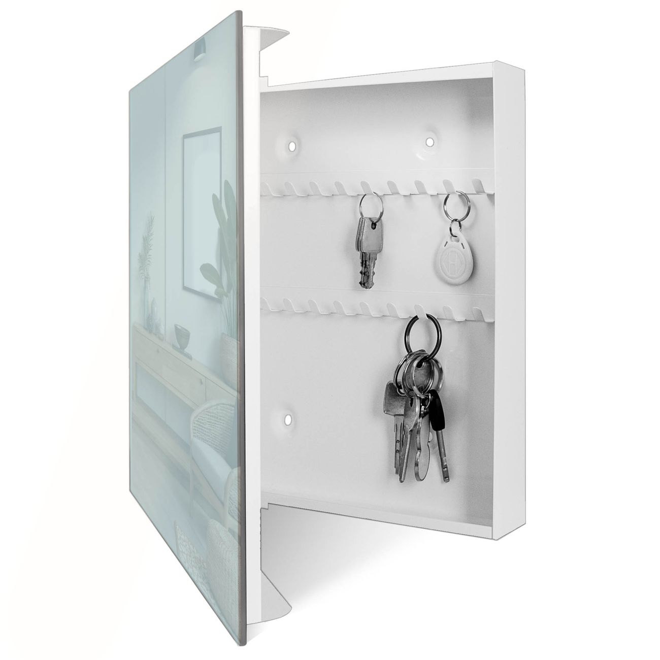 Bringe Ordnung und Eleganz in deinen Eingangsbereich mit dem banjado Schlüsselkasten Motiv Farbe Meeresgrün. Die moderne Schlüsselbox kombiniert funktionales Design mit hochwertiger Verarbeitung und wird so zu einem echten Hingucker in Flur, Büro oder Ferienwohnung. ✅ Stilvolle Schlüsselaufbewahrung mit Glasfront im Motiv Farbe Meeresgrün Der Design-Schlüsselkasten Motiv Farbe Meeresgrün bietet Platz für bis zu 50 Schlüssel, die auf 5 stabilen Reihen mit je 10 Haken übersichtlich verstaut werden. Mit seinen kompakten Maßen von 30 x 30 x 5 cm passt die Schlüsselbox perfekt auch in kleinere Räume. Der weiß lackierte Stahlkorpus mit rechts angeschlagenem Türscharnier harmoniert mit der Glasfront und fügt sich nahtlos in jedes Wohnambiente ein. Ob als Schlüsselorganizer für Zuhause oder als praktische Lösung für Büros, Praxen und Gewerbe, der banjado Schlüsselkasten sorgt für Ordnung und Übersicht. Dank der magnetischen, mit Kreidestiften beschreibbaren Glasfront kannst du Notizen anheften oder Termine direkt auf der Oberfläche festhalten. Die Schlüsselbox Motiv Farbe Meeresgrün zur Wandmontage wird inklusive Befestigungsmaterial geliefert und ist schnell angebracht. So hast du deine Schlüssel jederzeit griffbereit und zugleich stilvoll verstaut. Mit diesem banjado Schlüsselkasten Motiv Farbe Meeresgrün kombinierst du praktische Aufbewahrung mit stilvollem Wohndesign. Ob privat oder geschäftlich, die Schlüsselbox sorgt für mehr Ordnung, Übersicht und ein wohnliches Ambiente.Vorteile im Überblick