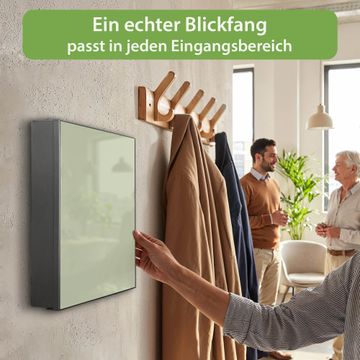 Bringe Ordnung und Eleganz in deinen Eingangsbereich mit dem banjado Schlüsselkasten Motiv Farbe Olive. Die moderne Schlüsselbox kombiniert funktionales Design mit hochwertiger Verarbeitung und wird so zu einem echten Hingucker in Flur, Büro oder Ferienwohnung. ✅ Stilvolle Schlüsselaufbewahrung mit Motiv Farbe Olive Der Design-Schlüsselkasten Motiv Farbe Olive bietet Platz für bis zu 32 Schlüssel, die auf 4 stabilen Reihen mit je 8 Haken übersichtlich verstaut werden. Mit seinen kompakten Maßen von 30 x 30 x 5 cm passt die Schlüsselbox perfekt auch in kleinere Räume. Der schwarz lackierte Stahlkorpus mit rechts angeschlagenem Türscharnier harmoniert mit gedruckten Folie auf der Front und fügt sich nahtlos in jedes Wohnambiente ein. Ob als Schlüsselorganizer für Zuhause oder als praktische Lösung für Büros, Praxen und Gewerbe, der banjado Schlüsselkasten sorgt für Ordnung und Übersicht. Dank der magnetischen, mit Kreidestiften beschreibbaren Folie auf der Front kannst du Notizen anheften oder Termine direkt auf der Oberfläche festhalten. Die Schlüsselbox Motiv Farbe Olive zur Wandmontage wird inklusive Befestigungsmaterial geliefert und ist schnell angebracht. So hast du deine Schlüssel jederzeit griffbereit und zugleich stilvoll verstaut. Mit diesem banjado Schlüsselkasten Motiv Farbe Olive kombinierst du praktische Aufbewahrung mit stilvollem Wohndesign. Ob privat oder geschäftlich, die Schlüsselbox sorgt für mehr Ordnung, Übersicht und ein wohnliches Ambiente.Vorteile im Überblick