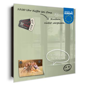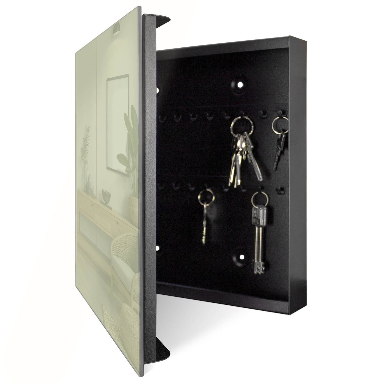 Bringe Ordnung und Eleganz in deinen Eingangsbereich mit dem banjado Schlüsselkasten Motiv Farbe Olive. Die moderne Schlüsselbox kombiniert funktionales Design mit hochwertiger Verarbeitung und wird so zu einem echten Hingucker in Flur, Büro oder Ferienwohnung. ✅ Stilvolle Schlüsselaufbewahrung mit Glasfront im Motiv Farbe Olive Der Design-Schlüsselkasten Motiv Farbe Olive bietet Platz für bis zu 50 Schlüssel, die auf 5 stabilen Reihen mit je 10 Haken übersichtlich verstaut werden. Mit seinen kompakten Maßen von 30 x 30 x 5 cm passt die Schlüsselbox perfekt auch in kleinere Räume. Der schwarz lackierte Stahlkorpus mit rechts angeschlagenem Türscharnier harmoniert mit der Glasfront und fügt sich nahtlos in jedes Wohnambiente ein. Ob als Schlüsselorganizer für Zuhause oder als praktische Lösung für Büros, Praxen und Gewerbe, der banjado Schlüsselkasten sorgt für Ordnung und Übersicht. Dank der magnetischen, mit Kreidestiften beschreibbaren Glasfront kannst du Notizen anheften oder Termine direkt auf der Oberfläche festhalten. Die Schlüsselbox Motiv Farbe Olive zur Wandmontage wird inklusive Befestigungsmaterial geliefert und ist schnell angebracht. So hast du deine Schlüssel jederzeit griffbereit und zugleich stilvoll verstaut. Mit diesem banjado Schlüsselkasten Motiv Farbe Olive kombinierst du praktische Aufbewahrung mit stilvollem Wohndesign. Ob privat oder geschäftlich, die Schlüsselbox sorgt für mehr Ordnung, Übersicht und ein wohnliches Ambiente.Vorteile im Überblick