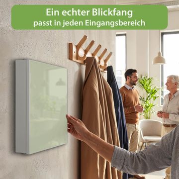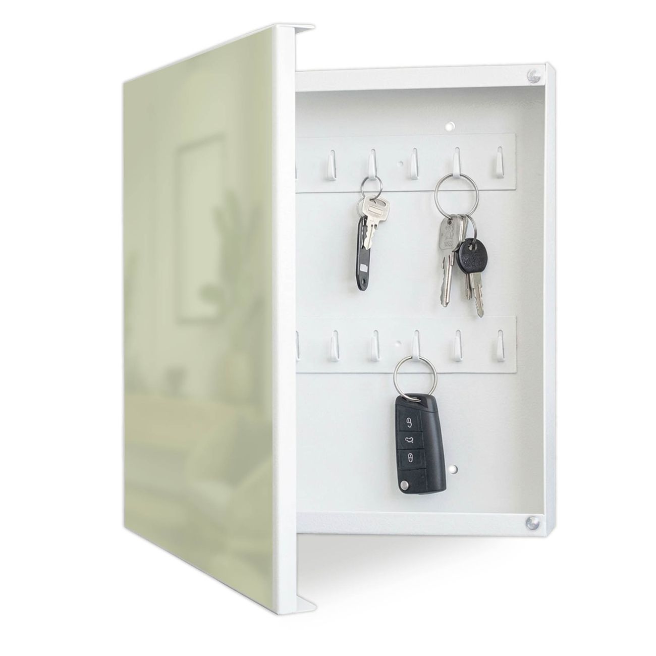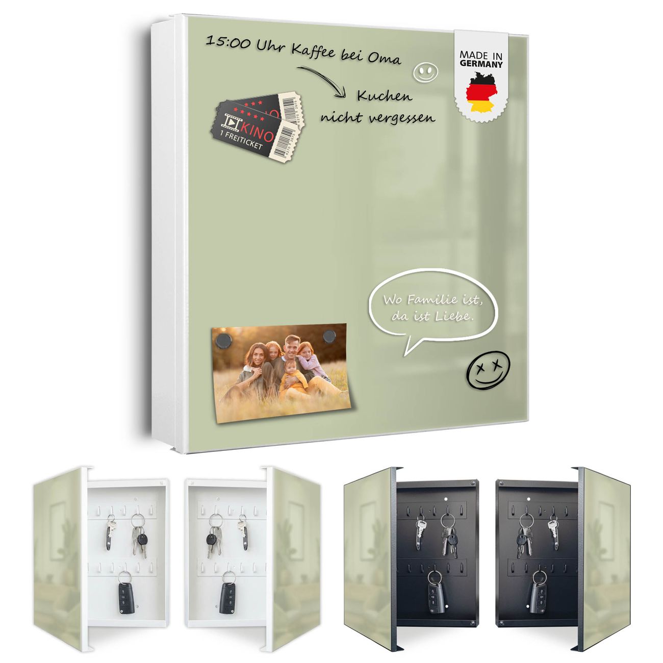 Bringe Ordnung und Eleganz in deinen Eingangsbereich mit dem banjado Schlüsselkasten Motiv Farbe Olive. Die moderne Schlüsselbox kombiniert funktionales Design mit hochwertiger Verarbeitung und wird so zu einem echten Hingucker in Flur, Büro oder Ferienwohnung. ✅ Stilvolle Schlüsselaufbewahrung mit Motiv Farbe Olive Der Design-Schlüsselkasten Motiv Farbe Olive bietet Platz für bis zu 32 Schlüssel, die auf 4 stabilen Reihen mit je 8 Haken übersichtlich verstaut werden. Mit seinen kompakten Maßen von 30 x 30 x 5 cm passt die Schlüsselbox perfekt auch in kleinere Räume. Der weiß lackierte Stahlkorpus mit links angeschlagenem Türscharnier harmoniert mit gedruckten Folie auf der Front und fügt sich nahtlos in jedes Wohnambiente ein. Ob als Schlüsselorganizer für Zuhause oder als praktische Lösung für Büros, Praxen und Gewerbe, der banjado Schlüsselkasten sorgt für Ordnung und Übersicht. Dank der magnetischen, mit Kreidestiften beschreibbaren Folie auf der Front kannst du Notizen anheften oder Termine direkt auf der Oberfläche festhalten. Die Schlüsselbox Motiv Farbe Olive zur Wandmontage wird inklusive Befestigungsmaterial geliefert und ist schnell angebracht. So hast du deine Schlüssel jederzeit griffbereit und zugleich stilvoll verstaut. Mit diesem banjado Schlüsselkasten Motiv Farbe Olive kombinierst du praktische Aufbewahrung mit stilvollem Wohndesign. Ob privat oder geschäftlich, die Schlüsselbox sorgt für mehr Ordnung, Übersicht und ein wohnliches Ambiente.Vorteile im Überblick