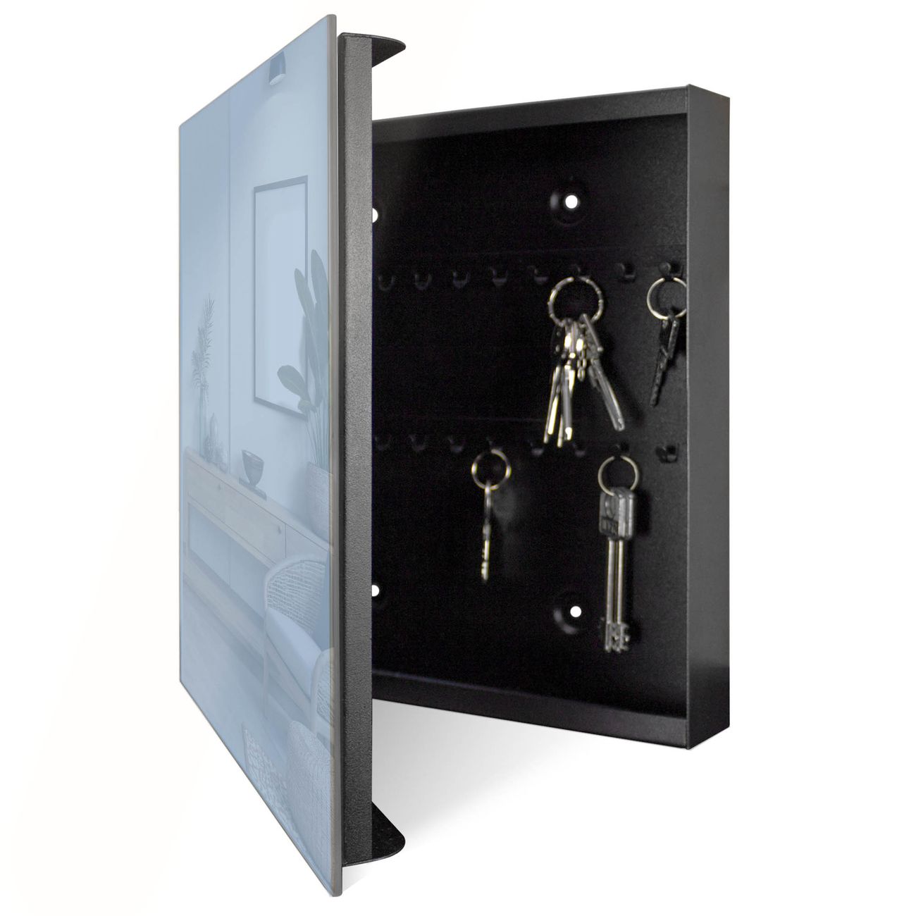 Bringe Ordnung und Eleganz in deinen Eingangsbereich mit dem banjado Schlüsselkasten Motiv Farbe Pastellblau. Die moderne Schlüsselbox kombiniert funktionales Design mit hochwertiger Verarbeitung und wird so zu einem echten Hingucker in Flur, Büro oder Ferienwohnung. ✅ Stilvolle Schlüsselaufbewahrung mit Glasfront im Motiv Farbe Pastellblau Der Design-Schlüsselkasten Motiv Farbe Pastellblau bietet Platz für bis zu 50 Schlüssel, die auf 5 stabilen Reihen mit je 10 Haken übersichtlich verstaut werden. Mit seinen kompakten Maßen von 30 x 30 x 5 cm passt die Schlüsselbox perfekt auch in kleinere Räume. Der schwarz lackierte Stahlkorpus mit rechts angeschlagenem Türscharnier harmoniert mit der Glasfront und fügt sich nahtlos in jedes Wohnambiente ein. Ob als Schlüsselorganizer für Zuhause oder als praktische Lösung für Büros, Praxen und Gewerbe, der banjado Schlüsselkasten sorgt für Ordnung und Übersicht. Dank der magnetischen, mit Kreidestiften beschreibbaren Glasfront kannst du Notizen anheften oder Termine direkt auf der Oberfläche festhalten. Die Schlüsselbox Motiv Farbe Pastellblau zur Wandmontage wird inklusive Befestigungsmaterial geliefert und ist schnell angebracht. So hast du deine Schlüssel jederzeit griffbereit und zugleich stilvoll verstaut. Mit diesem banjado Schlüsselkasten Motiv Farbe Pastellblau kombinierst du praktische Aufbewahrung mit stilvollem Wohndesign. Ob privat oder geschäftlich, die Schlüsselbox sorgt für mehr Ordnung, Übersicht und ein wohnliches Ambiente.Vorteile im Überblick