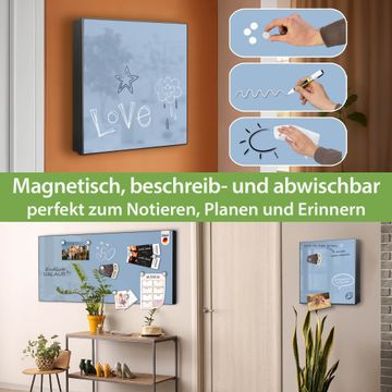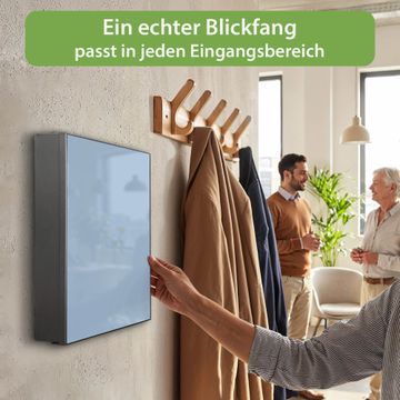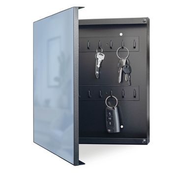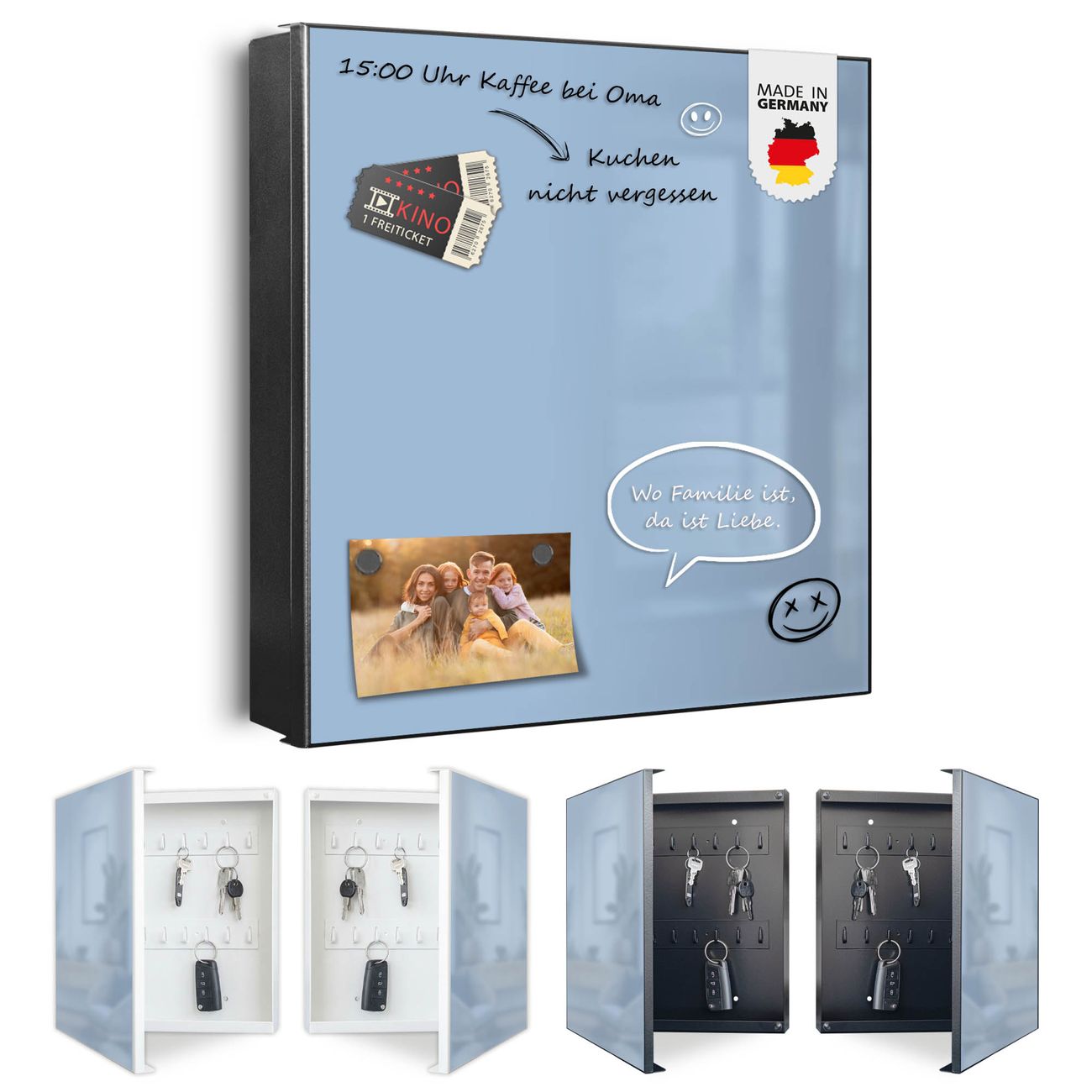 Bringe Ordnung und Eleganz in deinen Eingangsbereich mit dem banjado Schlüsselkasten Motiv Farbe Pastellblau. Die moderne Schlüsselbox kombiniert funktionales Design mit hochwertiger Verarbeitung und wird so zu einem echten Hingucker in Flur, Büro oder Ferienwohnung. ✅ Stilvolle Schlüsselaufbewahrung mit Motiv Farbe Pastellblau Der Design-Schlüsselkasten Motiv Farbe Pastellblau bietet Platz für bis zu 32 Schlüssel, die auf 4 stabilen Reihen mit je 8 Haken übersichtlich verstaut werden. Mit seinen kompakten Maßen von 30 x 30 x 5 cm passt die Schlüsselbox perfekt auch in kleinere Räume. Der schwarz lackierte Stahlkorpus mit links angeschlagenem Türscharnier harmoniert mit gedruckten Folie auf der Front und fügt sich nahtlos in jedes Wohnambiente ein. Ob als Schlüsselorganizer für Zuhause oder als praktische Lösung für Büros, Praxen und Gewerbe, der banjado Schlüsselkasten sorgt für Ordnung und Übersicht. Dank der magnetischen, mit Kreidestiften beschreibbaren Folie auf der Front kannst du Notizen anheften oder Termine direkt auf der Oberfläche festhalten. Die Schlüsselbox Motiv Farbe Pastellblau zur Wandmontage wird inklusive Befestigungsmaterial geliefert und ist schnell angebracht. So hast du deine Schlüssel jederzeit griffbereit und zugleich stilvoll verstaut. Mit diesem banjado Schlüsselkasten Motiv Farbe Pastellblau kombinierst du praktische Aufbewahrung mit stilvollem Wohndesign. Ob privat oder geschäftlich, die Schlüsselbox sorgt für mehr Ordnung, Übersicht und ein wohnliches Ambiente.Vorteile im Überblick