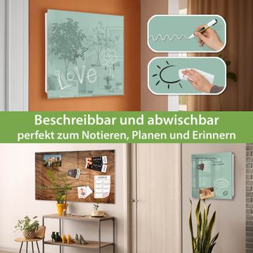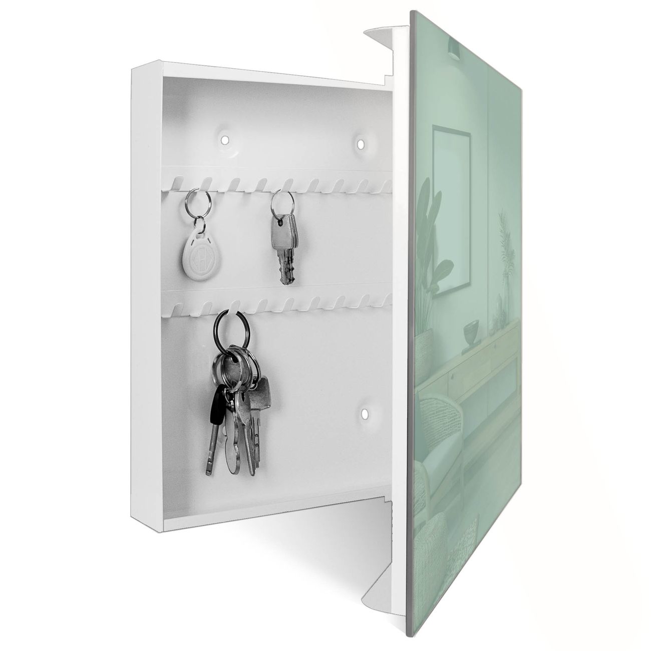 Bringe Ordnung und Eleganz in deinen Eingangsbereich mit dem banjado Schlüsselkasten Motiv Farbe Salbei. Die moderne Schlüsselbox kombiniert funktionales Design mit hochwertiger Verarbeitung und wird so zu einem echten Hingucker in Flur, Büro oder Ferienwohnung. ✅ Stilvolle Schlüsselaufbewahrung mit Glasfront im Motiv Farbe Salbei Der Design-Schlüsselkasten Motiv Farbe Salbei bietet Platz für bis zu 50 Schlüssel, die auf 5 stabilen Reihen mit je 10 Haken übersichtlich verstaut werden. Mit seinen kompakten Maßen von 30 x 30 x 5 cm passt die Schlüsselbox perfekt auch in kleinere Räume. Der weiß lackierte Stahlkorpus mit rechts angeschlagenem Türscharnier harmoniert mit der Glasfront und fügt sich nahtlos in jedes Wohnambiente ein. Ob als Schlüsselorganizer für Zuhause oder als praktische Lösung für Büros, Praxen und Gewerbe, der banjado Schlüsselkasten sorgt für Ordnung und Übersicht. Dank der magnetischen, mit Kreidestiften beschreibbaren Glasfront kannst du Notizen anheften oder Termine direkt auf der Oberfläche festhalten. Die Schlüsselbox Motiv Farbe Salbei zur Wandmontage wird inklusive Befestigungsmaterial geliefert und ist schnell angebracht. So hast du deine Schlüssel jederzeit griffbereit und zugleich stilvoll verstaut. Mit diesem banjado Schlüsselkasten Motiv Farbe Salbei kombinierst du praktische Aufbewahrung mit stilvollem Wohndesign. Ob privat oder geschäftlich, die Schlüsselbox sorgt für mehr Ordnung, Übersicht und ein wohnliches Ambiente.Vorteile im Überblick