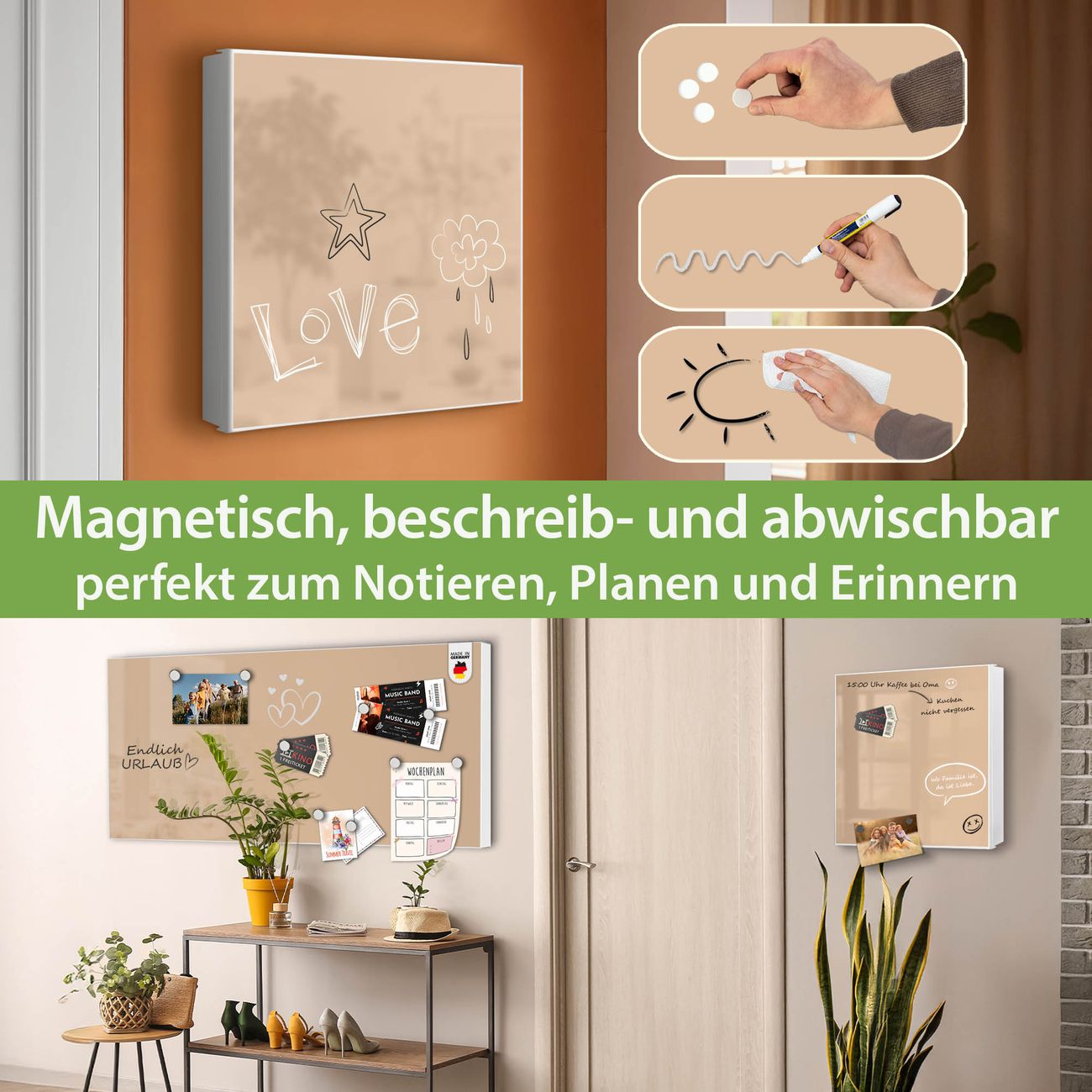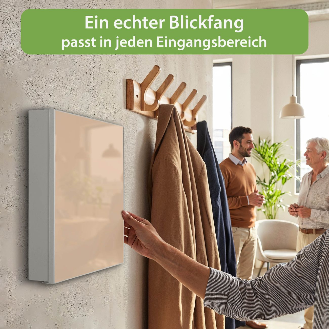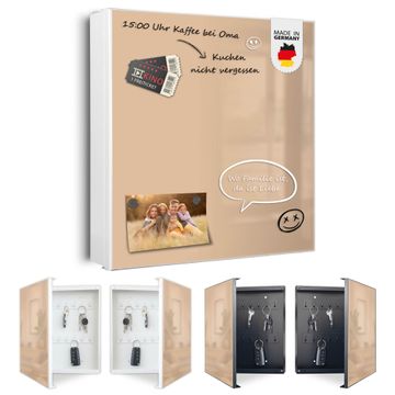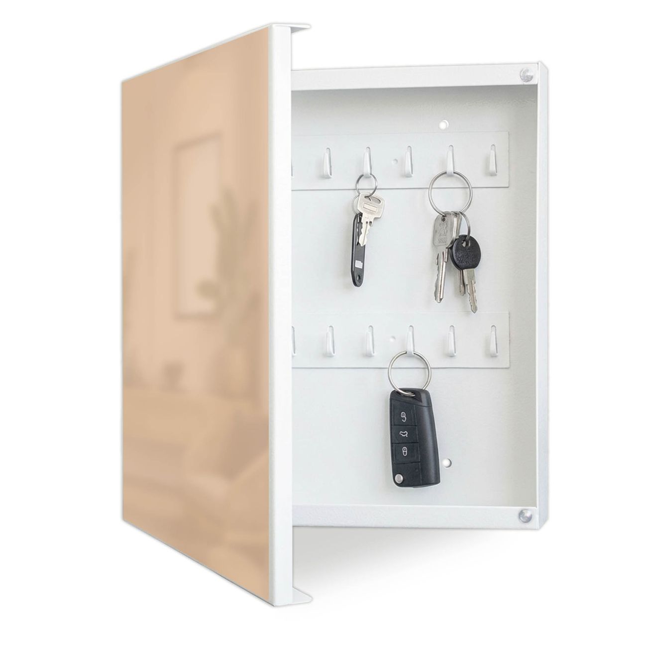 Bringe Ordnung und Eleganz in deinen Eingangsbereich mit dem banjado Schlüsselkasten Motiv Farbe Sandstein. Die moderne Schlüsselbox kombiniert funktionales Design mit hochwertiger Verarbeitung und wird so zu einem echten Hingucker in Flur, Büro oder Ferienwohnung. ✅ Stilvolle Schlüsselaufbewahrung mit Motiv Farbe Sandstein Der Design-Schlüsselkasten Motiv Farbe Sandstein bietet Platz für bis zu 32 Schlüssel, die auf 4 stabilen Reihen mit je 8 Haken übersichtlich verstaut werden. Mit seinen kompakten Maßen von 30 x 30 x 5 cm passt die Schlüsselbox perfekt auch in kleinere Räume. Der weiß lackierte Stahlkorpus mit links angeschlagenem Türscharnier harmoniert mit gedruckten Folie auf der Front und fügt sich nahtlos in jedes Wohnambiente ein. Ob als Schlüsselorganizer für Zuhause oder als praktische Lösung für Büros, Praxen und Gewerbe, der banjado Schlüsselkasten sorgt für Ordnung und Übersicht. Dank der magnetischen, mit Kreidestiften beschreibbaren Folie auf der Front kannst du Notizen anheften oder Termine direkt auf der Oberfläche festhalten. Die Schlüsselbox Motiv Farbe Sandstein zur Wandmontage wird inklusive Befestigungsmaterial geliefert und ist schnell angebracht. So hast du deine Schlüssel jederzeit griffbereit und zugleich stilvoll verstaut. Mit diesem banjado Schlüsselkasten Motiv Farbe Sandstein kombinierst du praktische Aufbewahrung mit stilvollem Wohndesign. Ob privat oder geschäftlich, die Schlüsselbox sorgt für mehr Ordnung, Übersicht und ein wohnliches Ambiente.Vorteile im Überblick