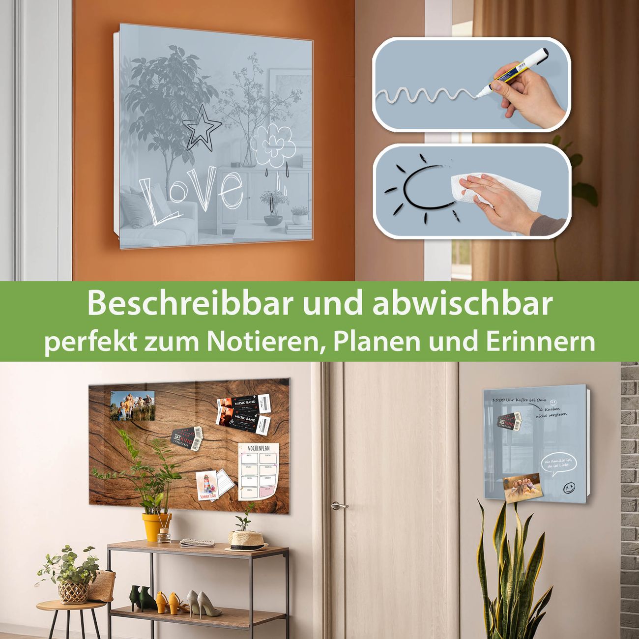 ✅ Magnetisch und mit Kreidestift beschreibbar, gehärtetes Glas, links angeschlagene TürOrdnung und Design in einem