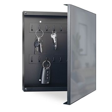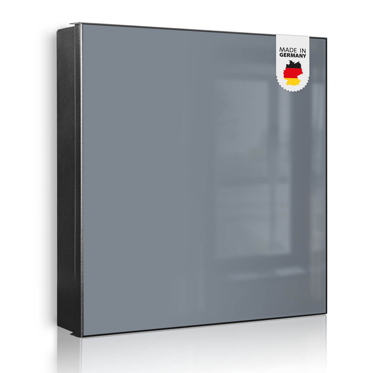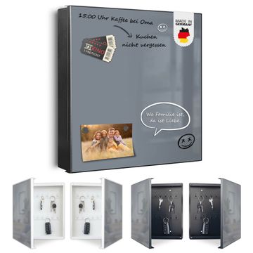 Bringe Ordnung und Eleganz in deinen Eingangsbereich mit dem banjado Schlüsselkasten Motiv Farbe Schiefergrau. Die moderne Schlüsselbox kombiniert funktionales Design mit hochwertiger Verarbeitung und wird so zu einem echten Hingucker in Flur, Büro oder Ferienwohnung. ✅ Stilvolle Schlüsselaufbewahrung mit Motiv Farbe Schiefergrau Der Design-Schlüsselkasten Motiv Farbe Schiefergrau bietet Platz für bis zu 32 Schlüssel, die auf 4 stabilen Reihen mit je 8 Haken übersichtlich verstaut werden. Mit seinen kompakten Maßen von 30 x 30 x 5 cm passt die Schlüsselbox perfekt auch in kleinere Räume. Der schwarz lackierte Stahlkorpus mit rechts angeschlagenem Türscharnier harmoniert mit gedruckten Folie auf der Front und fügt sich nahtlos in jedes Wohnambiente ein. Ob als Schlüsselorganizer für Zuhause oder als praktische Lösung für Büros, Praxen und Gewerbe, der banjado Schlüsselkasten sorgt für Ordnung und Übersicht. Dank der magnetischen, mit Kreidestiften beschreibbaren Folie auf der Front kannst du Notizen anheften oder Termine direkt auf der Oberfläche festhalten. Die Schlüsselbox Motiv Farbe Schiefergrau zur Wandmontage wird inklusive Befestigungsmaterial geliefert und ist schnell angebracht. So hast du deine Schlüssel jederzeit griffbereit und zugleich stilvoll verstaut. Mit diesem banjado Schlüsselkasten Motiv Farbe Schiefergrau kombinierst du praktische Aufbewahrung mit stilvollem Wohndesign. Ob privat oder geschäftlich, die Schlüsselbox sorgt für mehr Ordnung, Übersicht und ein wohnliches Ambiente.Vorteile im Überblick