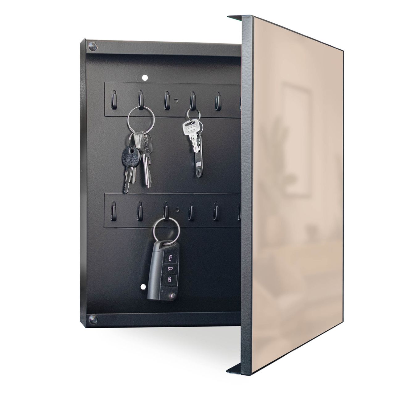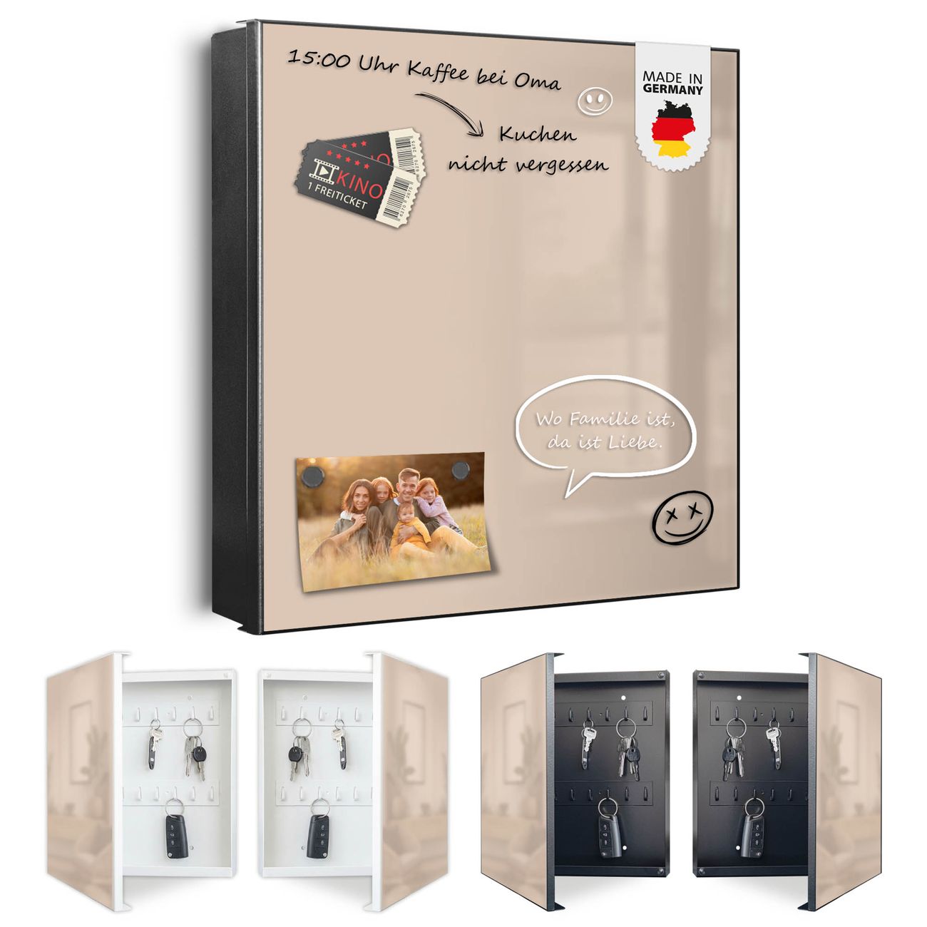 Bringe Ordnung und Eleganz in deinen Eingangsbereich mit dem banjado Schlüsselkasten Motiv Farbe Taupe. Die moderne Schlüsselbox kombiniert funktionales Design mit hochwertiger Verarbeitung und wird so zu einem echten Hingucker in Flur, Büro oder Ferienwohnung. ✅ Stilvolle Schlüsselaufbewahrung mit Motiv Farbe Taupe Der Design-Schlüsselkasten Motiv Farbe Taupe bietet Platz für bis zu 32 Schlüssel, die auf 4 stabilen Reihen mit je 8 Haken übersichtlich verstaut werden. Mit seinen kompakten Maßen von 30 x 30 x 5 cm passt die Schlüsselbox perfekt auch in kleinere Räume. Der schwarz lackierte Stahlkorpus mit rechts angeschlagenem Türscharnier harmoniert mit gedruckten Folie auf der Front und fügt sich nahtlos in jedes Wohnambiente ein. Ob als Schlüsselorganizer für Zuhause oder als praktische Lösung für Büros, Praxen und Gewerbe, der banjado Schlüsselkasten sorgt für Ordnung und Übersicht. Dank der magnetischen, mit Kreidestiften beschreibbaren Folie auf der Front kannst du Notizen anheften oder Termine direkt auf der Oberfläche festhalten. Die Schlüsselbox Motiv Farbe Taupe zur Wandmontage wird inklusive Befestigungsmaterial geliefert und ist schnell angebracht. So hast du deine Schlüssel jederzeit griffbereit und zugleich stilvoll verstaut. Mit diesem banjado Schlüsselkasten Motiv Farbe Taupe kombinierst du praktische Aufbewahrung mit stilvollem Wohndesign. Ob privat oder geschäftlich, die Schlüsselbox sorgt für mehr Ordnung, Übersicht und ein wohnliches Ambiente.Vorteile im Überblick