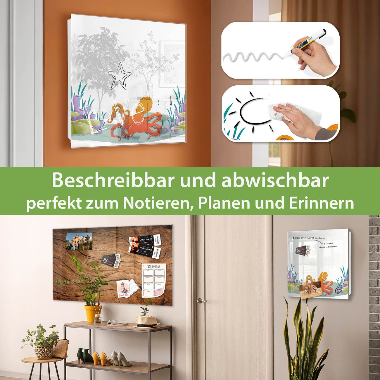 Bringe Ordnung und Eleganz in deinen Eingangsbereich mit dem banjado Schlüsselkasten Motiv Motiv Abenteuer im Ozean. Die moderne Schlüsselbox kombiniert funktionales Design mit hochwertiger Verarbeitung und wird so zu einem echten Hingucker in Flur, Büro oder Ferienwohnung. ✅ Stilvolle Schlüsselaufbewahrung mit Glasfront im Motiv Motiv Abenteuer im Ozean Der Design-Schlüsselkasten Motiv Motiv Abenteuer im Ozean bietet Platz für bis zu 50 Schlüssel, die auf 5 stabilen Reihen mit je 10 Haken übersichtlich verstaut werden. Mit seinen kompakten Maßen von 30 x 30 x 5 cm passt die Schlüsselbox perfekt auch in kleinere Räume. Der weiß lackierte Stahlkorpus mit rechts angeschlagenem Türscharnier harmoniert mit der Glasfront und fügt sich nahtlos in jedes Wohnambiente ein. Ob als Schlüsselorganizer für Zuhause oder als praktische Lösung für Büros, Praxen und Gewerbe, der banjado Schlüsselkasten sorgt für Ordnung und Übersicht. Dank der magnetischen, mit Kreidestiften beschreibbaren Glasfront kannst du Notizen anheften oder Termine direkt auf der Oberfläche festhalten. Die Schlüsselbox Motiv Motiv Abenteuer im Ozean zur Wandmontage wird inklusive Befestigungsmaterial geliefert und ist schnell angebracht. So hast du deine Schlüssel jederzeit griffbereit und zugleich stilvoll verstaut. Mit diesem banjado Schlüsselkasten Motiv Motiv Abenteuer im Ozean kombinierst du praktische Aufbewahrung mit stilvollem Wohndesign. Ob privat oder geschäftlich, die Schlüsselbox sorgt für mehr Ordnung, Übersicht und ein wohnliches Ambiente.Vorteile im Überblick