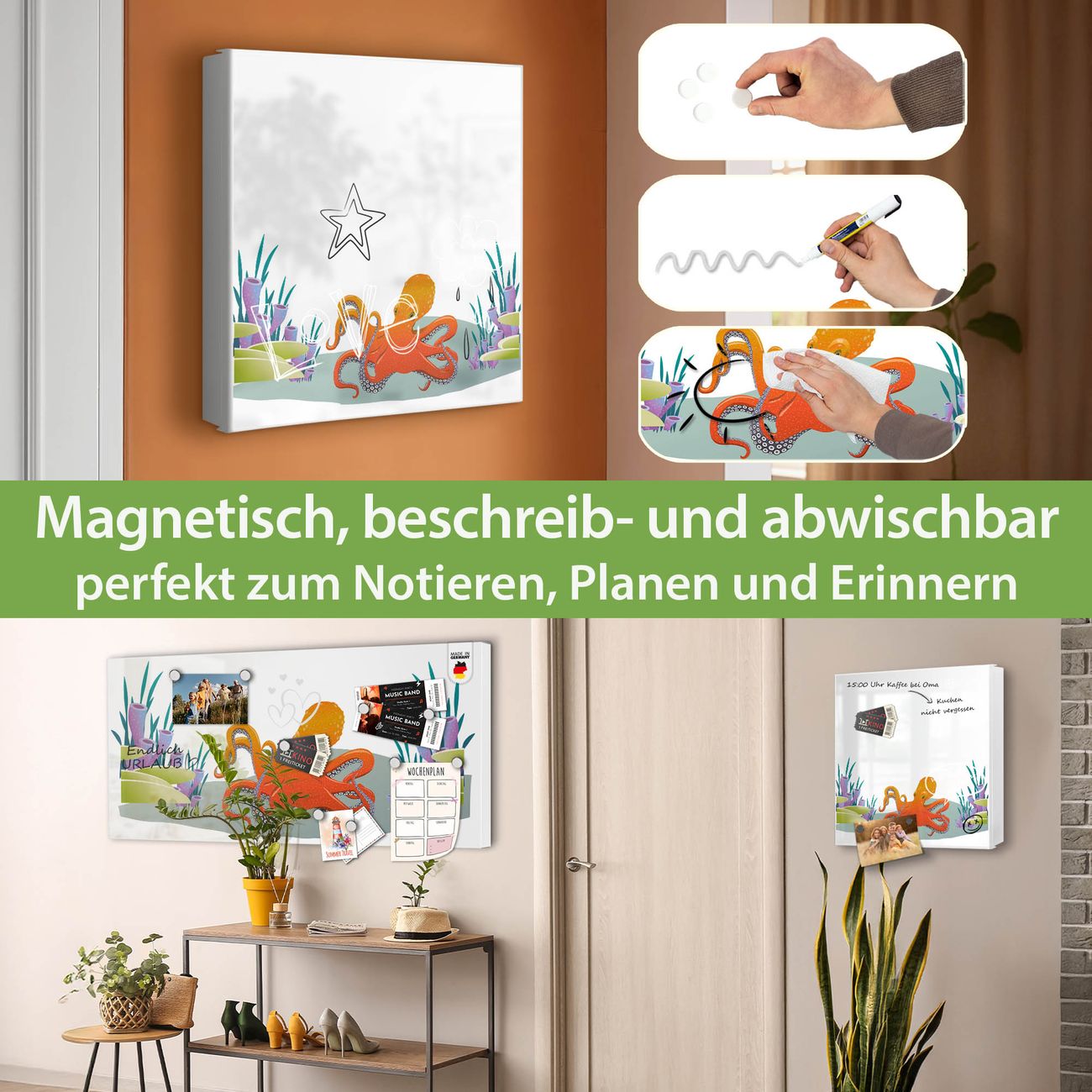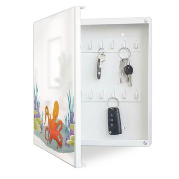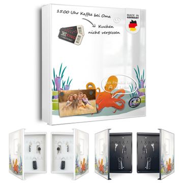 Bringe Ordnung und Eleganz in deinen Eingangsbereich mit dem banjado Schlüsselkasten Motiv Motiv Abenteuer im Ozean. Die moderne Schlüsselbox kombiniert funktionales Design mit hochwertiger Verarbeitung und wird so zu einem echten Hingucker in Flur, Büro oder Ferienwohnung. ✅ Stilvolle Schlüsselaufbewahrung mit Motiv Motiv Abenteuer im Ozean Der Design-Schlüsselkasten Motiv Motiv Abenteuer im Ozean bietet Platz für bis zu 32 Schlüssel, die auf 4 stabilen Reihen mit je 8 Haken übersichtlich verstaut werden. Mit seinen kompakten Maßen von 30 x 30 x 5 cm passt die Schlüsselbox perfekt auch in kleinere Räume. Der weiß lackierte Stahlkorpus mit links angeschlagenem Türscharnier harmoniert mit gedruckten Folie auf der Front und fügt sich nahtlos in jedes Wohnambiente ein. Ob als Schlüsselorganizer für Zuhause oder als praktische Lösung für Büros, Praxen und Gewerbe, der banjado Schlüsselkasten sorgt für Ordnung und Übersicht. Dank der magnetischen, mit Kreidestiften beschreibbaren Folie auf der Front kannst du Notizen anheften oder Termine direkt auf der Oberfläche festhalten. Die Schlüsselbox Motiv Motiv Abenteuer im Ozean zur Wandmontage wird inklusive Befestigungsmaterial geliefert und ist schnell angebracht. So hast du deine Schlüssel jederzeit griffbereit und zugleich stilvoll verstaut. Mit diesem banjado Schlüsselkasten Motiv Motiv Abenteuer im Ozean kombinierst du praktische Aufbewahrung mit stilvollem Wohndesign. Ob privat oder geschäftlich, die Schlüsselbox sorgt für mehr Ordnung, Übersicht und ein wohnliches Ambiente.Vorteile im Überblick