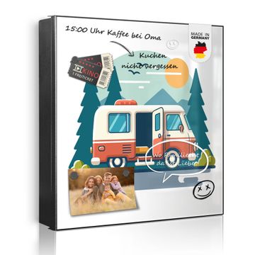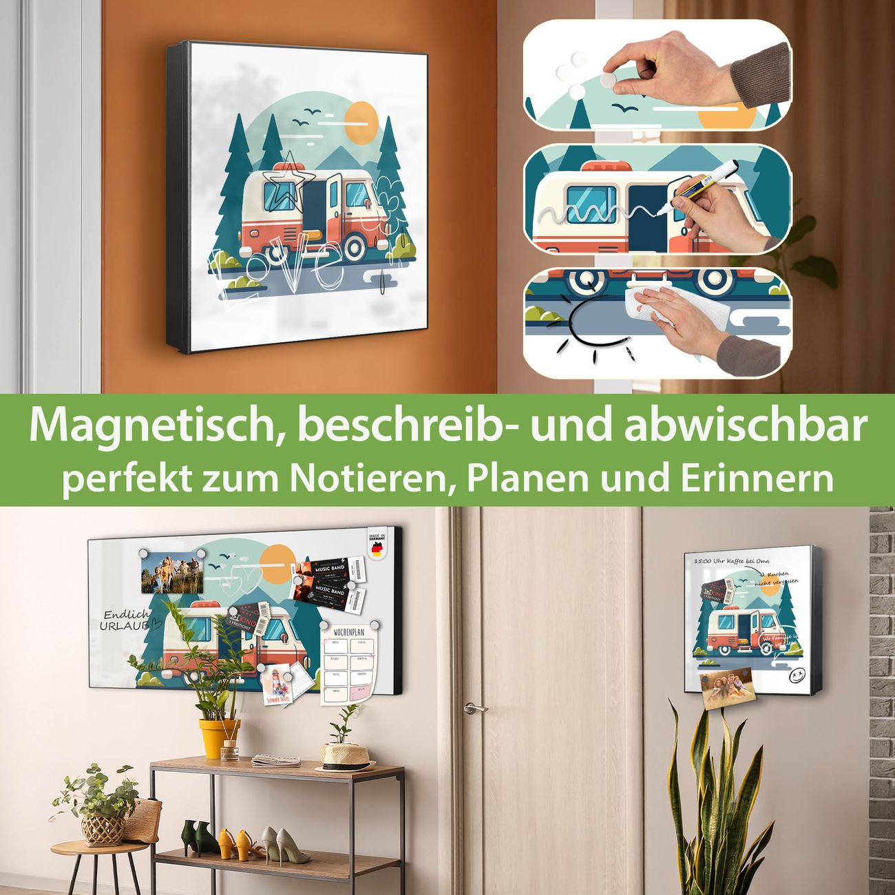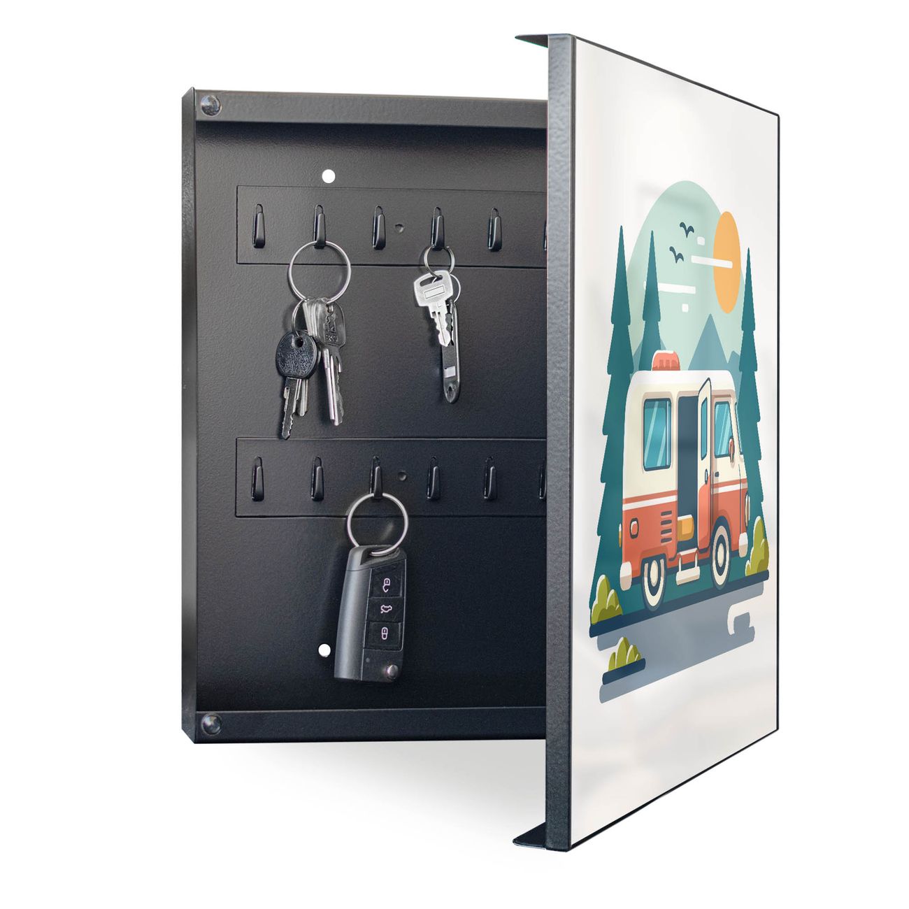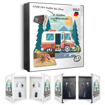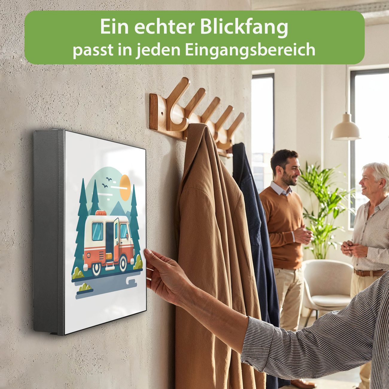 Bringe Ordnung und Eleganz in deinen Eingangsbereich mit dem banjado Schlüsselkasten Motiv Motiv Abenteuer Reise. Die moderne Schlüsselbox kombiniert funktionales Design mit hochwertiger Verarbeitung und wird so zu einem echten Hingucker in Flur, Büro oder Ferienwohnung. ✅ Stilvolle Schlüsselaufbewahrung mit Motiv Motiv Abenteuer Reise Der Design-Schlüsselkasten Motiv Motiv Abenteuer Reise bietet Platz für bis zu 32 Schlüssel, die auf 4 stabilen Reihen mit je 8 Haken übersichtlich verstaut werden. Mit seinen kompakten Maßen von 30 x 30 x 5 cm passt die Schlüsselbox perfekt auch in kleinere Räume. Der schwarz lackierte Stahlkorpus mit rechts angeschlagenem Türscharnier harmoniert mit gedruckten Folie auf der Front und fügt sich nahtlos in jedes Wohnambiente ein. Ob als Schlüsselorganizer für Zuhause oder als praktische Lösung für Büros, Praxen und Gewerbe, der banjado Schlüsselkasten sorgt für Ordnung und Übersicht. Dank der magnetischen, mit Kreidestiften beschreibbaren Folie auf der Front kannst du Notizen anheften oder Termine direkt auf der Oberfläche festhalten. Die Schlüsselbox Motiv Motiv Abenteuer Reise zur Wandmontage wird inklusive Befestigungsmaterial geliefert und ist schnell angebracht. So hast du deine Schlüssel jederzeit griffbereit und zugleich stilvoll verstaut. Mit diesem banjado Schlüsselkasten Motiv Motiv Abenteuer Reise kombinierst du praktische Aufbewahrung mit stilvollem Wohndesign. Ob privat oder geschäftlich, die Schlüsselbox sorgt für mehr Ordnung, Übersicht und ein wohnliches Ambiente.Vorteile im Überblick