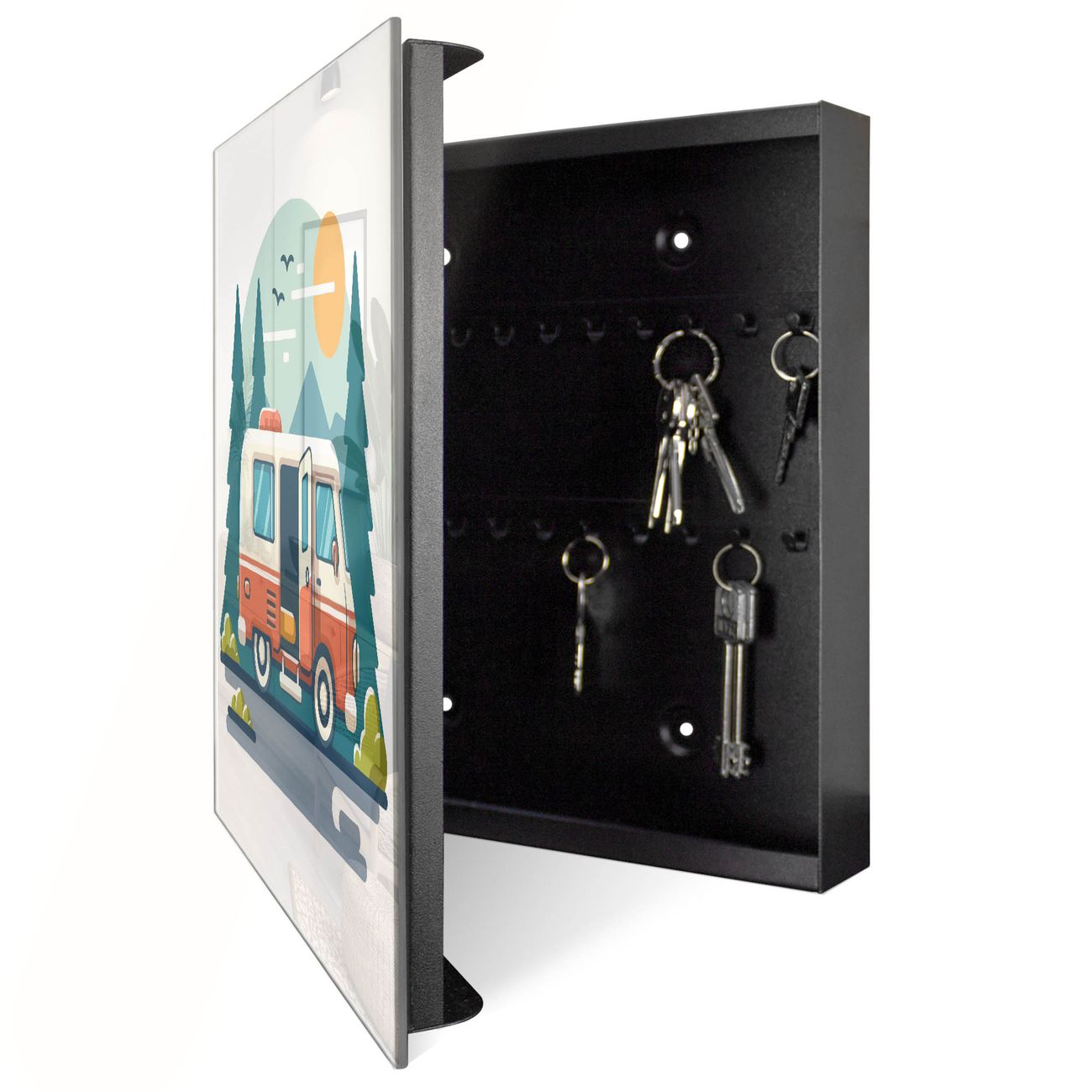 Bringe Ordnung und Eleganz in deinen Eingangsbereich mit dem banjado Schlüsselkasten Motiv Motiv Abenteuer Reise. Die moderne Schlüsselbox kombiniert funktionales Design mit hochwertiger Verarbeitung und wird so zu einem echten Hingucker in Flur, Büro oder Ferienwohnung. ✅ Stilvolle Schlüsselaufbewahrung mit Glasfront im Motiv Motiv Abenteuer Reise Der Design-Schlüsselkasten Motiv Motiv Abenteuer Reise bietet Platz für bis zu 50 Schlüssel, die auf 5 stabilen Reihen mit je 10 Haken übersichtlich verstaut werden. Mit seinen kompakten Maßen von 30 x 30 x 5 cm passt die Schlüsselbox perfekt auch in kleinere Räume. Der schwarz lackierte Stahlkorpus mit rechts angeschlagenem Türscharnier harmoniert mit der Glasfront und fügt sich nahtlos in jedes Wohnambiente ein. Ob als Schlüsselorganizer für Zuhause oder als praktische Lösung für Büros, Praxen und Gewerbe, der banjado Schlüsselkasten sorgt für Ordnung und Übersicht. Dank der magnetischen, mit Kreidestiften beschreibbaren Glasfront kannst du Notizen anheften oder Termine direkt auf der Oberfläche festhalten. Die Schlüsselbox Motiv Motiv Abenteuer Reise zur Wandmontage wird inklusive Befestigungsmaterial geliefert und ist schnell angebracht. So hast du deine Schlüssel jederzeit griffbereit und zugleich stilvoll verstaut. Mit diesem banjado Schlüsselkasten Motiv Motiv Abenteuer Reise kombinierst du praktische Aufbewahrung mit stilvollem Wohndesign. Ob privat oder geschäftlich, die Schlüsselbox sorgt für mehr Ordnung, Übersicht und ein wohnliches Ambiente.Vorteile im Überblick
