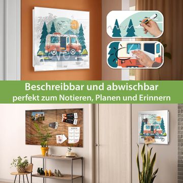 Bringe Ordnung und Eleganz in deinen Eingangsbereich mit dem banjado Schlüsselkasten Motiv Motiv Abenteuer Reise. Die moderne Schlüsselbox kombiniert funktionales Design mit hochwertiger Verarbeitung und wird so zu einem echten Hingucker in Flur, Büro oder Ferienwohnung. ✅ Stilvolle Schlüsselaufbewahrung mit Glasfront im Motiv Motiv Abenteuer Reise Der Design-Schlüsselkasten Motiv Motiv Abenteuer Reise bietet Platz für bis zu 50 Schlüssel, die auf 5 stabilen Reihen mit je 10 Haken übersichtlich verstaut werden. Mit seinen kompakten Maßen von 30 x 30 x 5 cm passt die Schlüsselbox perfekt auch in kleinere Räume. Der weiß lackierte Stahlkorpus mit rechts angeschlagenem Türscharnier harmoniert mit der Glasfront und fügt sich nahtlos in jedes Wohnambiente ein. Ob als Schlüsselorganizer für Zuhause oder als praktische Lösung für Büros, Praxen und Gewerbe, der banjado Schlüsselkasten sorgt für Ordnung und Übersicht. Dank der magnetischen, mit Kreidestiften beschreibbaren Glasfront kannst du Notizen anheften oder Termine direkt auf der Oberfläche festhalten. Die Schlüsselbox Motiv Motiv Abenteuer Reise zur Wandmontage wird inklusive Befestigungsmaterial geliefert und ist schnell angebracht. So hast du deine Schlüssel jederzeit griffbereit und zugleich stilvoll verstaut. Mit diesem banjado Schlüsselkasten Motiv Motiv Abenteuer Reise kombinierst du praktische Aufbewahrung mit stilvollem Wohndesign. Ob privat oder geschäftlich, die Schlüsselbox sorgt für mehr Ordnung, Übersicht und ein wohnliches Ambiente.Vorteile im Überblick