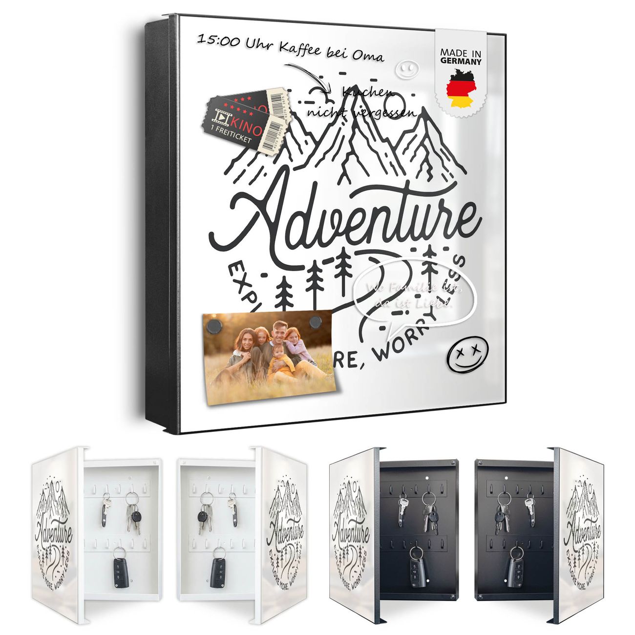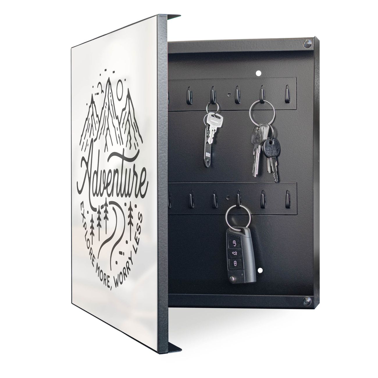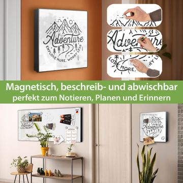 Bringe Ordnung und Eleganz in deinen Eingangsbereich mit dem banjado Schlüsselkasten Motiv Motiv Abenteuerliche Bergskizze mit Spruch. Die moderne Schlüsselbox kombiniert funktionales Design mit hochwertiger Verarbeitung und wird so zu einem echten Hingucker in Flur, Büro oder Ferienwohnung. ✅ Stilvolle Schlüsselaufbewahrung mit Motiv Motiv Abenteuerliche Bergskizze mit Spruch Der Design-Schlüsselkasten Motiv Motiv Abenteuerliche Bergskizze mit Spruch bietet Platz für bis zu 32 Schlüssel, die auf 4 stabilen Reihen mit je 8 Haken übersichtlich verstaut werden. Mit seinen kompakten Maßen von 30 x 30 x 5 cm passt die Schlüsselbox perfekt auch in kleinere Räume. Der schwarz lackierte Stahlkorpus mit links angeschlagenem Türscharnier harmoniert mit gedruckten Folie auf der Front und fügt sich nahtlos in jedes Wohnambiente ein. Ob als Schlüsselorganizer für Zuhause oder als praktische Lösung für Büros, Praxen und Gewerbe, der banjado Schlüsselkasten sorgt für Ordnung und Übersicht. Dank der magnetischen, mit Kreidestiften beschreibbaren Folie auf der Front kannst du Notizen anheften oder Termine direkt auf der Oberfläche festhalten. Die Schlüsselbox Motiv Motiv Abenteuerliche Bergskizze mit Spruch zur Wandmontage wird inklusive Befestigungsmaterial geliefert und ist schnell angebracht. So hast du deine Schlüssel jederzeit griffbereit und zugleich stilvoll verstaut. Mit diesem banjado Schlüsselkasten Motiv Motiv Abenteuerliche Bergskizze mit Spruch kombinierst du praktische Aufbewahrung mit stilvollem Wohndesign. Ob privat oder geschäftlich, die Schlüsselbox sorgt für mehr Ordnung, Übersicht und ein wohnliches Ambiente.Vorteile im Überblick
