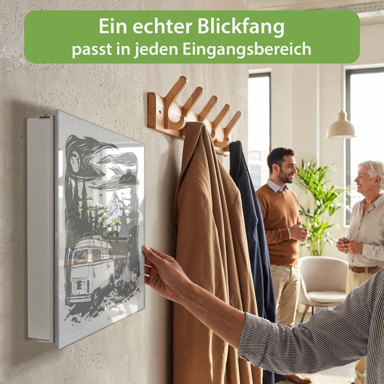 Bringe Ordnung und Eleganz in deinen Eingangsbereich mit dem banjado Schlüsselkasten Motiv Motiv Abenteuerliche Campingszene. Die moderne Schlüsselbox kombiniert funktionales Design mit hochwertiger Verarbeitung und wird so zu einem echten Hingucker in Flur, Büro oder Ferienwohnung. ✅ Stilvolle Schlüsselaufbewahrung mit Glasfront im Motiv Motiv Abenteuerliche Campingszene Der Design-Schlüsselkasten Motiv Motiv Abenteuerliche Campingszene bietet Platz für bis zu 50 Schlüssel, die auf 5 stabilen Reihen mit je 10 Haken übersichtlich verstaut werden. Mit seinen kompakten Maßen von 30 x 30 x 5 cm passt die Schlüsselbox perfekt auch in kleinere Räume. Der weiß lackierte Stahlkorpus mit rechts angeschlagenem Türscharnier harmoniert mit der Glasfront und fügt sich nahtlos in jedes Wohnambiente ein. Ob als Schlüsselorganizer für Zuhause oder als praktische Lösung für Büros, Praxen und Gewerbe, der banjado Schlüsselkasten sorgt für Ordnung und Übersicht. Dank der magnetischen, mit Kreidestiften beschreibbaren Glasfront kannst du Notizen anheften oder Termine direkt auf der Oberfläche festhalten. Die Schlüsselbox Motiv Motiv Abenteuerliche Campingszene zur Wandmontage wird inklusive Befestigungsmaterial geliefert und ist schnell angebracht. So hast du deine Schlüssel jederzeit griffbereit und zugleich stilvoll verstaut. Mit diesem banjado Schlüsselkasten Motiv Motiv Abenteuerliche Campingszene kombinierst du praktische Aufbewahrung mit stilvollem Wohndesign. Ob privat oder geschäftlich, die Schlüsselbox sorgt für mehr Ordnung, Übersicht und ein wohnliches Ambiente.Vorteile im Überblick