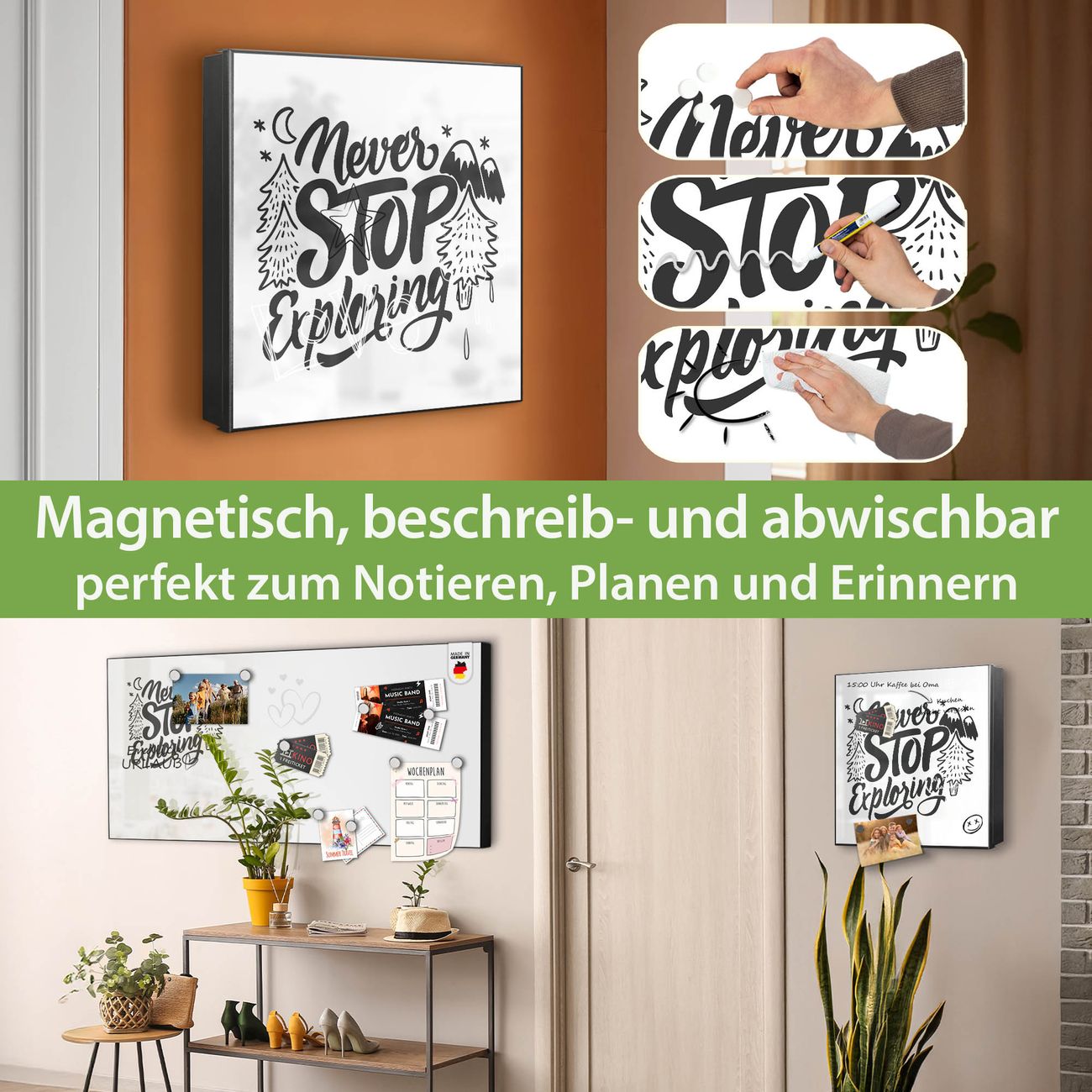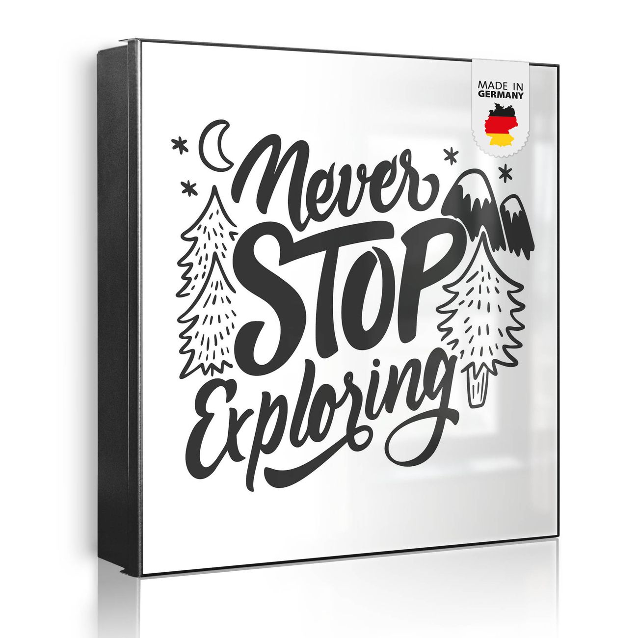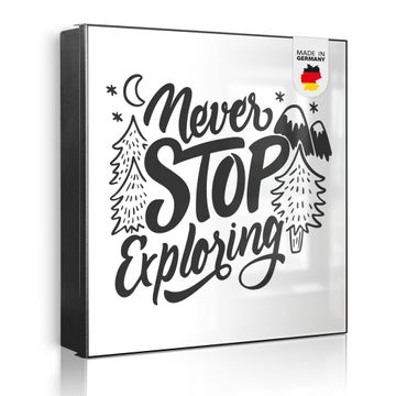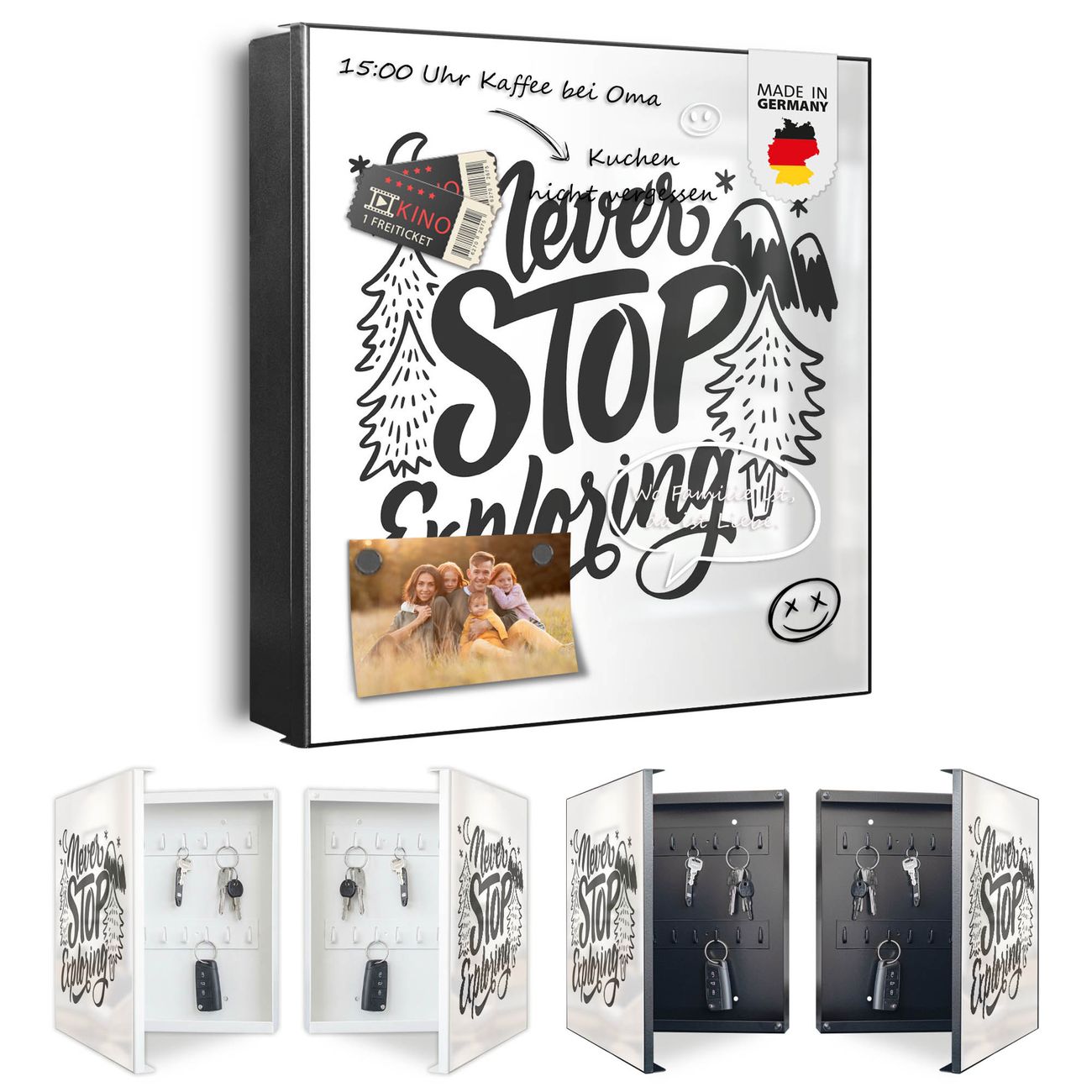 Bringe Ordnung und Eleganz in deinen Eingangsbereich mit dem banjado Schlüsselkasten Motiv Motiv Never stop Exploring. Die moderne Schlüsselbox kombiniert funktionales Design mit hochwertiger Verarbeitung und wird so zu einem echten Hingucker in Flur, Büro oder Ferienwohnung. ✅ Stilvolle Schlüsselaufbewahrung mit Motiv Motiv Never stop Exploring Der Design-Schlüsselkasten Motiv Motiv Never stop Exploring bietet Platz für bis zu 32 Schlüssel, die auf 4 stabilen Reihen mit je 8 Haken übersichtlich verstaut werden. Mit seinen kompakten Maßen von 30 x 30 x 5 cm passt die Schlüsselbox perfekt auch in kleinere Räume. Der schwarz lackierte Stahlkorpus mit links angeschlagenem Türscharnier harmoniert mit gedruckten Folie auf der Front und fügt sich nahtlos in jedes Wohnambiente ein. Ob als Schlüsselorganizer für Zuhause oder als praktische Lösung für Büros, Praxen und Gewerbe, der banjado Schlüsselkasten sorgt für Ordnung und Übersicht. Dank der magnetischen, mit Kreidestiften beschreibbaren Folie auf der Front kannst du Notizen anheften oder Termine direkt auf der Oberfläche festhalten. Die Schlüsselbox Motiv Motiv Never stop Exploring zur Wandmontage wird inklusive Befestigungsmaterial geliefert und ist schnell angebracht. So hast du deine Schlüssel jederzeit griffbereit und zugleich stilvoll verstaut. Mit diesem banjado Schlüsselkasten Motiv Motiv Never stop Exploring kombinierst du praktische Aufbewahrung mit stilvollem Wohndesign. Ob privat oder geschäftlich, die Schlüsselbox sorgt für mehr Ordnung, Übersicht und ein wohnliches Ambiente.Vorteile im Überblick
