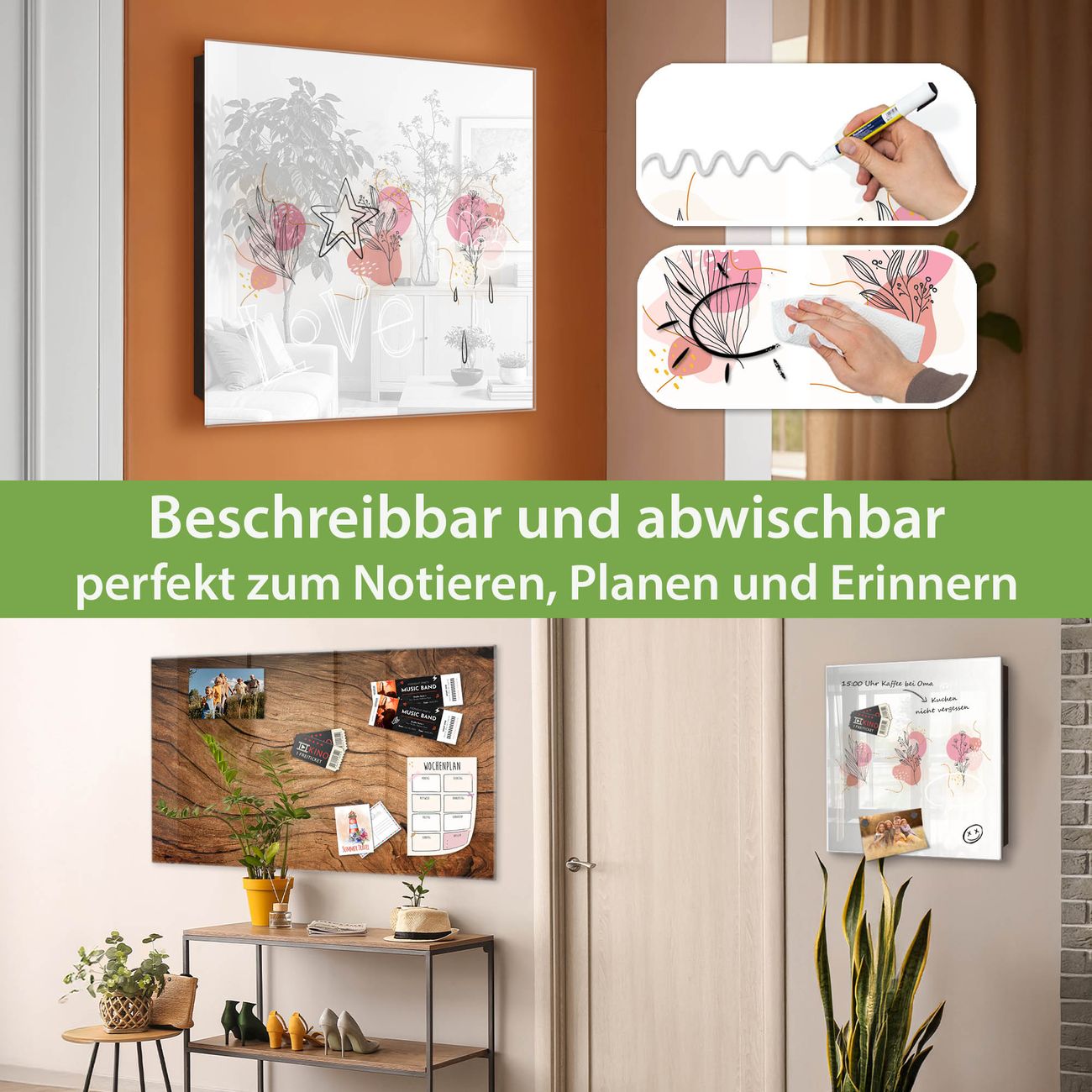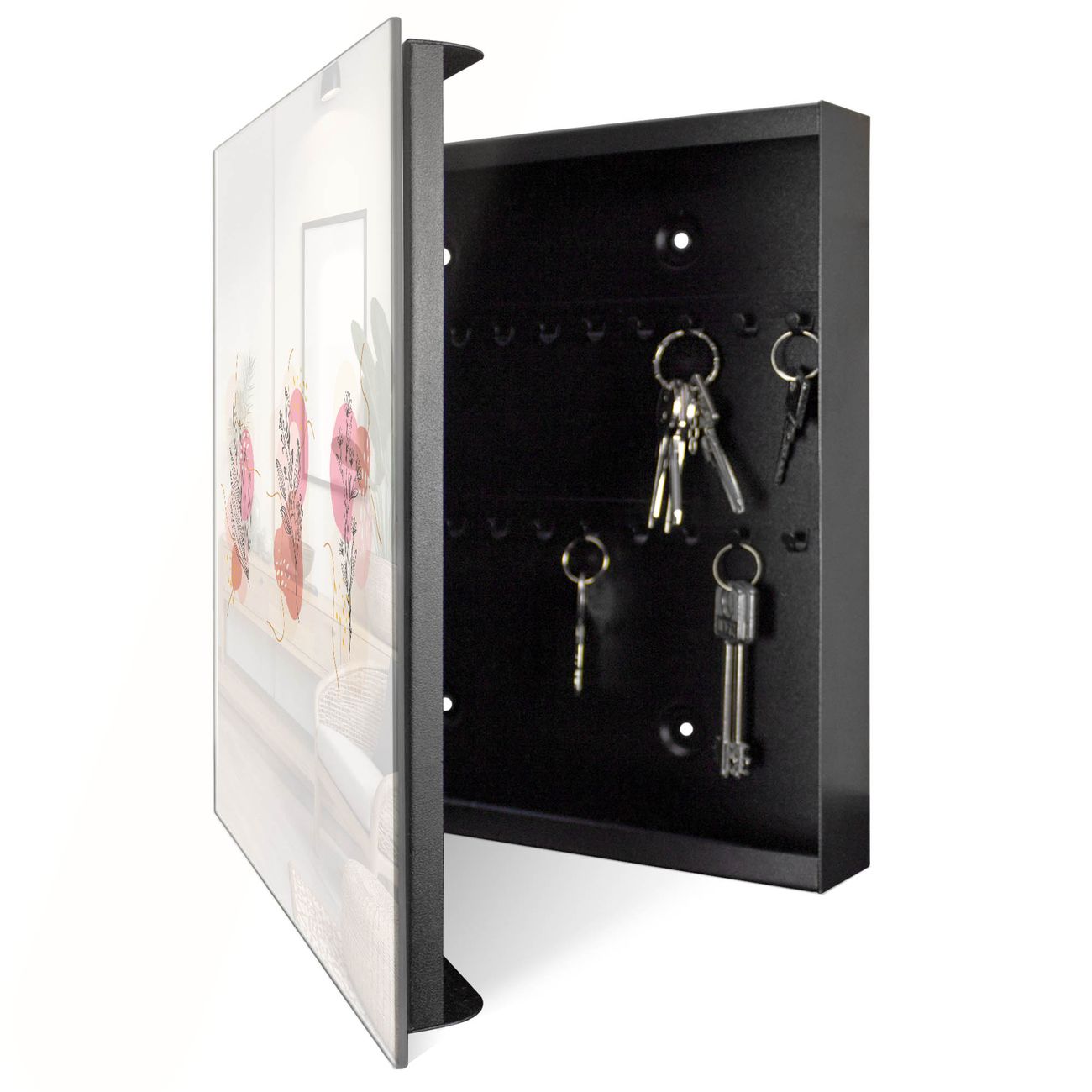 Bringe Ordnung und Eleganz in deinen Eingangsbereich mit dem banjado Schlüsselkasten Motiv Motiv Abstrakte Blumenkomposition. Die moderne Schlüsselbox kombiniert funktionales Design mit hochwertiger Verarbeitung und wird so zu einem echten Hingucker in Flur, Büro oder Ferienwohnung. ✅ Stilvolle Schlüsselaufbewahrung mit Glasfront im Motiv Motiv Abstrakte Blumenkomposition Der Design-Schlüsselkasten Motiv Motiv Abstrakte Blumenkomposition bietet Platz für bis zu 50 Schlüssel, die auf 5 stabilen Reihen mit je 10 Haken übersichtlich verstaut werden. Mit seinen kompakten Maßen von 30 x 30 x 5 cm passt die Schlüsselbox perfekt auch in kleinere Räume. Der schwarz lackierte Stahlkorpus mit rechts angeschlagenem Türscharnier harmoniert mit der Glasfront und fügt sich nahtlos in jedes Wohnambiente ein. Ob als Schlüsselorganizer für Zuhause oder als praktische Lösung für Büros, Praxen und Gewerbe, der banjado Schlüsselkasten sorgt für Ordnung und Übersicht. Dank der magnetischen, mit Kreidestiften beschreibbaren Glasfront kannst du Notizen anheften oder Termine direkt auf der Oberfläche festhalten. Die Schlüsselbox Motiv Motiv Abstrakte Blumenkomposition zur Wandmontage wird inklusive Befestigungsmaterial geliefert und ist schnell angebracht. So hast du deine Schlüssel jederzeit griffbereit und zugleich stilvoll verstaut. Mit diesem banjado Schlüsselkasten Motiv Motiv Abstrakte Blumenkomposition kombinierst du praktische Aufbewahrung mit stilvollem Wohndesign. Ob privat oder geschäftlich, die Schlüsselbox sorgt für mehr Ordnung, Übersicht und ein wohnliches Ambiente.Vorteile im Überblick
