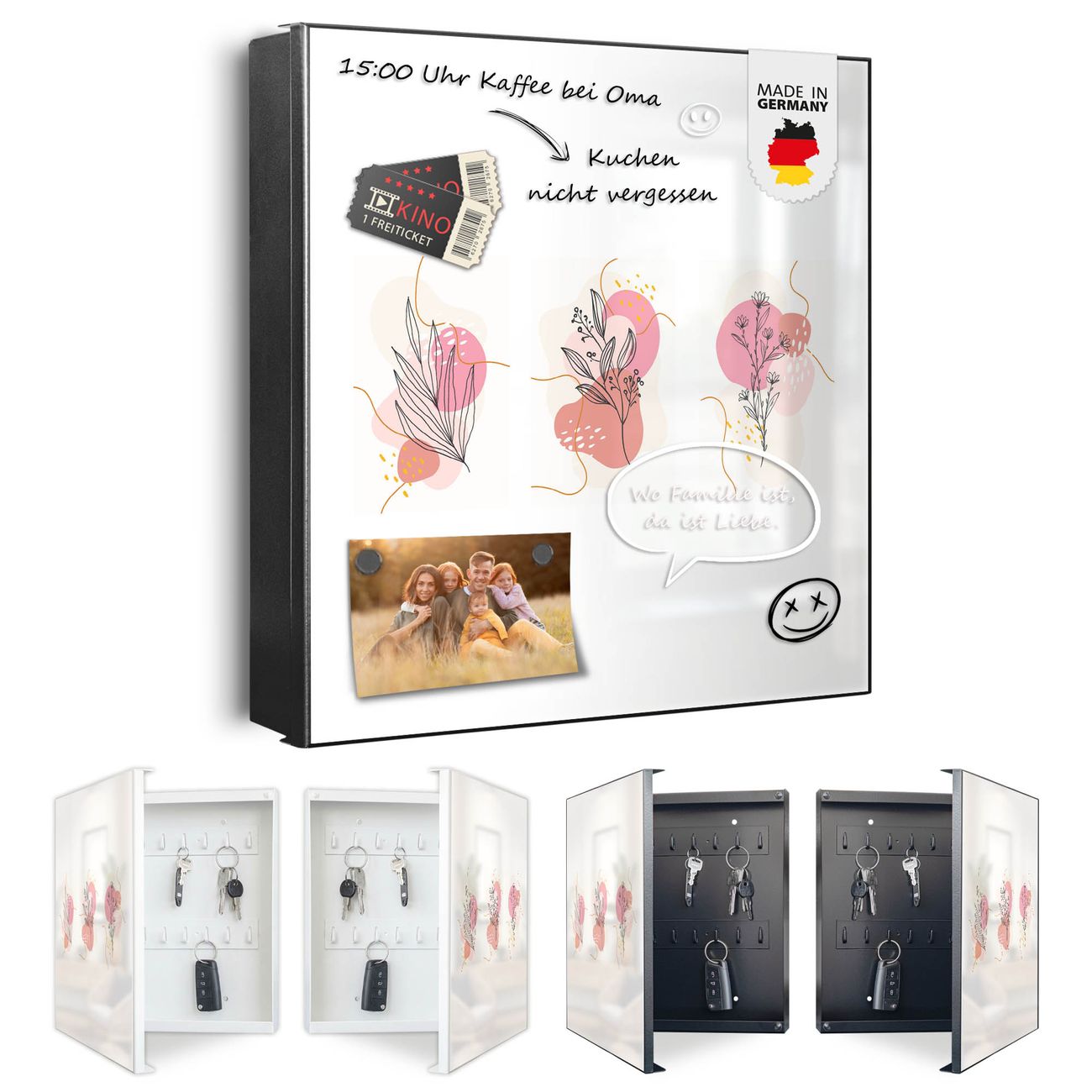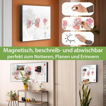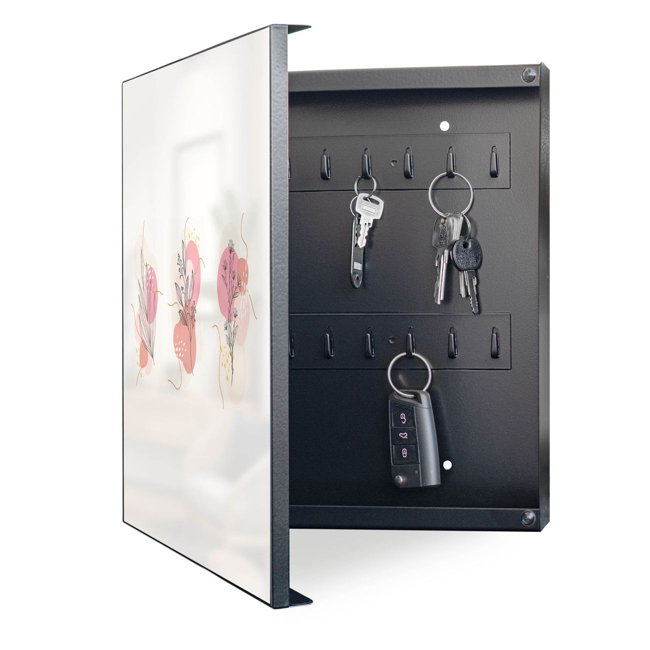 Bringe Ordnung und Eleganz in deinen Eingangsbereich mit dem banjado Schlüsselkasten Motiv Motiv Abstrakte Blumenkomposition. Die moderne Schlüsselbox kombiniert funktionales Design mit hochwertiger Verarbeitung und wird so zu einem echten Hingucker in Flur, Büro oder Ferienwohnung. ✅ Stilvolle Schlüsselaufbewahrung mit Motiv Motiv Abstrakte Blumenkomposition Der Design-Schlüsselkasten Motiv Motiv Abstrakte Blumenkomposition bietet Platz für bis zu 32 Schlüssel, die auf 4 stabilen Reihen mit je 8 Haken übersichtlich verstaut werden. Mit seinen kompakten Maßen von 30 x 30 x 5 cm passt die Schlüsselbox perfekt auch in kleinere Räume. Der schwarz lackierte Stahlkorpus mit links angeschlagenem Türscharnier harmoniert mit gedruckten Folie auf der Front und fügt sich nahtlos in jedes Wohnambiente ein. Ob als Schlüsselorganizer für Zuhause oder als praktische Lösung für Büros, Praxen und Gewerbe, der banjado Schlüsselkasten sorgt für Ordnung und Übersicht. Dank der magnetischen, mit Kreidestiften beschreibbaren Folie auf der Front kannst du Notizen anheften oder Termine direkt auf der Oberfläche festhalten. Die Schlüsselbox Motiv Motiv Abstrakte Blumenkomposition zur Wandmontage wird inklusive Befestigungsmaterial geliefert und ist schnell angebracht. So hast du deine Schlüssel jederzeit griffbereit und zugleich stilvoll verstaut. Mit diesem banjado Schlüsselkasten Motiv Motiv Abstrakte Blumenkomposition kombinierst du praktische Aufbewahrung mit stilvollem Wohndesign. Ob privat oder geschäftlich, die Schlüsselbox sorgt für mehr Ordnung, Übersicht und ein wohnliches Ambiente.Vorteile im Überblick