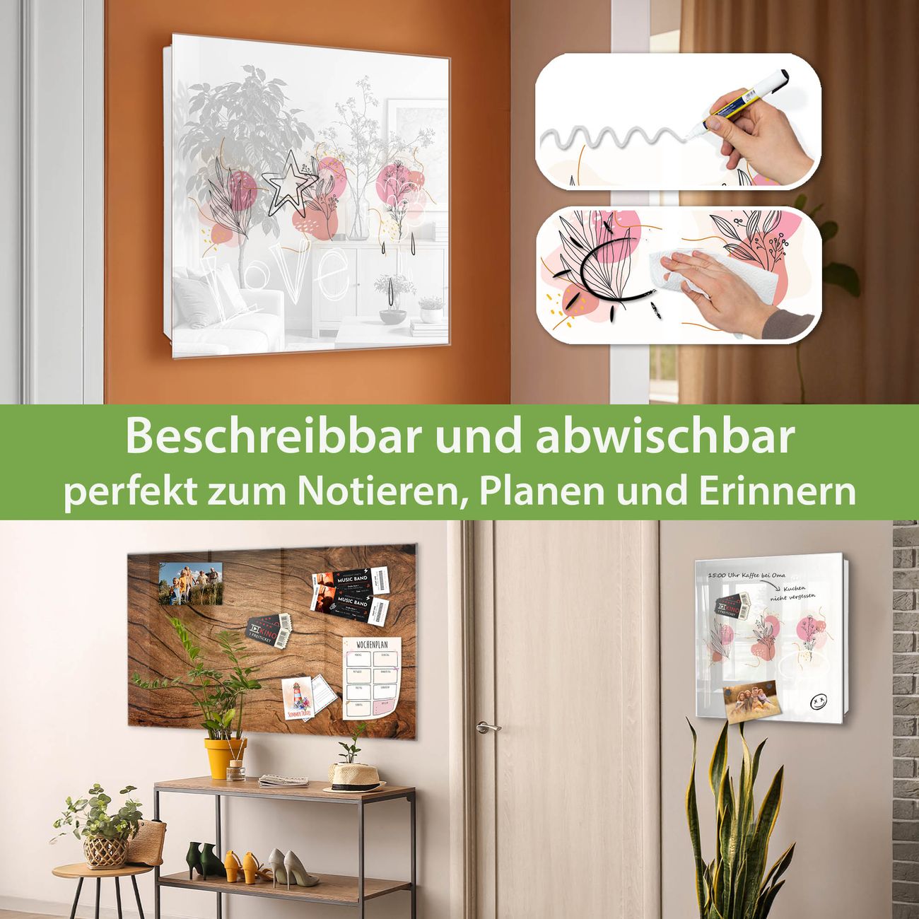 Bringe Ordnung und Eleganz in deinen Eingangsbereich mit dem banjado Schlüsselkasten Motiv Motiv Abstrakte Blumenkomposition. Die moderne Schlüsselbox kombiniert funktionales Design mit hochwertiger Verarbeitung und wird so zu einem echten Hingucker in Flur, Büro oder Ferienwohnung. ✅ Stilvolle Schlüsselaufbewahrung mit Glasfront im Motiv Motiv Abstrakte Blumenkomposition Der Design-Schlüsselkasten Motiv Motiv Abstrakte Blumenkomposition bietet Platz für bis zu 50 Schlüssel, die auf 5 stabilen Reihen mit je 10 Haken übersichtlich verstaut werden. Mit seinen kompakten Maßen von 30 x 30 x 5 cm passt die Schlüsselbox perfekt auch in kleinere Räume. Der weiß lackierte Stahlkorpus mit rechts angeschlagenem Türscharnier harmoniert mit der Glasfront und fügt sich nahtlos in jedes Wohnambiente ein. Ob als Schlüsselorganizer für Zuhause oder als praktische Lösung für Büros, Praxen und Gewerbe, der banjado Schlüsselkasten sorgt für Ordnung und Übersicht. Dank der magnetischen, mit Kreidestiften beschreibbaren Glasfront kannst du Notizen anheften oder Termine direkt auf der Oberfläche festhalten. Die Schlüsselbox Motiv Motiv Abstrakte Blumenkomposition zur Wandmontage wird inklusive Befestigungsmaterial geliefert und ist schnell angebracht. So hast du deine Schlüssel jederzeit griffbereit und zugleich stilvoll verstaut. Mit diesem banjado Schlüsselkasten Motiv Motiv Abstrakte Blumenkomposition kombinierst du praktische Aufbewahrung mit stilvollem Wohndesign. Ob privat oder geschäftlich, die Schlüsselbox sorgt für mehr Ordnung, Übersicht und ein wohnliches Ambiente.Vorteile im Überblick