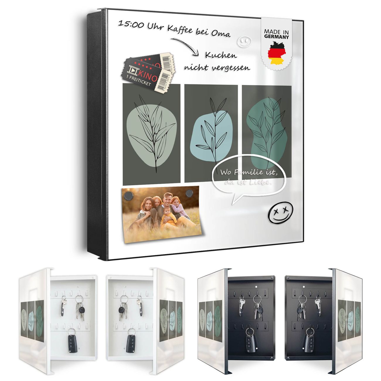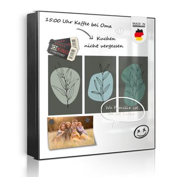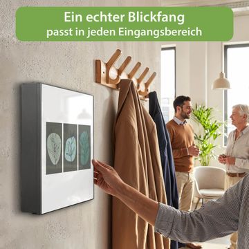 Bringe Ordnung und Eleganz in deinen Eingangsbereich mit dem banjado Schlüsselkasten Motiv Motiv Abstrakte Botanik. Die moderne Schlüsselbox kombiniert funktionales Design mit hochwertiger Verarbeitung und wird so zu einem echten Hingucker in Flur, Büro oder Ferienwohnung. ✅ Stilvolle Schlüsselaufbewahrung mit Motiv Motiv Abstrakte Botanik Der Design-Schlüsselkasten Motiv Motiv Abstrakte Botanik bietet Platz für bis zu 32 Schlüssel, die auf 4 stabilen Reihen mit je 8 Haken übersichtlich verstaut werden. Mit seinen kompakten Maßen von 30 x 30 x 5 cm passt die Schlüsselbox perfekt auch in kleinere Räume. Der schwarz lackierte Stahlkorpus mit rechts angeschlagenem Türscharnier harmoniert mit gedruckten Folie auf der Front und fügt sich nahtlos in jedes Wohnambiente ein. Ob als Schlüsselorganizer für Zuhause oder als praktische Lösung für Büros, Praxen und Gewerbe, der banjado Schlüsselkasten sorgt für Ordnung und Übersicht. Dank der magnetischen, mit Kreidestiften beschreibbaren Folie auf der Front kannst du Notizen anheften oder Termine direkt auf der Oberfläche festhalten. Die Schlüsselbox Motiv Motiv Abstrakte Botanik zur Wandmontage wird inklusive Befestigungsmaterial geliefert und ist schnell angebracht. So hast du deine Schlüssel jederzeit griffbereit und zugleich stilvoll verstaut. Mit diesem banjado Schlüsselkasten Motiv Motiv Abstrakte Botanik kombinierst du praktische Aufbewahrung mit stilvollem Wohndesign. Ob privat oder geschäftlich, die Schlüsselbox sorgt für mehr Ordnung, Übersicht und ein wohnliches Ambiente.Vorteile im Überblick