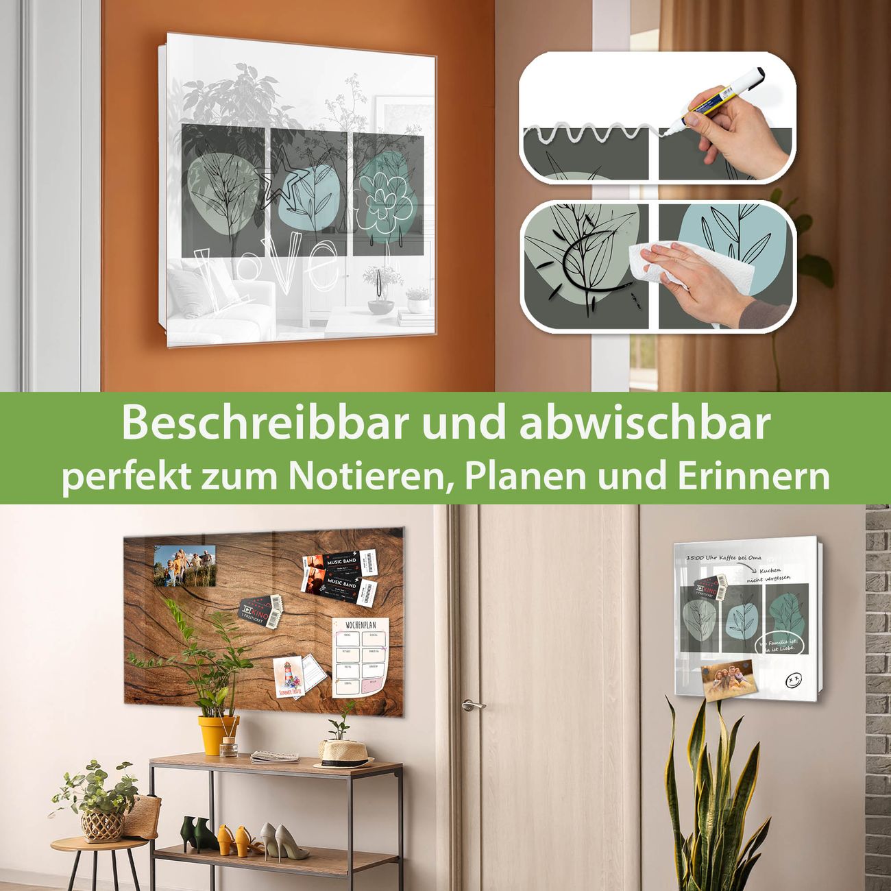 Bringe Ordnung und Eleganz in deinen Eingangsbereich mit dem banjado Schlüsselkasten Motiv Motiv Abstrakte Botanik. Die moderne Schlüsselbox kombiniert funktionales Design mit hochwertiger Verarbeitung und wird so zu einem echten Hingucker in Flur, Büro oder Ferienwohnung. ✅ Stilvolle Schlüsselaufbewahrung mit Glasfront im Motiv Motiv Abstrakte Botanik Der Design-Schlüsselkasten Motiv Motiv Abstrakte Botanik bietet Platz für bis zu 50 Schlüssel, die auf 5 stabilen Reihen mit je 10 Haken übersichtlich verstaut werden. Mit seinen kompakten Maßen von 30 x 30 x 5 cm passt die Schlüsselbox perfekt auch in kleinere Räume. Der weiß lackierte Stahlkorpus mit rechts angeschlagenem Türscharnier harmoniert mit der Glasfront und fügt sich nahtlos in jedes Wohnambiente ein. Ob als Schlüsselorganizer für Zuhause oder als praktische Lösung für Büros, Praxen und Gewerbe, der banjado Schlüsselkasten sorgt für Ordnung und Übersicht. Dank der magnetischen, mit Kreidestiften beschreibbaren Glasfront kannst du Notizen anheften oder Termine direkt auf der Oberfläche festhalten. Die Schlüsselbox Motiv Motiv Abstrakte Botanik zur Wandmontage wird inklusive Befestigungsmaterial geliefert und ist schnell angebracht. So hast du deine Schlüssel jederzeit griffbereit und zugleich stilvoll verstaut. Mit diesem banjado Schlüsselkasten Motiv Motiv Abstrakte Botanik kombinierst du praktische Aufbewahrung mit stilvollem Wohndesign. Ob privat oder geschäftlich, die Schlüsselbox sorgt für mehr Ordnung, Übersicht und ein wohnliches Ambiente.Vorteile im Überblick