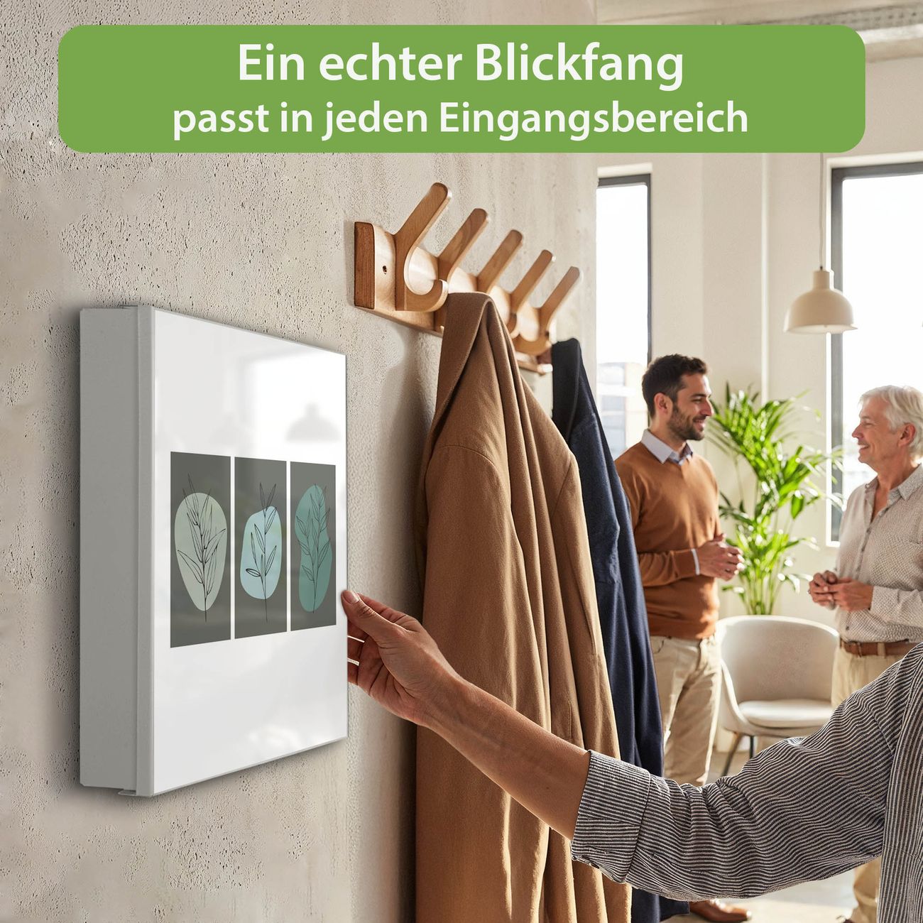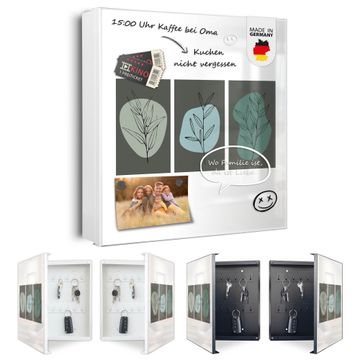 Bringe Ordnung und Eleganz in deinen Eingangsbereich mit dem banjado Schlüsselkasten Motiv Motiv Abstrakte Botanik. Die moderne Schlüsselbox kombiniert funktionales Design mit hochwertiger Verarbeitung und wird so zu einem echten Hingucker in Flur, Büro oder Ferienwohnung. ✅ Stilvolle Schlüsselaufbewahrung mit Motiv Motiv Abstrakte Botanik Der Design-Schlüsselkasten Motiv Motiv Abstrakte Botanik bietet Platz für bis zu 32 Schlüssel, die auf 4 stabilen Reihen mit je 8 Haken übersichtlich verstaut werden. Mit seinen kompakten Maßen von 30 x 30 x 5 cm passt die Schlüsselbox perfekt auch in kleinere Räume. Der weiß lackierte Stahlkorpus mit rechts angeschlagenem Türscharnier harmoniert mit gedruckten Folie auf der Front und fügt sich nahtlos in jedes Wohnambiente ein. Ob als Schlüsselorganizer für Zuhause oder als praktische Lösung für Büros, Praxen und Gewerbe, der banjado Schlüsselkasten sorgt für Ordnung und Übersicht. Dank der magnetischen, mit Kreidestiften beschreibbaren Folie auf der Front kannst du Notizen anheften oder Termine direkt auf der Oberfläche festhalten. Die Schlüsselbox Motiv Motiv Abstrakte Botanik zur Wandmontage wird inklusive Befestigungsmaterial geliefert und ist schnell angebracht. So hast du deine Schlüssel jederzeit griffbereit und zugleich stilvoll verstaut. Mit diesem banjado Schlüsselkasten Motiv Motiv Abstrakte Botanik kombinierst du praktische Aufbewahrung mit stilvollem Wohndesign. Ob privat oder geschäftlich, die Schlüsselbox sorgt für mehr Ordnung, Übersicht und ein wohnliches Ambiente.Vorteile im Überblick