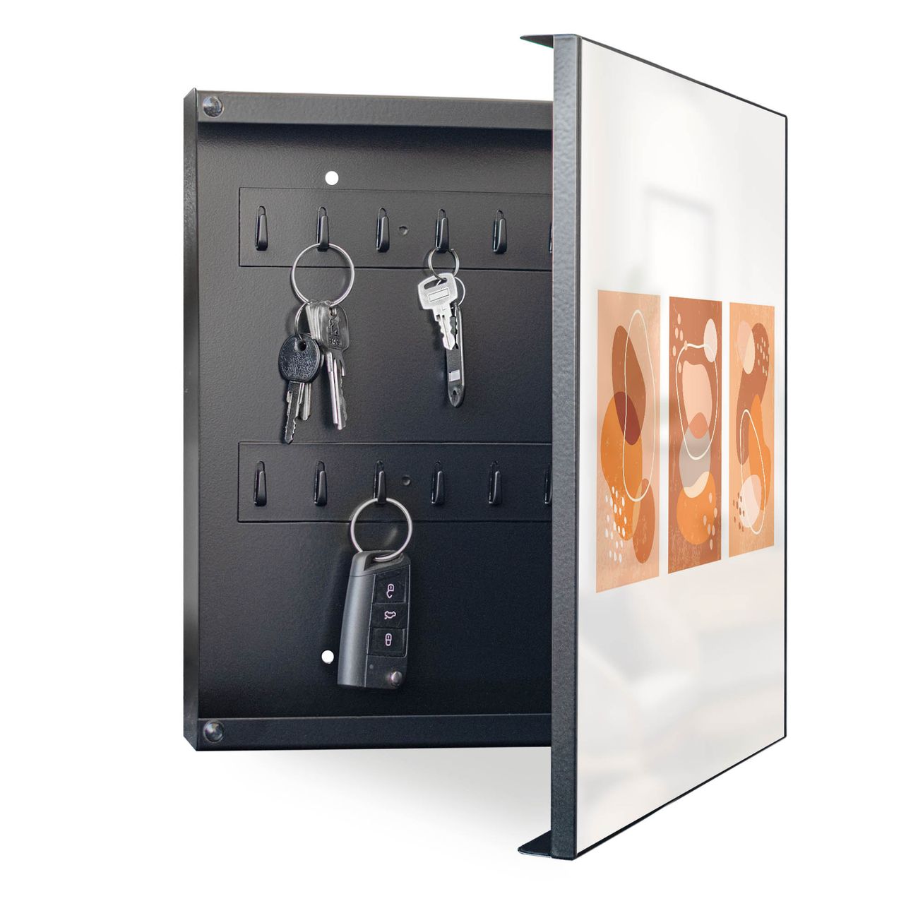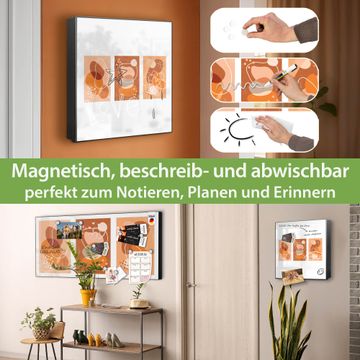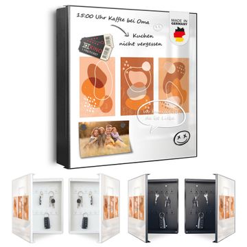 Bringe Ordnung und Eleganz in deinen Eingangsbereich mit dem banjado Schlüsselkasten Motiv Motiv Abstrakte Farbkomposition. Die moderne Schlüsselbox kombiniert funktionales Design mit hochwertiger Verarbeitung und wird so zu einem echten Hingucker in Flur, Büro oder Ferienwohnung. ✅ Stilvolle Schlüsselaufbewahrung mit Motiv Motiv Abstrakte Farbkomposition Der Design-Schlüsselkasten Motiv Motiv Abstrakte Farbkomposition bietet Platz für bis zu 32 Schlüssel, die auf 4 stabilen Reihen mit je 8 Haken übersichtlich verstaut werden. Mit seinen kompakten Maßen von 30 x 30 x 5 cm passt die Schlüsselbox perfekt auch in kleinere Räume. Der schwarz lackierte Stahlkorpus mit rechts angeschlagenem Türscharnier harmoniert mit gedruckten Folie auf der Front und fügt sich nahtlos in jedes Wohnambiente ein. Ob als Schlüsselorganizer für Zuhause oder als praktische Lösung für Büros, Praxen und Gewerbe, der banjado Schlüsselkasten sorgt für Ordnung und Übersicht. Dank der magnetischen, mit Kreidestiften beschreibbaren Folie auf der Front kannst du Notizen anheften oder Termine direkt auf der Oberfläche festhalten. Die Schlüsselbox Motiv Motiv Abstrakte Farbkomposition zur Wandmontage wird inklusive Befestigungsmaterial geliefert und ist schnell angebracht. So hast du deine Schlüssel jederzeit griffbereit und zugleich stilvoll verstaut. Mit diesem banjado Schlüsselkasten Motiv Motiv Abstrakte Farbkomposition kombinierst du praktische Aufbewahrung mit stilvollem Wohndesign. Ob privat oder geschäftlich, die Schlüsselbox sorgt für mehr Ordnung, Übersicht und ein wohnliches Ambiente.Vorteile im Überblick