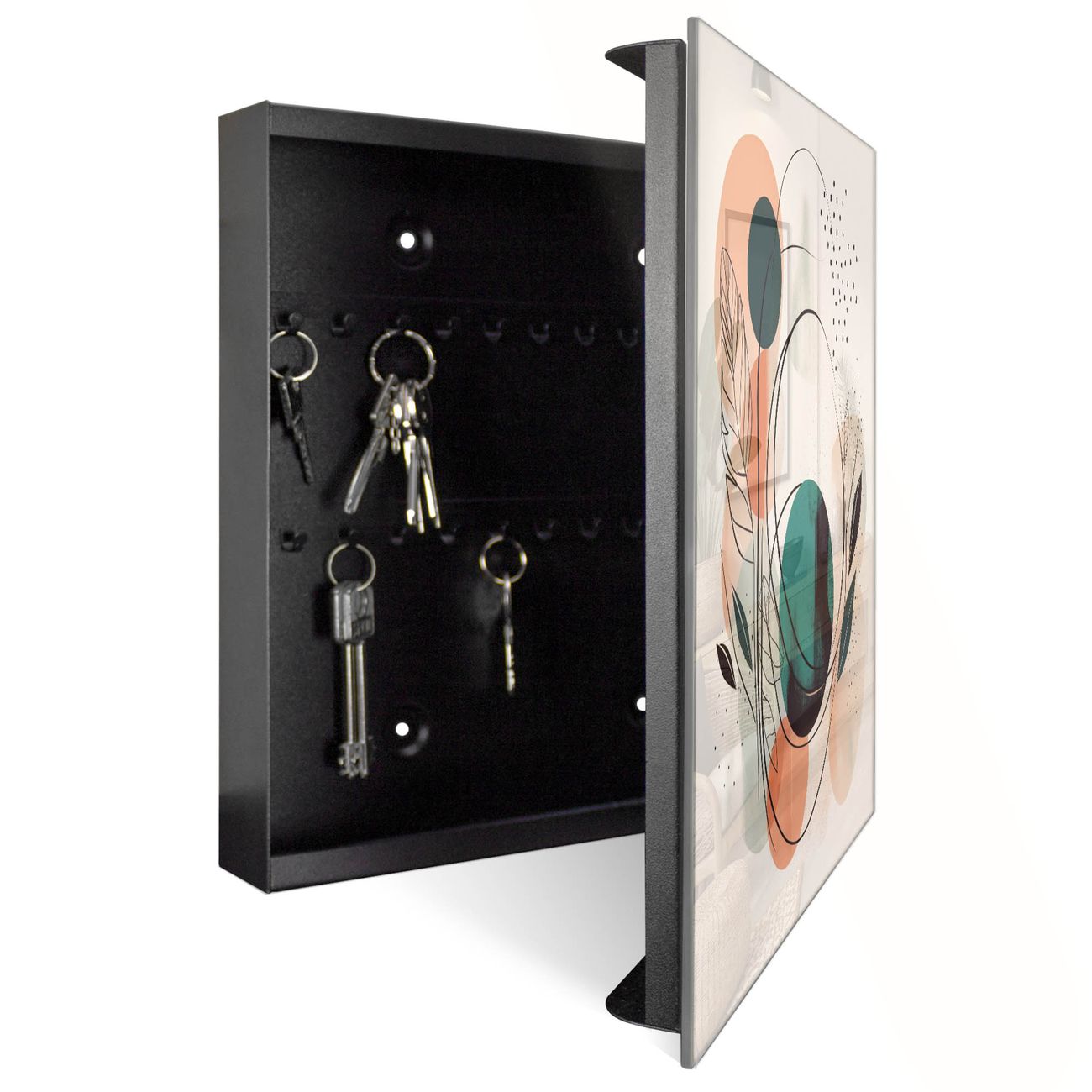 Bringe Ordnung und Eleganz in deinen Eingangsbereich mit dem banjado Schlüsselkasten Motiv Motiv Abstrakte Formen. Die moderne Schlüsselbox kombiniert funktionales Design mit hochwertiger Verarbeitung und wird so zu einem echten Hingucker in Flur, Büro oder Ferienwohnung. ✅ Stilvolle Schlüsselaufbewahrung mit Glasfront im Motiv Motiv Abstrakte Formen Der Design-Schlüsselkasten Motiv Motiv Abstrakte Formen bietet Platz für bis zu 50 Schlüssel, die auf 5 stabilen Reihen mit je 10 Haken übersichtlich verstaut werden. Mit seinen kompakten Maßen von 30 x 30 x 5 cm passt die Schlüsselbox perfekt auch in kleinere Räume. Der schwarz lackierte Stahlkorpus mit rechts angeschlagenem Türscharnier harmoniert mit der Glasfront und fügt sich nahtlos in jedes Wohnambiente ein. Ob als Schlüsselorganizer für Zuhause oder als praktische Lösung für Büros, Praxen und Gewerbe, der banjado Schlüsselkasten sorgt für Ordnung und Übersicht. Dank der magnetischen, mit Kreidestiften beschreibbaren Glasfront kannst du Notizen anheften oder Termine direkt auf der Oberfläche festhalten. Die Schlüsselbox Motiv Motiv Abstrakte Formen zur Wandmontage wird inklusive Befestigungsmaterial geliefert und ist schnell angebracht. So hast du deine Schlüssel jederzeit griffbereit und zugleich stilvoll verstaut. Mit diesem banjado Schlüsselkasten Motiv Motiv Abstrakte Formen kombinierst du praktische Aufbewahrung mit stilvollem Wohndesign. Ob privat oder geschäftlich, die Schlüsselbox sorgt für mehr Ordnung, Übersicht und ein wohnliches Ambiente.Vorteile im Überblick