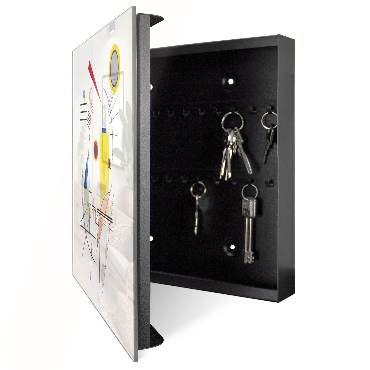 Bringe Ordnung und Eleganz in deinen Eingangsbereich mit dem banjado Schlüsselkasten Motiv Motiv Abstrakte Komposition. Die moderne Schlüsselbox kombiniert funktionales Design mit hochwertiger Verarbeitung und wird so zu einem echten Hingucker in Flur, Büro oder Ferienwohnung. ✅ Stilvolle Schlüsselaufbewahrung mit Glasfront im Motiv Motiv Abstrakte Komposition Der Design-Schlüsselkasten Motiv Motiv Abstrakte Komposition bietet Platz für bis zu 50 Schlüssel, die auf 5 stabilen Reihen mit je 10 Haken übersichtlich verstaut werden. Mit seinen kompakten Maßen von 30 x 30 x 5 cm passt die Schlüsselbox perfekt auch in kleinere Räume. Der schwarz lackierte Stahlkorpus mit rechts angeschlagenem Türscharnier harmoniert mit der Glasfront und fügt sich nahtlos in jedes Wohnambiente ein. Ob als Schlüsselorganizer für Zuhause oder als praktische Lösung für Büros, Praxen und Gewerbe, der banjado Schlüsselkasten sorgt für Ordnung und Übersicht. Dank der magnetischen, mit Kreidestiften beschreibbaren Glasfront kannst du Notizen anheften oder Termine direkt auf der Oberfläche festhalten. Die Schlüsselbox Motiv Motiv Abstrakte Komposition zur Wandmontage wird inklusive Befestigungsmaterial geliefert und ist schnell angebracht. So hast du deine Schlüssel jederzeit griffbereit und zugleich stilvoll verstaut. Mit diesem banjado Schlüsselkasten Motiv Motiv Abstrakte Komposition kombinierst du praktische Aufbewahrung mit stilvollem Wohndesign. Ob privat oder geschäftlich, die Schlüsselbox sorgt für mehr Ordnung, Übersicht und ein wohnliches Ambiente.Vorteile im Überblick