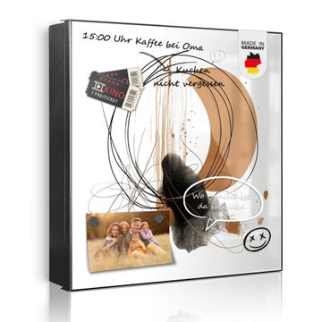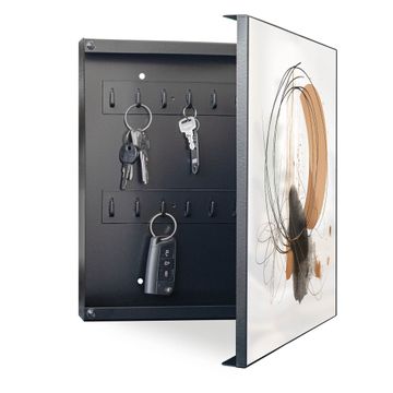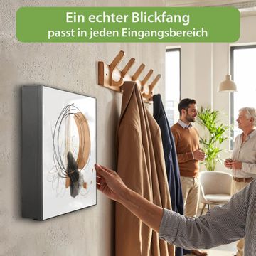 Bringe Ordnung und Eleganz in deinen Eingangsbereich mit dem banjado Schlüsselkasten Motiv Motiv Abstrakte Kreisformen. Die moderne Schlüsselbox kombiniert funktionales Design mit hochwertiger Verarbeitung und wird so zu einem echten Hingucker in Flur, Büro oder Ferienwohnung. ✅ Stilvolle Schlüsselaufbewahrung mit Motiv Motiv Abstrakte Kreisformen Der Design-Schlüsselkasten Motiv Motiv Abstrakte Kreisformen bietet Platz für bis zu 32 Schlüssel, die auf 4 stabilen Reihen mit je 8 Haken übersichtlich verstaut werden. Mit seinen kompakten Maßen von 30 x 30 x 5 cm passt die Schlüsselbox perfekt auch in kleinere Räume. Der weiß lackierte Stahlkorpus mit rechts angeschlagenem Türscharnier harmoniert mit gedruckten Folie auf der Front und fügt sich nahtlos in jedes Wohnambiente ein. Ob als Schlüsselorganizer für Zuhause oder als praktische Lösung für Büros, Praxen und Gewerbe, der banjado Schlüsselkasten sorgt für Ordnung und Übersicht. Dank der magnetischen, mit Kreidestiften beschreibbaren Folie auf der Front kannst du Notizen anheften oder Termine direkt auf der Oberfläche festhalten. Die Schlüsselbox Motiv Motiv Abstrakte Kreisformen zur Wandmontage wird inklusive Befestigungsmaterial geliefert und ist schnell angebracht. So hast du deine Schlüssel jederzeit griffbereit und zugleich stilvoll verstaut. Mit diesem banjado Schlüsselkasten Motiv Motiv Abstrakte Kreisformen kombinierst du praktische Aufbewahrung mit stilvollem Wohndesign. Ob privat oder geschäftlich, die Schlüsselbox sorgt für mehr Ordnung, Übersicht und ein wohnliches Ambiente.Vorteile im Überblick