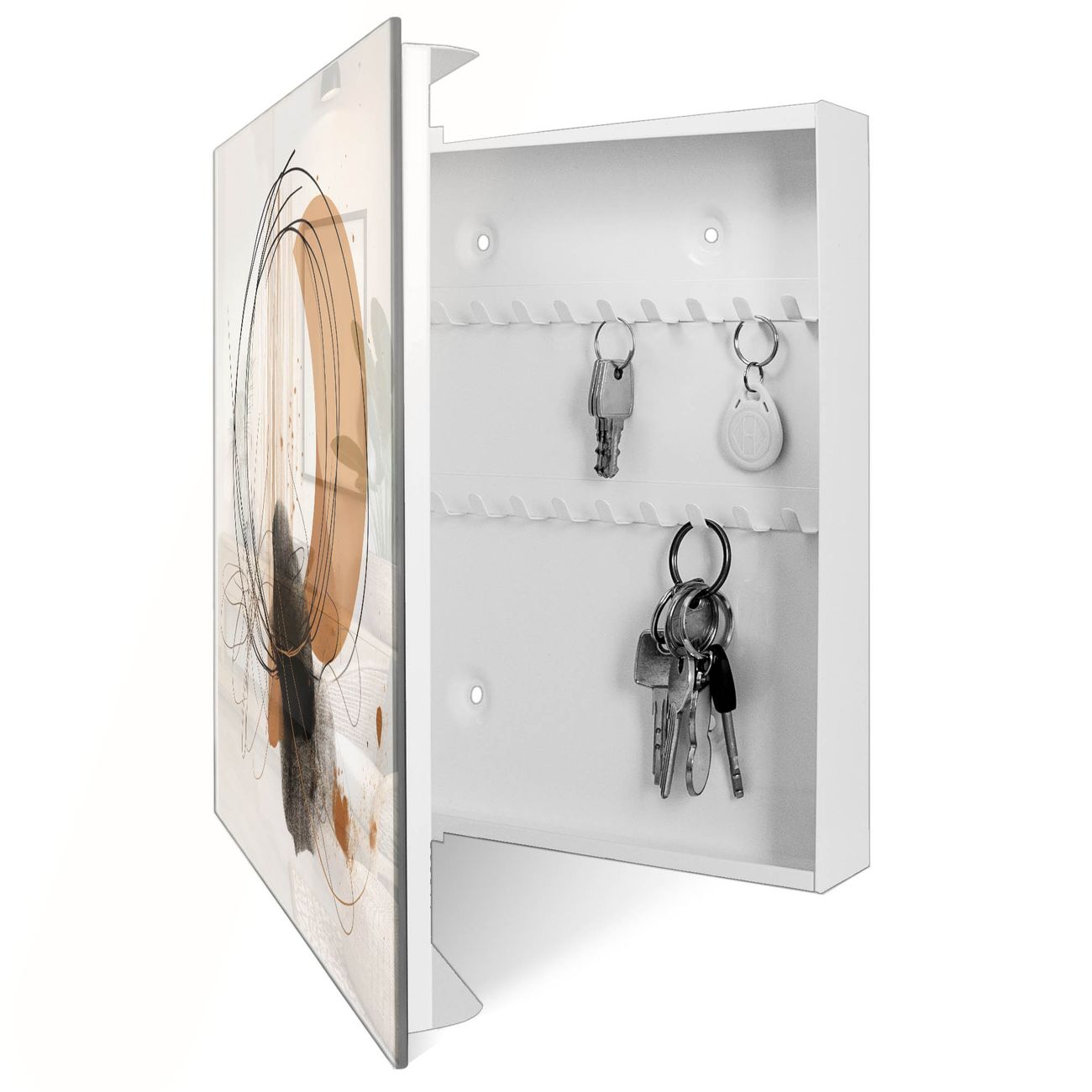 Bringe Ordnung und Eleganz in deinen Eingangsbereich mit dem banjado Schlüsselkasten Motiv Motiv Abstrakte Kreisformen. Die moderne Schlüsselbox kombiniert funktionales Design mit hochwertiger Verarbeitung und wird so zu einem echten Hingucker in Flur, Büro oder Ferienwohnung. ✅ Stilvolle Schlüsselaufbewahrung mit Glasfront im Motiv Motiv Abstrakte Kreisformen Der Design-Schlüsselkasten Motiv Motiv Abstrakte Kreisformen bietet Platz für bis zu 50 Schlüssel, die auf 5 stabilen Reihen mit je 10 Haken übersichtlich verstaut werden. Mit seinen kompakten Maßen von 30 x 30 x 5 cm passt die Schlüsselbox perfekt auch in kleinere Räume. Der weiß lackierte Stahlkorpus mit rechts angeschlagenem Türscharnier harmoniert mit der Glasfront und fügt sich nahtlos in jedes Wohnambiente ein. Ob als Schlüsselorganizer für Zuhause oder als praktische Lösung für Büros, Praxen und Gewerbe, der banjado Schlüsselkasten sorgt für Ordnung und Übersicht. Dank der magnetischen, mit Kreidestiften beschreibbaren Glasfront kannst du Notizen anheften oder Termine direkt auf der Oberfläche festhalten. Die Schlüsselbox Motiv Motiv Abstrakte Kreisformen zur Wandmontage wird inklusive Befestigungsmaterial geliefert und ist schnell angebracht. So hast du deine Schlüssel jederzeit griffbereit und zugleich stilvoll verstaut. Mit diesem banjado Schlüsselkasten Motiv Motiv Abstrakte Kreisformen kombinierst du praktische Aufbewahrung mit stilvollem Wohndesign. Ob privat oder geschäftlich, die Schlüsselbox sorgt für mehr Ordnung, Übersicht und ein wohnliches Ambiente.Vorteile im Überblick