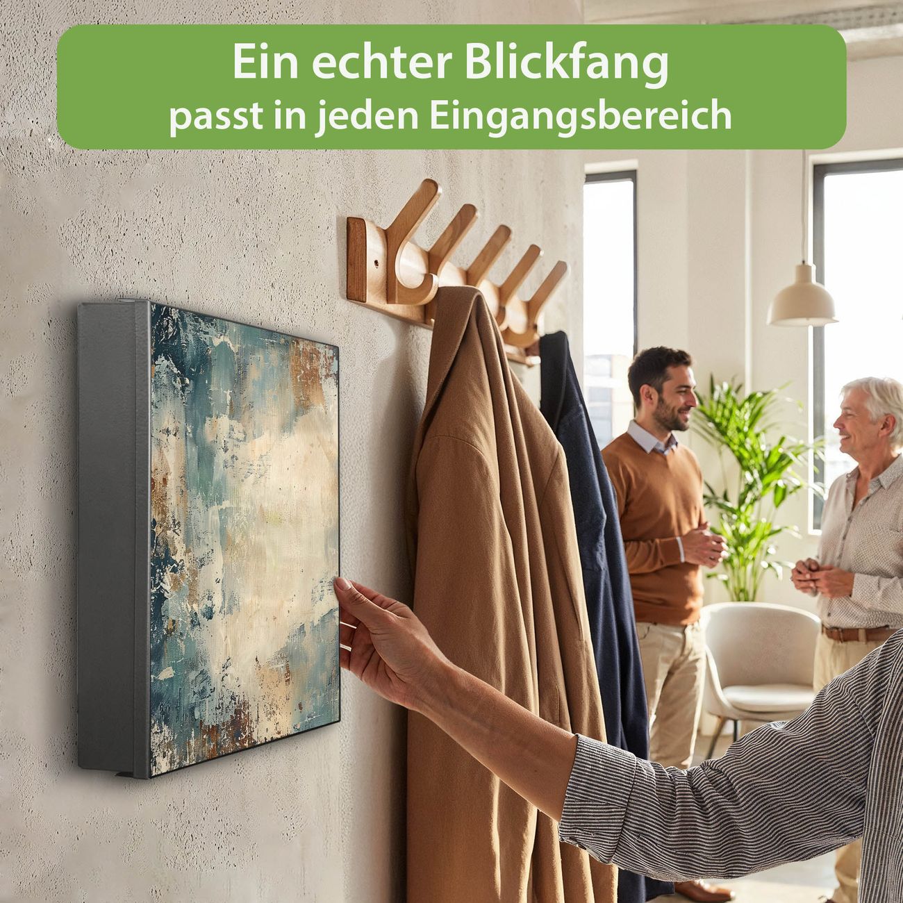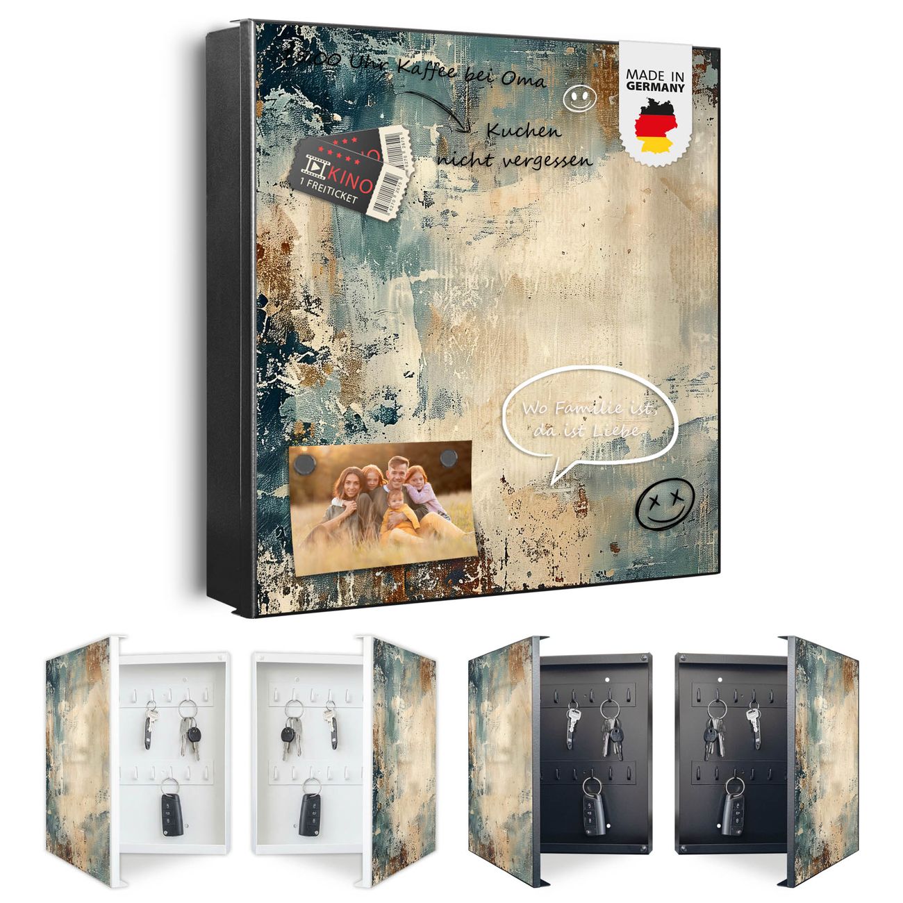 Bringe Ordnung und Eleganz in deinen Eingangsbereich mit dem banjado Schlüsselkasten Motiv Motiv Abstrakte Textur. Die moderne Schlüsselbox kombiniert funktionales Design mit hochwertiger Verarbeitung und wird so zu einem echten Hingucker in Flur, Büro oder Ferienwohnung. ✅ Stilvolle Schlüsselaufbewahrung mit Motiv Motiv Abstrakte Textur Der Design-Schlüsselkasten Motiv Motiv Abstrakte Textur bietet Platz für bis zu 32 Schlüssel, die auf 4 stabilen Reihen mit je 8 Haken übersichtlich verstaut werden. Mit seinen kompakten Maßen von 30 x 30 x 5 cm passt die Schlüsselbox perfekt auch in kleinere Räume. Der schwarz lackierte Stahlkorpus mit rechts angeschlagenem Türscharnier harmoniert mit gedruckten Folie auf der Front und fügt sich nahtlos in jedes Wohnambiente ein. Ob als Schlüsselorganizer für Zuhause oder als praktische Lösung für Büros, Praxen und Gewerbe, der banjado Schlüsselkasten sorgt für Ordnung und Übersicht. Dank der magnetischen, mit Kreidestiften beschreibbaren Folie auf der Front kannst du Notizen anheften oder Termine direkt auf der Oberfläche festhalten. Die Schlüsselbox Motiv Motiv Abstrakte Textur zur Wandmontage wird inklusive Befestigungsmaterial geliefert und ist schnell angebracht. So hast du deine Schlüssel jederzeit griffbereit und zugleich stilvoll verstaut. Mit diesem banjado Schlüsselkasten Motiv Motiv Abstrakte Textur kombinierst du praktische Aufbewahrung mit stilvollem Wohndesign. Ob privat oder geschäftlich, die Schlüsselbox sorgt für mehr Ordnung, Übersicht und ein wohnliches Ambiente.Vorteile im Überblick