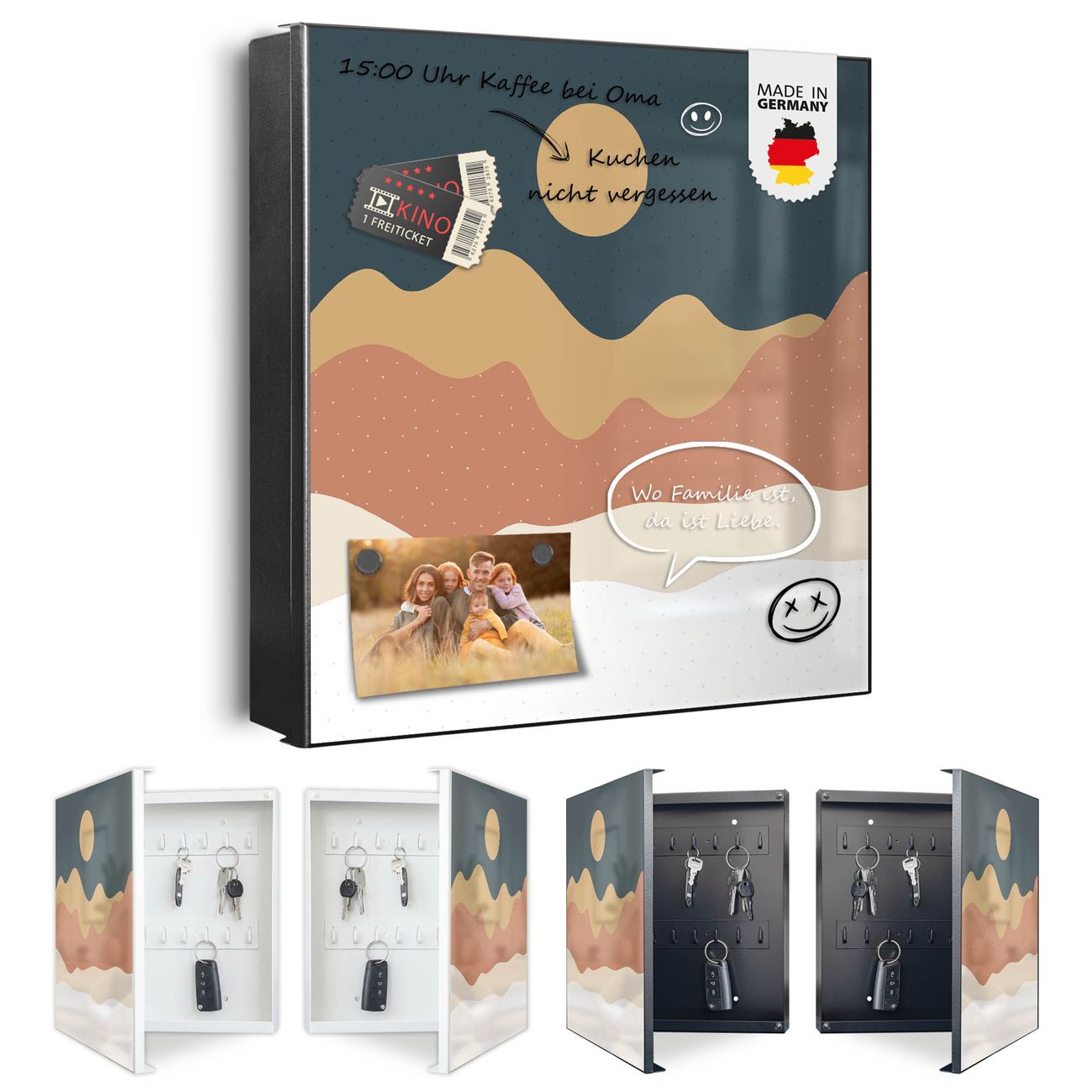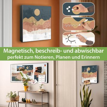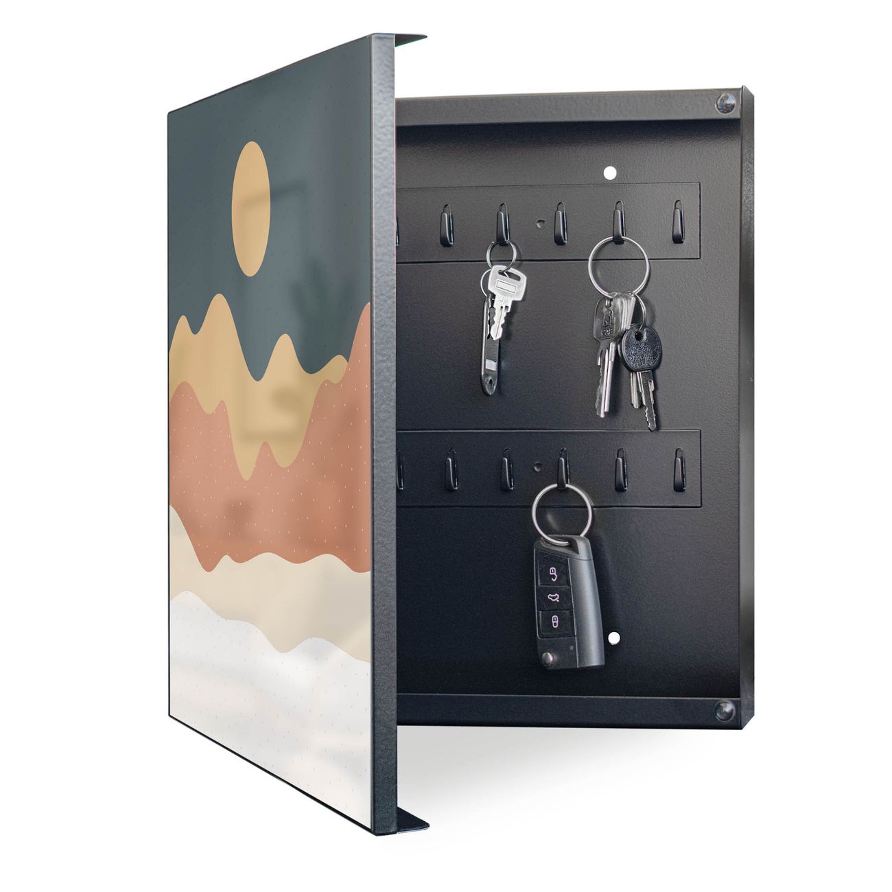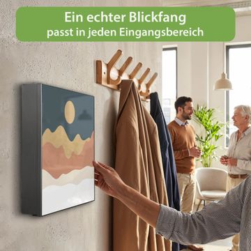 Bringe Ordnung und Eleganz in deinen Eingangsbereich mit dem banjado Schlüsselkasten Motiv Motiv Abstrakte Wüstenlandschaft. Die moderne Schlüsselbox kombiniert funktionales Design mit hochwertiger Verarbeitung und wird so zu einem echten Hingucker in Flur, Büro oder Ferienwohnung. ✅ Stilvolle Schlüsselaufbewahrung mit Motiv Motiv Abstrakte Wüstenlandschaft Der Design-Schlüsselkasten Motiv Motiv Abstrakte Wüstenlandschaft bietet Platz für bis zu 32 Schlüssel, die auf 4 stabilen Reihen mit je 8 Haken übersichtlich verstaut werden. Mit seinen kompakten Maßen von 30 x 30 x 5 cm passt die Schlüsselbox perfekt auch in kleinere Räume. Der schwarz lackierte Stahlkorpus mit links angeschlagenem Türscharnier harmoniert mit gedruckten Folie auf der Front und fügt sich nahtlos in jedes Wohnambiente ein. Ob als Schlüsselorganizer für Zuhause oder als praktische Lösung für Büros, Praxen und Gewerbe, der banjado Schlüsselkasten sorgt für Ordnung und Übersicht. Dank der magnetischen, mit Kreidestiften beschreibbaren Folie auf der Front kannst du Notizen anheften oder Termine direkt auf der Oberfläche festhalten. Die Schlüsselbox Motiv Motiv Abstrakte Wüstenlandschaft zur Wandmontage wird inklusive Befestigungsmaterial geliefert und ist schnell angebracht. So hast du deine Schlüssel jederzeit griffbereit und zugleich stilvoll verstaut. Mit diesem banjado Schlüsselkasten Motiv Motiv Abstrakte Wüstenlandschaft kombinierst du praktische Aufbewahrung mit stilvollem Wohndesign. Ob privat oder geschäftlich, die Schlüsselbox sorgt für mehr Ordnung, Übersicht und ein wohnliches Ambiente.Vorteile im Überblick