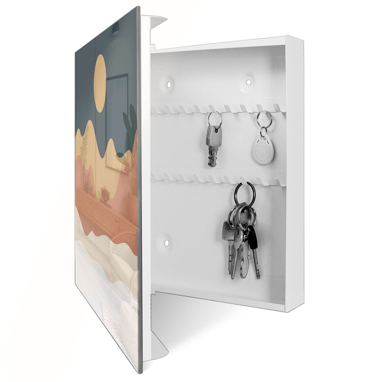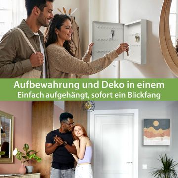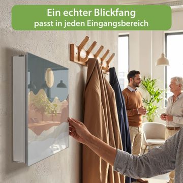 Bringe Ordnung und Eleganz in deinen Eingangsbereich mit dem banjado Schlüsselkasten Motiv Motiv Abstrakte Wüstenlandschaft. Die moderne Schlüsselbox kombiniert funktionales Design mit hochwertiger Verarbeitung und wird so zu einem echten Hingucker in Flur, Büro oder Ferienwohnung. ✅ Stilvolle Schlüsselaufbewahrung mit Glasfront im Motiv Motiv Abstrakte Wüstenlandschaft Der Design-Schlüsselkasten Motiv Motiv Abstrakte Wüstenlandschaft bietet Platz für bis zu 50 Schlüssel, die auf 5 stabilen Reihen mit je 10 Haken übersichtlich verstaut werden. Mit seinen kompakten Maßen von 30 x 30 x 5 cm passt die Schlüsselbox perfekt auch in kleinere Räume. Der weiß lackierte Stahlkorpus mit rechts angeschlagenem Türscharnier harmoniert mit der Glasfront und fügt sich nahtlos in jedes Wohnambiente ein. Ob als Schlüsselorganizer für Zuhause oder als praktische Lösung für Büros, Praxen und Gewerbe, der banjado Schlüsselkasten sorgt für Ordnung und Übersicht. Dank der magnetischen, mit Kreidestiften beschreibbaren Glasfront kannst du Notizen anheften oder Termine direkt auf der Oberfläche festhalten. Die Schlüsselbox Motiv Motiv Abstrakte Wüstenlandschaft zur Wandmontage wird inklusive Befestigungsmaterial geliefert und ist schnell angebracht. So hast du deine Schlüssel jederzeit griffbereit und zugleich stilvoll verstaut. Mit diesem banjado Schlüsselkasten Motiv Motiv Abstrakte Wüstenlandschaft kombinierst du praktische Aufbewahrung mit stilvollem Wohndesign. Ob privat oder geschäftlich, die Schlüsselbox sorgt für mehr Ordnung, Übersicht und ein wohnliches Ambiente.Vorteile im Überblick