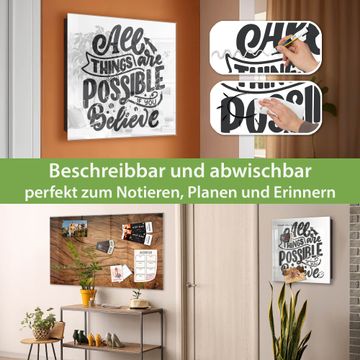 Bringe Ordnung und Eleganz in deinen Eingangsbereich mit dem banjado Schlüsselkasten Motiv Motiv All Things are possible 2. Die moderne Schlüsselbox kombiniert funktionales Design mit hochwertiger Verarbeitung und wird so zu einem echten Hingucker in Flur, Büro oder Ferienwohnung. ✅ Stilvolle Schlüsselaufbewahrung mit Glasfront im Motiv Motiv All Things are possible 2 Der Design-Schlüsselkasten Motiv Motiv All Things are possible 2 bietet Platz für bis zu 50 Schlüssel, die auf 5 stabilen Reihen mit je 10 Haken übersichtlich verstaut werden. Mit seinen kompakten Maßen von 30 x 30 x 5 cm passt die Schlüsselbox perfekt auch in kleinere Räume. Der schwarz lackierte Stahlkorpus mit rechts angeschlagenem Türscharnier harmoniert mit der Glasfront und fügt sich nahtlos in jedes Wohnambiente ein. Ob als Schlüsselorganizer für Zuhause oder als praktische Lösung für Büros, Praxen und Gewerbe, der banjado Schlüsselkasten sorgt für Ordnung und Übersicht. Dank der magnetischen, mit Kreidestiften beschreibbaren Glasfront kannst du Notizen anheften oder Termine direkt auf der Oberfläche festhalten. Die Schlüsselbox Motiv Motiv All Things are possible 2 zur Wandmontage wird inklusive Befestigungsmaterial geliefert und ist schnell angebracht. So hast du deine Schlüssel jederzeit griffbereit und zugleich stilvoll verstaut. Mit diesem banjado Schlüsselkasten Motiv Motiv All Things are possible 2 kombinierst du praktische Aufbewahrung mit stilvollem Wohndesign. Ob privat oder geschäftlich, die Schlüsselbox sorgt für mehr Ordnung, Übersicht und ein wohnliches Ambiente.Vorteile im Überblick