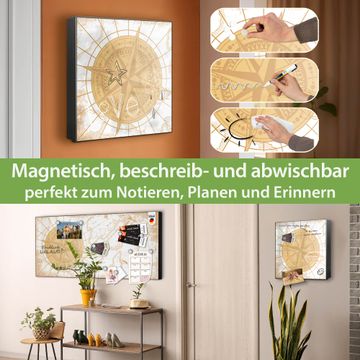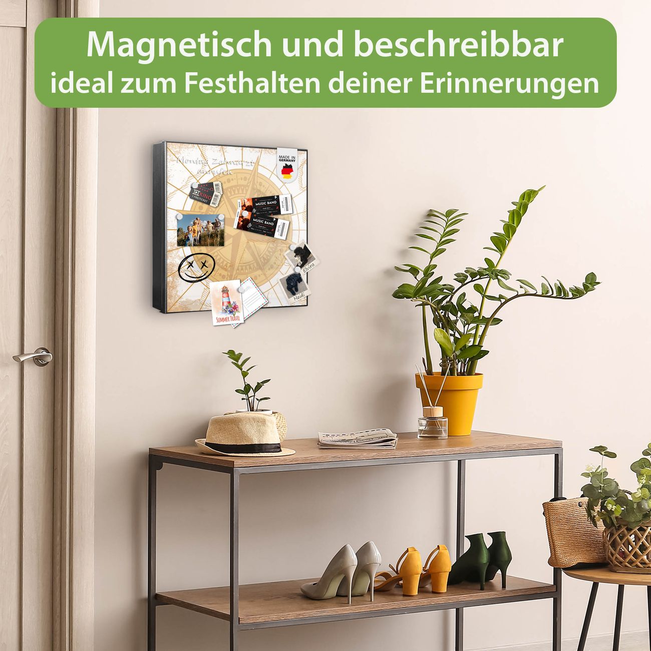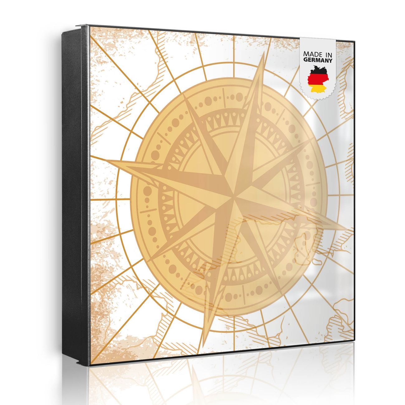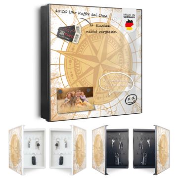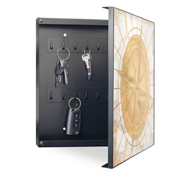 Bringe Ordnung und Eleganz in deinen Eingangsbereich mit dem banjado Schlüsselkasten Motiv Motiv Antike Kompassrose. Die moderne Schlüsselbox kombiniert funktionales Design mit hochwertiger Verarbeitung und wird so zu einem echten Hingucker in Flur, Büro oder Ferienwohnung. ✅ Stilvolle Schlüsselaufbewahrung mit Motiv Motiv Antike Kompassrose Der Design-Schlüsselkasten Motiv Motiv Antike Kompassrose bietet Platz für bis zu 32 Schlüssel, die auf 4 stabilen Reihen mit je 8 Haken übersichtlich verstaut werden. Mit seinen kompakten Maßen von 30 x 30 x 5 cm passt die Schlüsselbox perfekt auch in kleinere Räume. Der schwarz lackierte Stahlkorpus mit rechts angeschlagenem Türscharnier harmoniert mit gedruckten Folie auf der Front und fügt sich nahtlos in jedes Wohnambiente ein. Ob als Schlüsselorganizer für Zuhause oder als praktische Lösung für Büros, Praxen und Gewerbe, der banjado Schlüsselkasten sorgt für Ordnung und Übersicht. Dank der magnetischen, mit Kreidestiften beschreibbaren Folie auf der Front kannst du Notizen anheften oder Termine direkt auf der Oberfläche festhalten. Die Schlüsselbox Motiv Motiv Antike Kompassrose zur Wandmontage wird inklusive Befestigungsmaterial geliefert und ist schnell angebracht. So hast du deine Schlüssel jederzeit griffbereit und zugleich stilvoll verstaut. Mit diesem banjado Schlüsselkasten Motiv Motiv Antike Kompassrose kombinierst du praktische Aufbewahrung mit stilvollem Wohndesign. Ob privat oder geschäftlich, die Schlüsselbox sorgt für mehr Ordnung, Übersicht und ein wohnliches Ambiente.Vorteile im Überblick