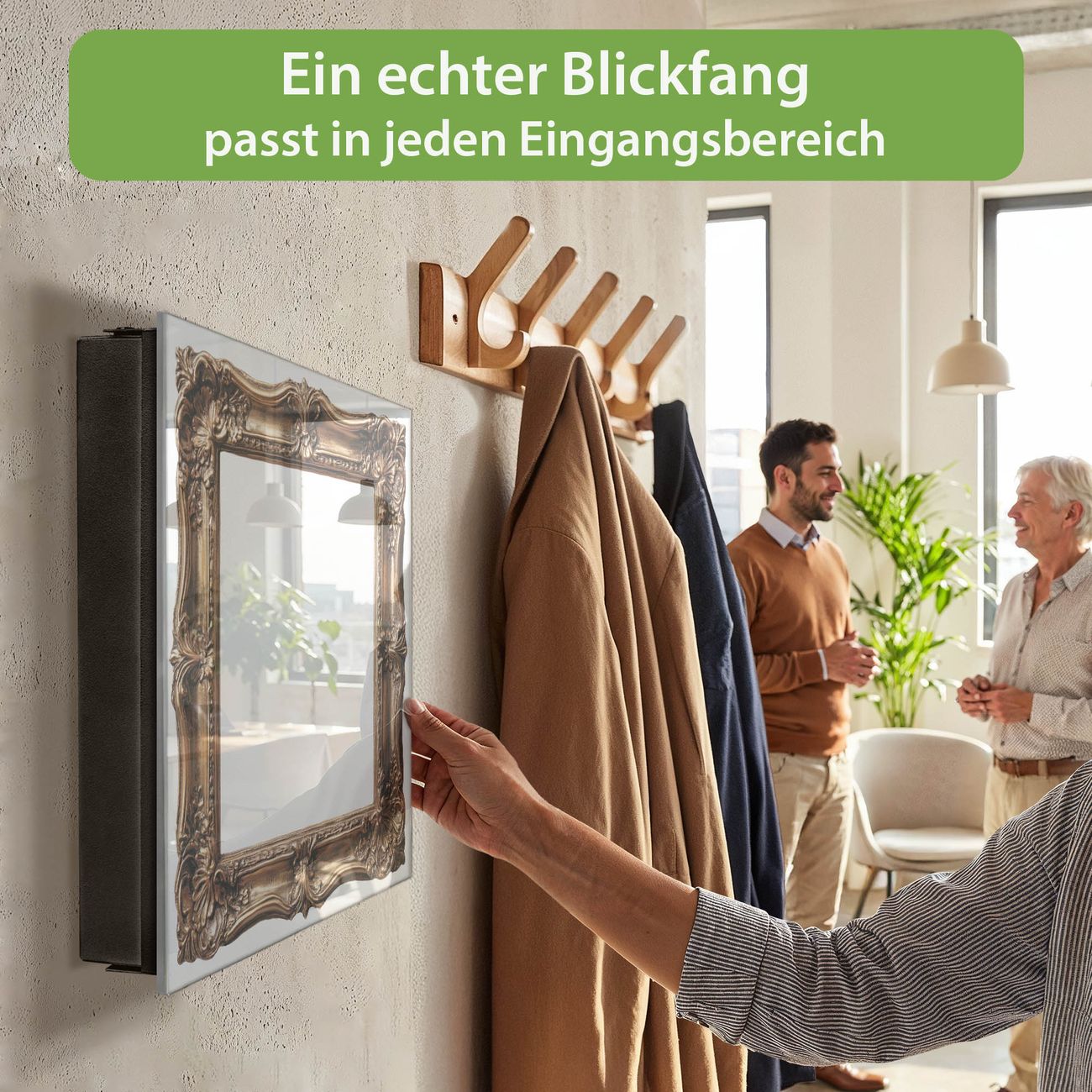 Bringe Ordnung und Eleganz in deinen Eingangsbereich mit dem banjado Schlüsselkasten Motiv Motiv Antiker Bilderrahmen 2. Die moderne Schlüsselbox kombiniert funktionales Design mit hochwertiger Verarbeitung und wird so zu einem echten Hingucker in Flur, Büro oder Ferienwohnung. ✅ Stilvolle Schlüsselaufbewahrung mit Glasfront im Motiv Motiv Antiker Bilderrahmen 2 Der Design-Schlüsselkasten Motiv Motiv Antiker Bilderrahmen 2 bietet Platz für bis zu 50 Schlüssel, die auf 5 stabilen Reihen mit je 10 Haken übersichtlich verstaut werden. Mit seinen kompakten Maßen von 30 x 30 x 5 cm passt die Schlüsselbox perfekt auch in kleinere Räume. Der schwarz lackierte Stahlkorpus mit rechts angeschlagenem Türscharnier harmoniert mit der Glasfront und fügt sich nahtlos in jedes Wohnambiente ein. Ob als Schlüsselorganizer für Zuhause oder als praktische Lösung für Büros, Praxen und Gewerbe, der banjado Schlüsselkasten sorgt für Ordnung und Übersicht. Dank der magnetischen, mit Kreidestiften beschreibbaren Glasfront kannst du Notizen anheften oder Termine direkt auf der Oberfläche festhalten. Die Schlüsselbox Motiv Motiv Antiker Bilderrahmen 2 zur Wandmontage wird inklusive Befestigungsmaterial geliefert und ist schnell angebracht. So hast du deine Schlüssel jederzeit griffbereit und zugleich stilvoll verstaut. Mit diesem banjado Schlüsselkasten Motiv Motiv Antiker Bilderrahmen 2 kombinierst du praktische Aufbewahrung mit stilvollem Wohndesign. Ob privat oder geschäftlich, die Schlüsselbox sorgt für mehr Ordnung, Übersicht und ein wohnliches Ambiente.Vorteile im Überblick