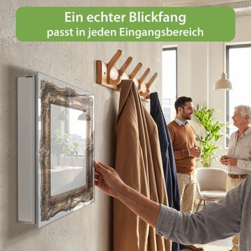 Bringe Ordnung und Eleganz in deinen Eingangsbereich mit dem banjado Schlüsselkasten Motiv Motiv Antiker Bilderrahmen 2. Die moderne Schlüsselbox kombiniert funktionales Design mit hochwertiger Verarbeitung und wird so zu einem echten Hingucker in Flur, Büro oder Ferienwohnung. ✅ Stilvolle Schlüsselaufbewahrung mit Glasfront im Motiv Motiv Antiker Bilderrahmen 2 Der Design-Schlüsselkasten Motiv Motiv Antiker Bilderrahmen 2 bietet Platz für bis zu 50 Schlüssel, die auf 5 stabilen Reihen mit je 10 Haken übersichtlich verstaut werden. Mit seinen kompakten Maßen von 30 x 30 x 5 cm passt die Schlüsselbox perfekt auch in kleinere Räume. Der weiß lackierte Stahlkorpus mit rechts angeschlagenem Türscharnier harmoniert mit der Glasfront und fügt sich nahtlos in jedes Wohnambiente ein. Ob als Schlüsselorganizer für Zuhause oder als praktische Lösung für Büros, Praxen und Gewerbe, der banjado Schlüsselkasten sorgt für Ordnung und Übersicht. Dank der magnetischen, mit Kreidestiften beschreibbaren Glasfront kannst du Notizen anheften oder Termine direkt auf der Oberfläche festhalten. Die Schlüsselbox Motiv Motiv Antiker Bilderrahmen 2 zur Wandmontage wird inklusive Befestigungsmaterial geliefert und ist schnell angebracht. So hast du deine Schlüssel jederzeit griffbereit und zugleich stilvoll verstaut. Mit diesem banjado Schlüsselkasten Motiv Motiv Antiker Bilderrahmen 2 kombinierst du praktische Aufbewahrung mit stilvollem Wohndesign. Ob privat oder geschäftlich, die Schlüsselbox sorgt für mehr Ordnung, Übersicht und ein wohnliches Ambiente.Vorteile im Überblick