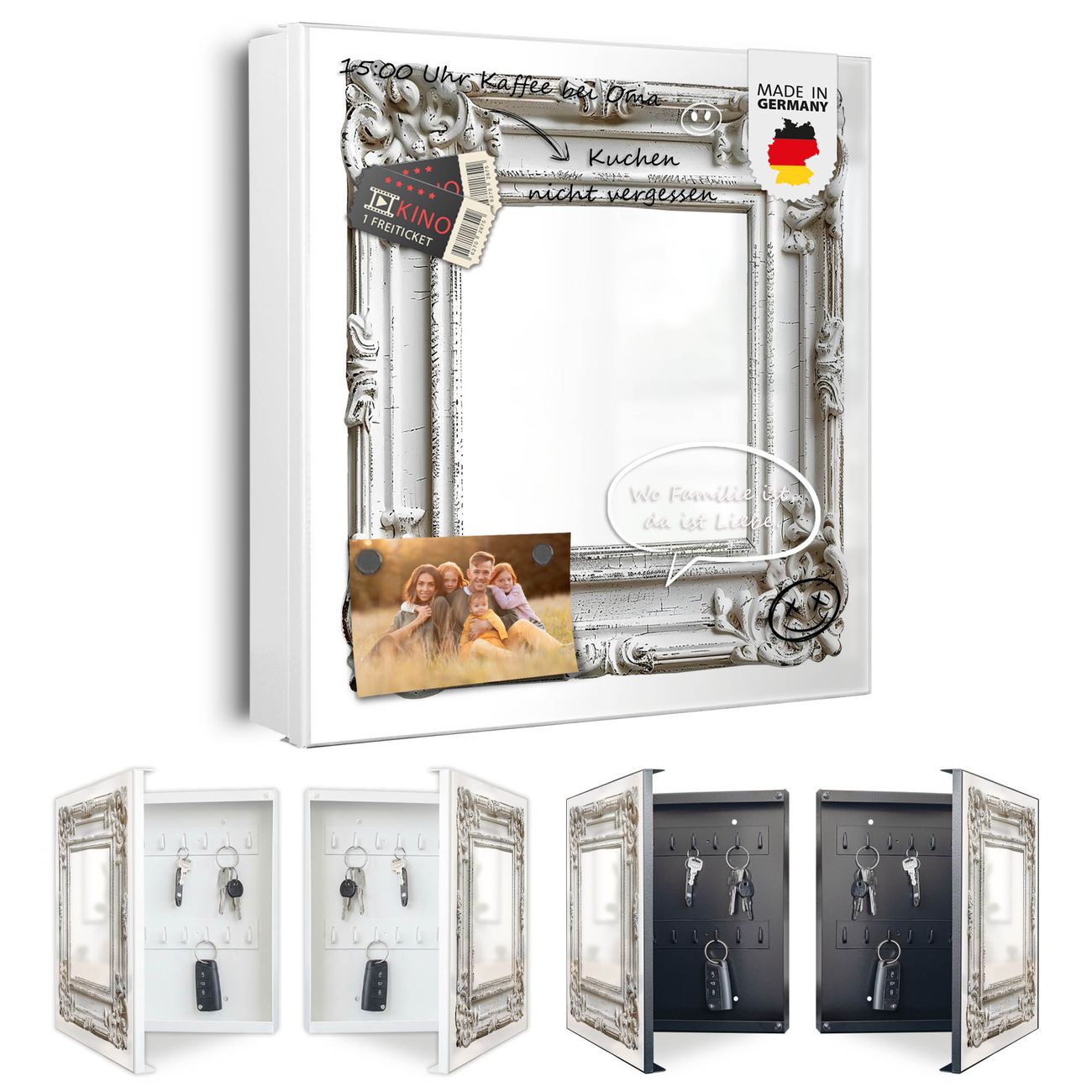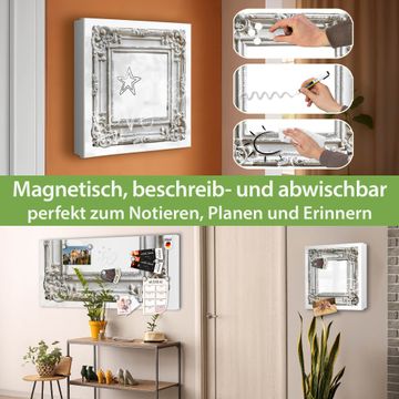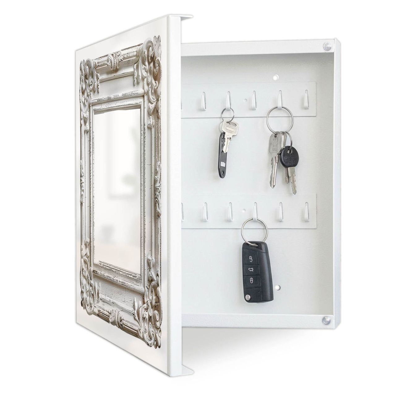 Bringe Ordnung und Eleganz in deinen Eingangsbereich mit dem banjado Schlüsselkasten Motiv Motiv Antiker Bilderrahmen. Die moderne Schlüsselbox kombiniert funktionales Design mit hochwertiger Verarbeitung und wird so zu einem echten Hingucker in Flur, Büro oder Ferienwohnung. ✅ Stilvolle Schlüsselaufbewahrung mit Motiv Motiv Antiker Bilderrahmen Der Design-Schlüsselkasten Motiv Motiv Antiker Bilderrahmen bietet Platz für bis zu 32 Schlüssel, die auf 4 stabilen Reihen mit je 8 Haken übersichtlich verstaut werden. Mit seinen kompakten Maßen von 30 x 30 x 5 cm passt die Schlüsselbox perfekt auch in kleinere Räume. Der weiß lackierte Stahlkorpus mit links angeschlagenem Türscharnier harmoniert mit gedruckten Folie auf der Front und fügt sich nahtlos in jedes Wohnambiente ein. Ob als Schlüsselorganizer für Zuhause oder als praktische Lösung für Büros, Praxen und Gewerbe, der banjado Schlüsselkasten sorgt für Ordnung und Übersicht. Dank der magnetischen, mit Kreidestiften beschreibbaren Folie auf der Front kannst du Notizen anheften oder Termine direkt auf der Oberfläche festhalten. Die Schlüsselbox Motiv Motiv Antiker Bilderrahmen zur Wandmontage wird inklusive Befestigungsmaterial geliefert und ist schnell angebracht. So hast du deine Schlüssel jederzeit griffbereit und zugleich stilvoll verstaut. Mit diesem banjado Schlüsselkasten Motiv Motiv Antiker Bilderrahmen kombinierst du praktische Aufbewahrung mit stilvollem Wohndesign. Ob privat oder geschäftlich, die Schlüsselbox sorgt für mehr Ordnung, Übersicht und ein wohnliches Ambiente.Vorteile im Überblick
