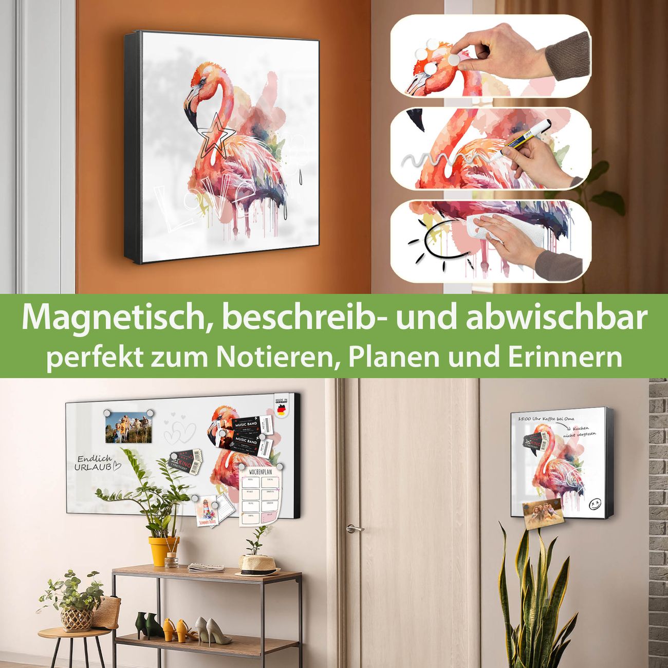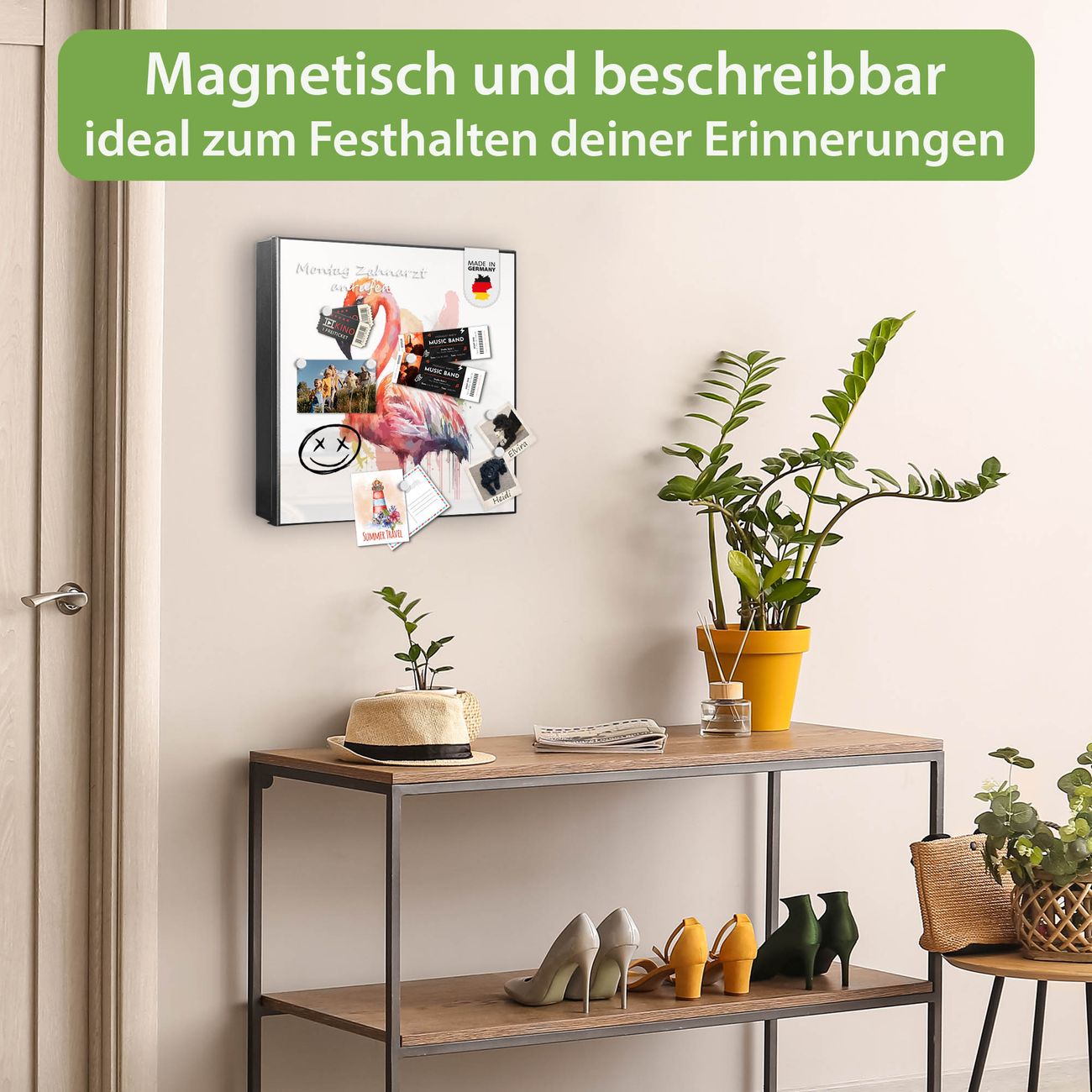 Bringe Ordnung und Eleganz in deinen Eingangsbereich mit dem banjado Schlüsselkasten Motiv Motiv Aquarell-Flamingo. Die moderne Schlüsselbox kombiniert funktionales Design mit hochwertiger Verarbeitung und wird so zu einem echten Hingucker in Flur, Büro oder Ferienwohnung. ✅ Stilvolle Schlüsselaufbewahrung mit Motiv Motiv Aquarell-Flamingo Der Design-Schlüsselkasten Motiv Motiv Aquarell-Flamingo bietet Platz für bis zu 32 Schlüssel, die auf 4 stabilen Reihen mit je 8 Haken übersichtlich verstaut werden. Mit seinen kompakten Maßen von 30 x 30 x 5 cm passt die Schlüsselbox perfekt auch in kleinere Räume. Der schwarz lackierte Stahlkorpus mit rechts angeschlagenem Türscharnier harmoniert mit gedruckten Folie auf der Front und fügt sich nahtlos in jedes Wohnambiente ein. Ob als Schlüsselorganizer für Zuhause oder als praktische Lösung für Büros, Praxen und Gewerbe, der banjado Schlüsselkasten sorgt für Ordnung und Übersicht. Dank der magnetischen, mit Kreidestiften beschreibbaren Folie auf der Front kannst du Notizen anheften oder Termine direkt auf der Oberfläche festhalten. Die Schlüsselbox Motiv Motiv Aquarell-Flamingo zur Wandmontage wird inklusive Befestigungsmaterial geliefert und ist schnell angebracht. So hast du deine Schlüssel jederzeit griffbereit und zugleich stilvoll verstaut. Mit diesem banjado Schlüsselkasten Motiv Motiv Aquarell-Flamingo kombinierst du praktische Aufbewahrung mit stilvollem Wohndesign. Ob privat oder geschäftlich, die Schlüsselbox sorgt für mehr Ordnung, Übersicht und ein wohnliches Ambiente.Vorteile im Überblick