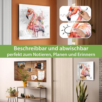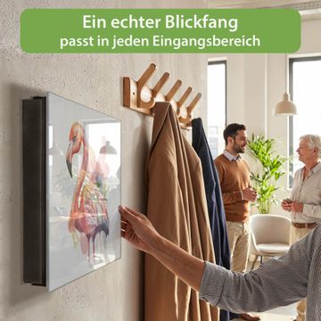 Bringe Ordnung und Eleganz in deinen Eingangsbereich mit dem banjado Schlüsselkasten Motiv Motiv Aquarell-Flamingo. Die moderne Schlüsselbox kombiniert funktionales Design mit hochwertiger Verarbeitung und wird so zu einem echten Hingucker in Flur, Büro oder Ferienwohnung. ✅ Stilvolle Schlüsselaufbewahrung mit Glasfront im Motiv Motiv Aquarell-Flamingo Der Design-Schlüsselkasten Motiv Motiv Aquarell-Flamingo bietet Platz für bis zu 50 Schlüssel, die auf 5 stabilen Reihen mit je 10 Haken übersichtlich verstaut werden. Mit seinen kompakten Maßen von 30 x 30 x 5 cm passt die Schlüsselbox perfekt auch in kleinere Räume. Der schwarz lackierte Stahlkorpus mit rechts angeschlagenem Türscharnier harmoniert mit der Glasfront und fügt sich nahtlos in jedes Wohnambiente ein. Ob als Schlüsselorganizer für Zuhause oder als praktische Lösung für Büros, Praxen und Gewerbe, der banjado Schlüsselkasten sorgt für Ordnung und Übersicht. Dank der magnetischen, mit Kreidestiften beschreibbaren Glasfront kannst du Notizen anheften oder Termine direkt auf der Oberfläche festhalten. Die Schlüsselbox Motiv Motiv Aquarell-Flamingo zur Wandmontage wird inklusive Befestigungsmaterial geliefert und ist schnell angebracht. So hast du deine Schlüssel jederzeit griffbereit und zugleich stilvoll verstaut. Mit diesem banjado Schlüsselkasten Motiv Motiv Aquarell-Flamingo kombinierst du praktische Aufbewahrung mit stilvollem Wohndesign. Ob privat oder geschäftlich, die Schlüsselbox sorgt für mehr Ordnung, Übersicht und ein wohnliches Ambiente.Vorteile im Überblick