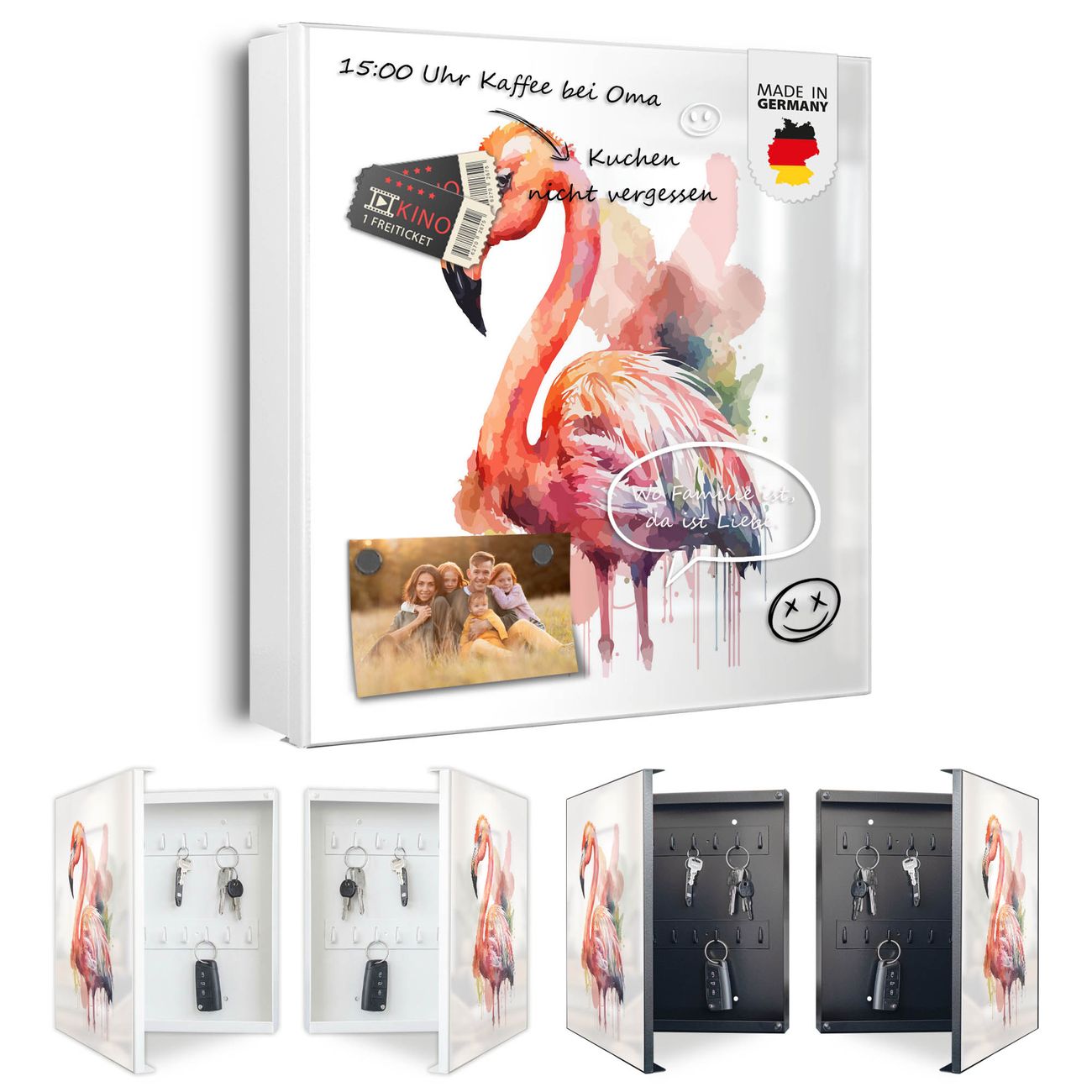 Bringe Ordnung und Eleganz in deinen Eingangsbereich mit dem banjado Schlüsselkasten Motiv Motiv Aquarell-Flamingo. Die moderne Schlüsselbox kombiniert funktionales Design mit hochwertiger Verarbeitung und wird so zu einem echten Hingucker in Flur, Büro oder Ferienwohnung. ✅ Stilvolle Schlüsselaufbewahrung mit Motiv Motiv Aquarell-Flamingo Der Design-Schlüsselkasten Motiv Motiv Aquarell-Flamingo bietet Platz für bis zu 32 Schlüssel, die auf 4 stabilen Reihen mit je 8 Haken übersichtlich verstaut werden. Mit seinen kompakten Maßen von 30 x 30 x 5 cm passt die Schlüsselbox perfekt auch in kleinere Räume. Der weiß lackierte Stahlkorpus mit rechts angeschlagenem Türscharnier harmoniert mit gedruckten Folie auf der Front und fügt sich nahtlos in jedes Wohnambiente ein. Ob als Schlüsselorganizer für Zuhause oder als praktische Lösung für Büros, Praxen und Gewerbe, der banjado Schlüsselkasten sorgt für Ordnung und Übersicht. Dank der magnetischen, mit Kreidestiften beschreibbaren Folie auf der Front kannst du Notizen anheften oder Termine direkt auf der Oberfläche festhalten. Die Schlüsselbox Motiv Motiv Aquarell-Flamingo zur Wandmontage wird inklusive Befestigungsmaterial geliefert und ist schnell angebracht. So hast du deine Schlüssel jederzeit griffbereit und zugleich stilvoll verstaut. Mit diesem banjado Schlüsselkasten Motiv Motiv Aquarell-Flamingo kombinierst du praktische Aufbewahrung mit stilvollem Wohndesign. Ob privat oder geschäftlich, die Schlüsselbox sorgt für mehr Ordnung, Übersicht und ein wohnliches Ambiente.Vorteile im Überblick