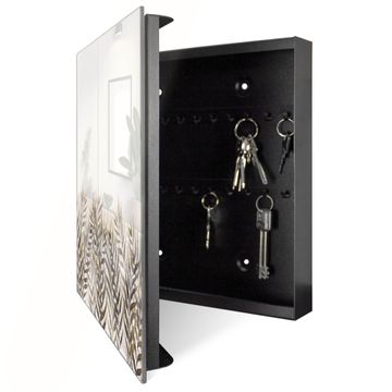 Bringe Ordnung und Eleganz in deinen Eingangsbereich mit dem banjado Schlüsselkasten Motiv Motiv Aquarell Palmblätter. Die moderne Schlüsselbox kombiniert funktionales Design mit hochwertiger Verarbeitung und wird so zu einem echten Hingucker in Flur, Büro oder Ferienwohnung. ✅ Stilvolle Schlüsselaufbewahrung mit Glasfront im Motiv Motiv Aquarell Palmblätter Der Design-Schlüsselkasten Motiv Motiv Aquarell Palmblätter bietet Platz für bis zu 50 Schlüssel, die auf 5 stabilen Reihen mit je 10 Haken übersichtlich verstaut werden. Mit seinen kompakten Maßen von 30 x 30 x 5 cm passt die Schlüsselbox perfekt auch in kleinere Räume. Der schwarz lackierte Stahlkorpus mit rechts angeschlagenem Türscharnier harmoniert mit der Glasfront und fügt sich nahtlos in jedes Wohnambiente ein. Ob als Schlüsselorganizer für Zuhause oder als praktische Lösung für Büros, Praxen und Gewerbe, der banjado Schlüsselkasten sorgt für Ordnung und Übersicht. Dank der magnetischen, mit Kreidestiften beschreibbaren Glasfront kannst du Notizen anheften oder Termine direkt auf der Oberfläche festhalten. Die Schlüsselbox Motiv Motiv Aquarell Palmblätter zur Wandmontage wird inklusive Befestigungsmaterial geliefert und ist schnell angebracht. So hast du deine Schlüssel jederzeit griffbereit und zugleich stilvoll verstaut. Mit diesem banjado Schlüsselkasten Motiv Motiv Aquarell Palmblätter kombinierst du praktische Aufbewahrung mit stilvollem Wohndesign. Ob privat oder geschäftlich, die Schlüsselbox sorgt für mehr Ordnung, Übersicht und ein wohnliches Ambiente.Vorteile im Überblick