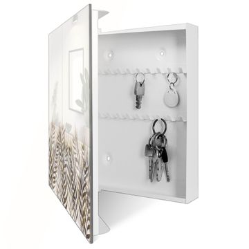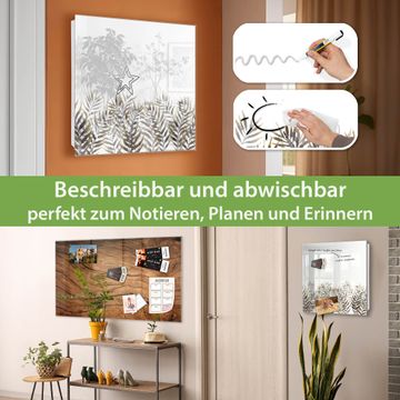 Bringe Ordnung und Eleganz in deinen Eingangsbereich mit dem banjado Schlüsselkasten Motiv Motiv Aquarell Palmblätter. Die moderne Schlüsselbox kombiniert funktionales Design mit hochwertiger Verarbeitung und wird so zu einem echten Hingucker in Flur, Büro oder Ferienwohnung. ✅ Stilvolle Schlüsselaufbewahrung mit Glasfront im Motiv Motiv Aquarell Palmblätter Der Design-Schlüsselkasten Motiv Motiv Aquarell Palmblätter bietet Platz für bis zu 50 Schlüssel, die auf 5 stabilen Reihen mit je 10 Haken übersichtlich verstaut werden. Mit seinen kompakten Maßen von 30 x 30 x 5 cm passt die Schlüsselbox perfekt auch in kleinere Räume. Der weiß lackierte Stahlkorpus mit rechts angeschlagenem Türscharnier harmoniert mit der Glasfront und fügt sich nahtlos in jedes Wohnambiente ein. Ob als Schlüsselorganizer für Zuhause oder als praktische Lösung für Büros, Praxen und Gewerbe, der banjado Schlüsselkasten sorgt für Ordnung und Übersicht. Dank der magnetischen, mit Kreidestiften beschreibbaren Glasfront kannst du Notizen anheften oder Termine direkt auf der Oberfläche festhalten. Die Schlüsselbox Motiv Motiv Aquarell Palmblätter zur Wandmontage wird inklusive Befestigungsmaterial geliefert und ist schnell angebracht. So hast du deine Schlüssel jederzeit griffbereit und zugleich stilvoll verstaut. Mit diesem banjado Schlüsselkasten Motiv Motiv Aquarell Palmblätter kombinierst du praktische Aufbewahrung mit stilvollem Wohndesign. Ob privat oder geschäftlich, die Schlüsselbox sorgt für mehr Ordnung, Übersicht und ein wohnliches Ambiente.Vorteile im Überblick