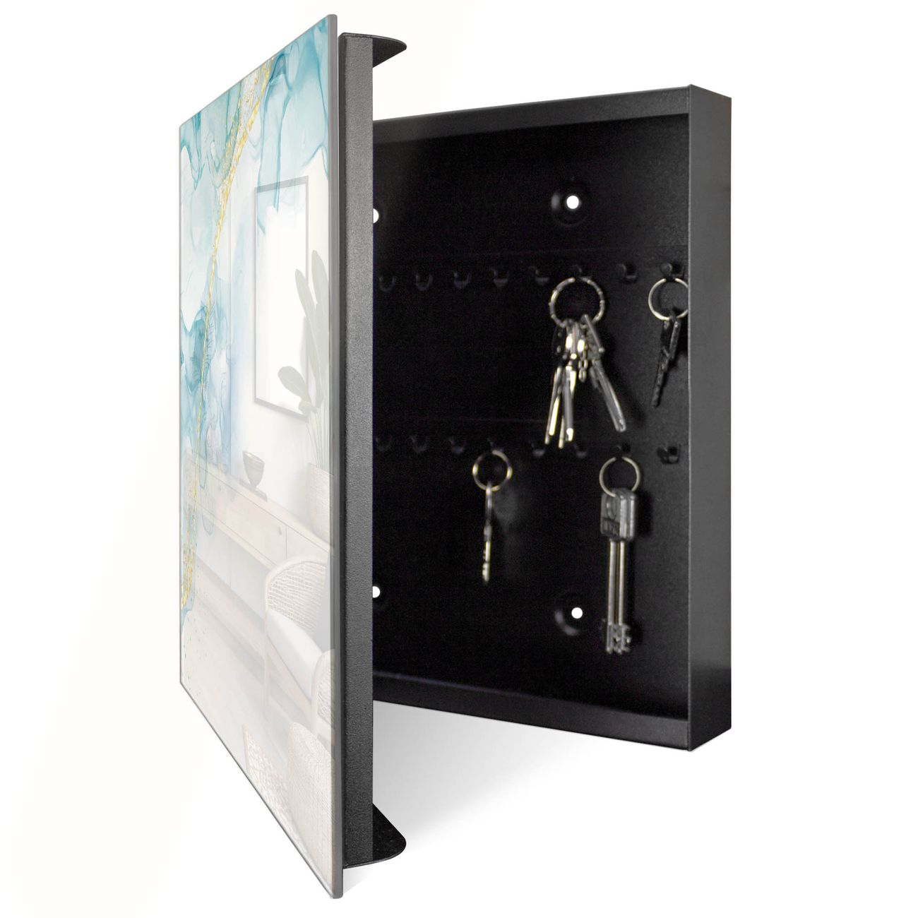 Bringe Ordnung und Eleganz in deinen Eingangsbereich mit dem banjado Schlüsselkasten Motiv Motiv Aquarellfluss. Die moderne Schlüsselbox kombiniert funktionales Design mit hochwertiger Verarbeitung und wird so zu einem echten Hingucker in Flur, Büro oder Ferienwohnung. ✅ Stilvolle Schlüsselaufbewahrung mit Glasfront im Motiv Motiv Aquarellfluss Der Design-Schlüsselkasten Motiv Motiv Aquarellfluss bietet Platz für bis zu 50 Schlüssel, die auf 5 stabilen Reihen mit je 10 Haken übersichtlich verstaut werden. Mit seinen kompakten Maßen von 30 x 30 x 5 cm passt die Schlüsselbox perfekt auch in kleinere Räume. Der schwarz lackierte Stahlkorpus mit rechts angeschlagenem Türscharnier harmoniert mit der Glasfront und fügt sich nahtlos in jedes Wohnambiente ein. Ob als Schlüsselorganizer für Zuhause oder als praktische Lösung für Büros, Praxen und Gewerbe, der banjado Schlüsselkasten sorgt für Ordnung und Übersicht. Dank der magnetischen, mit Kreidestiften beschreibbaren Glasfront kannst du Notizen anheften oder Termine direkt auf der Oberfläche festhalten. Die Schlüsselbox Motiv Motiv Aquarellfluss zur Wandmontage wird inklusive Befestigungsmaterial geliefert und ist schnell angebracht. So hast du deine Schlüssel jederzeit griffbereit und zugleich stilvoll verstaut. Mit diesem banjado Schlüsselkasten Motiv Motiv Aquarellfluss kombinierst du praktische Aufbewahrung mit stilvollem Wohndesign. Ob privat oder geschäftlich, die Schlüsselbox sorgt für mehr Ordnung, Übersicht und ein wohnliches Ambiente.Vorteile im Überblick