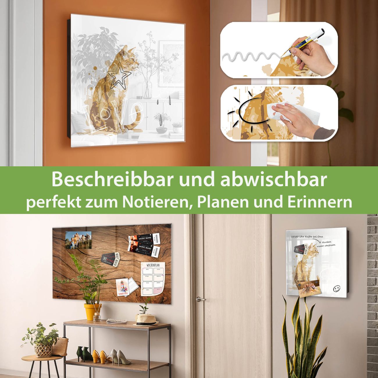 Bringe Ordnung und Eleganz in deinen Eingangsbereich mit dem banjado Schlüsselkasten Motiv Motiv Aquarellkatze 3. Die moderne Schlüsselbox kombiniert funktionales Design mit hochwertiger Verarbeitung und wird so zu einem echten Hingucker in Flur, Büro oder Ferienwohnung. ✅ Stilvolle Schlüsselaufbewahrung mit Glasfront im Motiv Motiv Aquarellkatze 3 Der Design-Schlüsselkasten Motiv Motiv Aquarellkatze 3 bietet Platz für bis zu 50 Schlüssel, die auf 5 stabilen Reihen mit je 10 Haken übersichtlich verstaut werden. Mit seinen kompakten Maßen von 30 x 30 x 5 cm passt die Schlüsselbox perfekt auch in kleinere Räume. Der schwarz lackierte Stahlkorpus mit rechts angeschlagenem Türscharnier harmoniert mit der Glasfront und fügt sich nahtlos in jedes Wohnambiente ein. Ob als Schlüsselorganizer für Zuhause oder als praktische Lösung für Büros, Praxen und Gewerbe, der banjado Schlüsselkasten sorgt für Ordnung und Übersicht. Dank der magnetischen, mit Kreidestiften beschreibbaren Glasfront kannst du Notizen anheften oder Termine direkt auf der Oberfläche festhalten. Die Schlüsselbox Motiv Motiv Aquarellkatze 3 zur Wandmontage wird inklusive Befestigungsmaterial geliefert und ist schnell angebracht. So hast du deine Schlüssel jederzeit griffbereit und zugleich stilvoll verstaut. Mit diesem banjado Schlüsselkasten Motiv Motiv Aquarellkatze 3 kombinierst du praktische Aufbewahrung mit stilvollem Wohndesign. Ob privat oder geschäftlich, die Schlüsselbox sorgt für mehr Ordnung, Übersicht und ein wohnliches Ambiente.Vorteile im Überblick